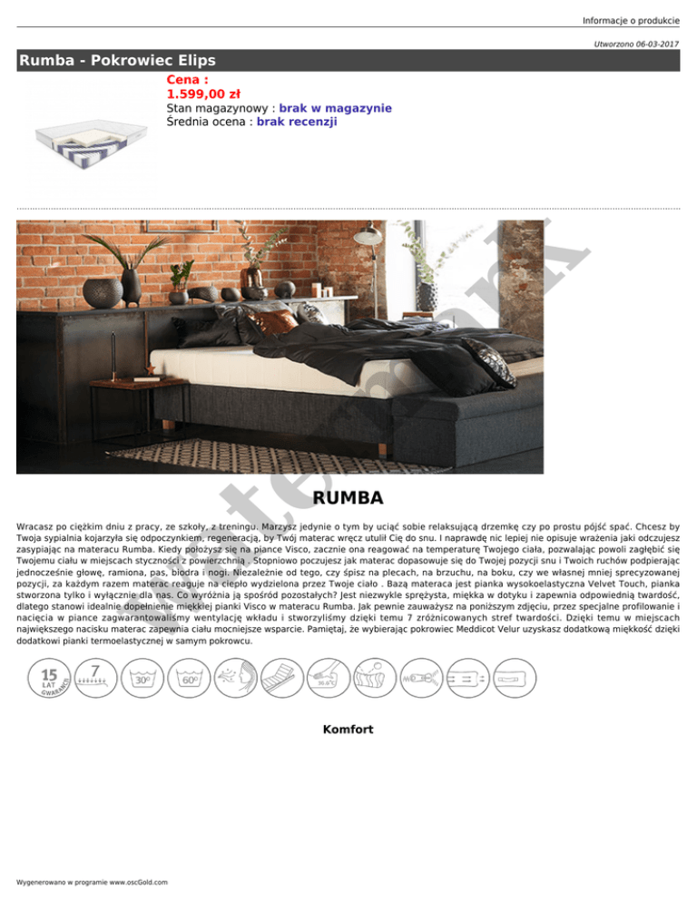 Informacje o produkcie Utworzono 06-03-2017 Rumba - Pokrowiec Elips Cena : 1.599,00 zł er m ar k Stan magazynowy : brak w magazynie Średnia ocena : brak recenzji at RUMBA w Wracasz po ciężkim dniu z pracy, ze szkoły, z treningu. Marzysz jedynie o tym by uciąć sobie relaksującą drzemkę czy po prostu pójść spać. Chcesz by Twoja sypialnia kojarzyła się odpoczynkiem, regeneracją, by Twój materac wręcz utulił Cię do snu. I naprawdę nic lepiej nie opisuje wrażenia jaki odczujesz zasypiając na materacu Rumba. Kiedy położysz się na piance Visco, zacznie ona reagować na temperaturę Twojego ciała, pozwalając powoli zagłębić się Twojemu ciału w miejscach styczności z powierzchnią . Stopniowo poczujesz jak materac dopasowuje się do Twojej pozycji snu i Twoich ruchów podpierając jednocześnie głowę, ramiona, pas, biodra i nogi. Niezależnie od tego, czy śpisz na plecach, na brzuchu, na boku, czy we własnej mniej sprecyzowanej pozycji, za każdym razem materac reaguje na ciepło wydzielona przez Twoje ciało . Bazą materaca jest pianka wysokoelastyczna Velvet Touch, pianka stworzona tylko i wyłącznie dla nas. Co wyróżnia ją spośród pozostałych? Jest niezwykle sprężysta, miękka w dotyku i zapewnia odpowiednią twardość, dlatego stanowi idealnie dopełnienie miękkiej pianki Visco w materacu Rumba. Jak pewnie zauważysz na poniższym zdjęciu, przez specjalne profilowanie i nacięcia w piance zagwarantowaliśmy wentylację wkładu i stworzyliśmy dzięki temu 7 zróżnicowanych stref twardości. Dzięki temu w miejscach największego nacisku materac zapewnia ciału mocniejsze wsparcie. Pamiętaj, że wybierając pokrowiec Meddicot Velur uzyskasz dodatkową miękkość dzięki dodatkowi pianki termoelastycznej w samym pokrowcu. Komfort Wygenerowano w programie www.oscGold.com er m ar k Dane techniczne Wkład: profilowana pianka wysokoelastyczna VelvetTouch o wys 12,5 cm, pianka termoelastyczna Visco o wys. 7 cm. Pokrowiec: Medicott Velur lub Elips Wysokość materaca: ok 22 cm Pokrowiec Elips – Pokrowiec wykonany z jedwabistej i miękkiej w dotyku dzianiny Elips. Gwarantuje wysoki stopień elastyczności, dzięki czemu każdorazowo dopasowuje się do ułożenia ciała na całej powierzchni materaca. Wysoka jakość i trwałość zapewnią komfortowy i głęboki sen przez długie lata. Pokrowiec łatwy w utrzymaniu czystości, dzięki możliwości prania w temp. 60°C. Dostępne opcje Rumba - Pokrowiec Elips » Rozmiar: 80x200, 90x200, 100x200 (+420,00 zł), 120x200 (+580,00 zł), 140x200 (+790,00 zł), 160x200 (+1.060,00 zł), 180x200 w at (+1.370,00 zł).