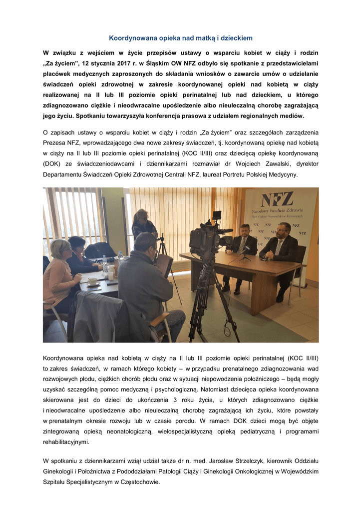 Koordynowana opieka nad matką i dzieckiem W związku z wejściem w życie przepisów ustawy o wsparciu kobiet w ciąży i rodzin „Za życiem”, 12 stycznia 2017 r. w Śląskim OW NFZ odbyło się spotkanie z przedstawicielami placówek medycznych zaproszonych do składania wniosków o zawarcie umów o udzielanie świadczeń opieki zdrowotnej w zakresie koordynowanej opieki nad kobietą w ciąży realizowanej na II lub III poziomie opieki perinatalnej lub nad dzieckiem, u którego zdiagnozowano ciężkie i nieodwracalne upośledzenie albo nieuleczalną chorobę zagrażającą jego życiu. Spotkaniu towarzyszyła konferencja prasowa z udziałem regionalnych mediów. O zapisach ustawy o wsparciu kobiet w ciąży i rodzin „Za życiem” oraz szczegółach zarządzenia Prezesa NFZ, wprowadzającego dwa nowe zakresy świadczeń, tj. koordynowaną opiekę nad kobietą w ciąży na II lub III poziomie opieki perinatalnej (KOC II/III) oraz dziecięcą opiekę koordynowaną (DOK) ze świadczeniodawcami i dziennikarzami rozmawiał dr Wojciech Zawalski, dyrektor Departamentu Świadczeń Opieki Zdrowotnej Centrali NFZ, laureat Portretu Polskiej Medycyny. Koordynowana opieka nad kobietą w ciąży na II lub III poziomie opieki perinatalnej (KOC II/III) to zakres świadczeń, w ramach którego kobiety – w przypadku prenatalnego zdiagnozowania wad rozwojowych płodu, ciężkich chorób płodu oraz w sytuacji niepowodzenia położniczego – będą mogły uzyskać szczególną pomoc medyczną i psychologiczną. Natomiast dziecięca opieka koordynowana skierowana jest do dzieci do ukończenia 3 roku życia, u których zdiagnozowano ciężkie i nieodwracalne upośledzenie albo nieuleczalną chorobę zagrażającą ich życiu, które powstały w prenatalnym okresie rozwoju lub w czasie porodu. W ramach DOK dzieci mogą być objęte zintegrowaną opieką neonatologiczną, wielospecjalistyczną opieką pediatryczną i programami rehabilitacyjnymi. W spotkaniu z dziennikarzami wziął udział także dr n. med. Jarosław Strzelczyk, kierownik Oddziału Ginekologii i Położnictwa z Pododdziałami Patologii Ciąży i Ginekologii Onkologicznej w Wojewódzkim Szpitalu Specjalistycznym w Częstochowie.