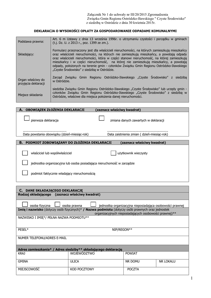 Załącznik Nr 1 do uchwały nr III/20/2015 Zgromadzenia Związku Gmin Regionu Ostródzko-Iławskiego " Czyste Środowisko" z siedzibą w Ostródzie z dnia 30 kwietnia 2015r. DEKLARACJA O WYSOKOŚCI OPŁATY ZA GOSPODAROWANIE ODPADAMI KOMUNALNYMI Podstawa prawna: Składający: Organ właściwy do przyjęcia deklaracji Miejsce składania Art. 6 m Ustawy z dnia 13 września 1996r. o utrzymaniu czystości i porządku w gminach (t.j. Dz. U. z 2013 r., poz. 1399 ze zm.). Formularz przeznaczony jest dla właścicieli nieruchomości, na których zamieszkują mieszkańcy oraz właścicieli nieruchomości, na których nie zamieszkują mieszkańcy, a powstają odpady oraz właścicieli nieruchomości, która w części stanowi nieruchomość, na której zamieszkują mieszkańcy i w części nieruchomość, na której nie zamieszkują mieszkańcy, a powstają odpady, położonych na terenie gmin - członków Związku Gmin Regionu Ostródzko-Iławskiego „Czyste Środowisko” z siedzibą w Ostródzie. Zarząd Związku Gmin Regionu Ostródzko-Iławskiego „Czyste Środowisko” z siedzibą w Ostródzie. siedziba Związku Gmin Regionu Ostródzko-Iławskiego „Czyste Środowisko” lub urzędy gmin członków Związku Gmin Regionu Ostródzko-Iławskiego „Czyste Środowisko” z siedzibą w Ostródzie, właściwe dla miejsca położenia danej nieruchomości. A. OBOWIĄZEK ZŁOŻENIA DEKLARACJI (zaznacz właściwy kwadrat) pierwsza deklaracja zmiana danych zawartych w deklaracji ............................................. Data powstania obowiązku (dzień-miesiąc-rok) ............................................................... Data zaistnienia zmian ( dzień-miesiąc-rok) B. PODMIOT ZOBOWIĄZANY DO ZŁOŻENIA DEKLARACJI właściciel lub współwłaściciel (zaznacz właściwy kwadrat) użytkownik wieczysty jednostka organizacyjna lub osoba posiadająca nieruchomość w zarządzie podmiot faktycznie władający nieruchomością C. DANE SKŁADAJĄCEGO DEKLARACJĘ Rodzaj składającego (zaznacz właściwy kwadrat) osoba fizyczna osoba prawna jednostka organizacyjna nieposiadająca osobowości prawnej Imię i nazwisko (dotyczy osób fizycznych)* / Nazwa podmiotu (dotyczy osób prawnych oraz jednostek organizacyjnych nieposiadających osobowości prawnej)** NAZWISKO I IMIĘ*/ PEŁNA NAZWA PODMIOTU** PESEL* NIP/REGON** NUMER TELEFONU/ADRES E-MAIL Adres zamieszkania* / Adres siedziby** składającego deklarację KRAJ WOJEWÓDZTWO POWIAT GMINA ULICA NR DOMU MIEJSCOWOŚĆ KOD POCZTOWY NR LOKALU POCZTA 1 Załącznik Nr 1 do uchwały nr III/20/2015 Zgromadzenia Związku Gmin Regionu Ostródzko-Iławskiego " Czyste Środowisko" z siedzibą w Ostródzie z dnia 30 kwietnia 2015r. D. ADRES NIERUCHOMOŚCI, NA KTÓREJ POWSTAJĄ ODPADY KOMUNALNE (wypełnić w przypadku, gdy adres nieruchomości, na której powstają odpady jest inny niż adres zamieszkania/siedziby MIEJSCOWOŚĆ ULICA NR DOMU KOD POCZTOWY POCZTA NR DZIAŁKI Nieruchomość wskazana w części C lub D jest: zamieszkała NR KSIĘGI WIECZYSTEJ ( zaznacz właściwy kwadrat) niezamieszkała Właściciel takiej nieruchomości wypełnia część E NR LOKALU Właściciel takiej nieruchomości wypełnia część F w części zamieszkała oraz w części niezamieszkała Właściciel takiej nieruchomości wypełnia części E,F i G Oświadczam, że na terenie nieruchomości wskazanej w części C lub D SELEKTYWNY NIESELEKTYWNY niniejszej deklaracji odpady zbierane i odbierane są w sposób (proszę zaznaczyć jeden właściwy kwadrat) E. WYLICZENIE MIESIĘCZNEJ OPŁATY ZA GOSPODAROWANIE ODPADAMI KOMUNALNYMI Oświadczam, że na terenie nieruchomości wskazanej w części C lub D niniejszej deklaracji zamieszkuje (proszę podać liczbę osób) ..................................... x .......................... (liczba osób) (stawka opłaty) = ........................osób .......................................................zł (iloczyn liczby osób i stawki opłaty) Wysokość miesięcznej opłaty za gospodarowanie odpadami komunalnymi wynosi: ................................................. zł Słownie: ............................................................................................................................................................zł Czy nieruchomość wskazana w części C lub D niniejszej deklaracji wyposażona jest w kompostownik? (w przypadku zaznaczenia pozycji „Tak”, proszę podać wielkość kompostownika w m3) F. Tak ........m3 Nie OŚWIADCZENIE WŁAŚCICIELA NIERUCHOMOŚCI, NA KTÓREJ NIE ZAMIESZKUJĄ MIESZKAŃCY, A POWSTAJĄ ODPADY KOMUNALNE. Rodzaj prowadzonej działalności:.............................................................................................. (PKD wiodące). (opisać prowadzoną działalność) Oświadczam, że na terenie nieruchomości wskazanej w części C lub D niniejszej deklaracji odpady komunalne gromadzone są w następujących pojemnikach: Typ pojemnika 1 sztuk pojemników 2 Liczba pojemników Stawka opłaty za Deklaruję do opróżnionych w jedno opróżnienie zapłaty za miesiąc: miesiącu pojemnika (iloczyn poz. 3x4) 3 4 5 080 litrów 110 litrów 120 litrów 240 litrów 660 litrów 770 litrów 1100 litrów 3000 litrów 4000 litrów 5000 litrów 7000 litrów 10000 litrów Suma do zapłaty za miesiąc: 2 Załącznik Nr 1 do uchwały nr III/20/2015 Zgromadzenia Związku Gmin Regionu Ostródzko-Iławskiego " Czyste Środowisko" z siedzibą w Ostródzie z dnia 30 kwietnia 2015r. G. OŚWIADCZENIE WŁAŚCICIELA NIERUCHOMOŚCI, NA KTÓREJ ZAMIESZKUJĄ MIESZKAŃCY I W CZĘŚCI NIERUCHOMOSCI, NA KTÓREJ NIE ZAMIESZKUJĄ MIESZKAŃCY, A POWSTAJĄ ODPADY Oświadczam, że na terenie nieruchomości wskazanej w części E lub F niniejszej deklaracji, wysokość opłaty miesięcznej za gospodarowanie odpadami komunalnymi, wynosi: .......................................+ ....................................= ..................................................................................