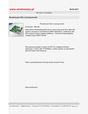 www.wirelesslan.pl 06-03-2017 Wycofane ze sprzedazy Routerboard 532 z licencja level4 Routerboard 532 z licencja level4 Producent : Mikrotik Plyta glowna RouterBoard532 jest to nowa propozycja firmy MikroTik, oparta o procesor w architekturze MIPS taktowanyz predkoscia 400 MHz stanowi bardzo wydajna platforme , znacznie przewyzszajaca osiagami plyty WRAP Geode. Plyta glowna posiada 2 zlacza miniPCI do instalacji modulow radiowych, 3 porty LAN 10/100Mbps, a takze zgodny ze standardem 802.3af Power Over Ethernet. Plyta z przeinstalowana licencja level4 (Access Point) Dane techniczne: www.wirelesslan.pl - [email protected] - Konsorcjum ATS, 26-600 Radom, ul. Zeromskiego 75, tel. (048) 383 00 30 Strona 1/5 www.wirelesslan.pl 06-03-2017 Procesor - MIPS 32 4Kc 400MHz (predkosc do ustawienia z poziomu BIOS'u urzadzenia w zakresie 200-400MHz) Pamiec - 32MB RAM Bios - RouterBOOT, 1Mbit Flash Dysk - 128MB wbudowanej pamieci NAND i dodatkowo interfejs CompactFlash typ I/II (z obsluga IBM/Hitachi Microdrive) www.wirelesslan.pl - [email protected] - Konsorcjum ATS, 26-600 Radom, ul. Zeromskiego 75, tel. (048) 383 00 30 Strona 2/5 www.wirelesslan.pl 06-03-2017 Porty LAN - jeden IDT Korina 10/100 Mbit/s Fast Ethernet z obsluga Auto-MDI/X, dwa VIA VT6105 10/100 Mbit/s Fast Ethernet z obsluga Auto-MDI/X Sloty miniPCI - dwa MiniPCI Typ IIIA/IIIB Mozliwosc rozbudowy - tak - poprzez dodatkowe karty rozszerzen Rodzaje kart rozszerzen- RouterBOARD 502 (Dodatkowe dwa sloty miniPCI) RouterBOARD 564 (Dodatkowe cztery sloty miniPCI i 6 interfejsow Ethernet 10/100) Port szeregowy - jeden DB9 RS232C, standardowo 115200bps 8N1 www.wirelesslan.pl - [email protected] - Konsorcjum ATS, 26-600 Radom, ul. Zeromskiego 75, tel. (048) 383 00 30 Strona 3/5 www.wirelesslan.pl 06-03-2017 Diody LED - 1x Zasilanie, 2x pary dla slotow miniPCI, 1x konfigurowalna dla uzytkownika Watchdog - Wbudowany wewnetrzny IDT SoC watchdog timer Zasilanie - IEEE802.3af Power Over Ethernet 12V lub 48V DC Gniazdo zasilajace na plycie 6..24V lub 25..56V DC (wybor zworkami) Pobor pradu - 2-3W sama plyta w stanie jalowym, Wymiary - 14.0 cm x 14.0 cm (5.51 in x 5.51 cali) Temperatura pracy- -20°C to +70°C www.wirelesslan.pl - [email protected] - Konsorcjum ATS, 26-600 Radom, ul. Zeromskiego 75, tel. (048) 383 00 30 Strona 4/5 www.wirelesslan.pl 06-03-2017 Maksymalna wilgotnosc - 70% (bez kondensacji) Support dla systemow - Linux (dla platformy Mips) MikroTik Router OS 2.9 www.wirelesslan.pl - [email protected] - Konsorcjum ATS, 26-600 Radom, ul. Zeromskiego 75, tel. (048) 383 00 30 Strona 5/5