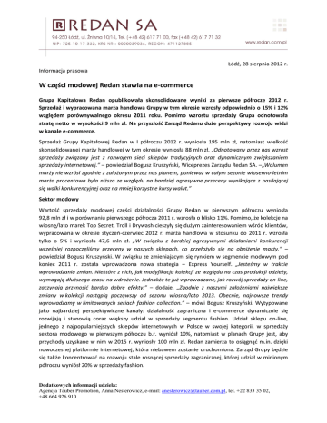 Łódź, 28 sierpnia 2012 r. Informacja prasowa W części modowej Redan stawia na e-commerce Grupa Kapitałowa Redan opublikowała skonsolidowane wyniki za pierwsze półrocze 2012 r. Sprzedaż i wypracowana marża handlowa Grupy w tym okresie wzrosły odpowiednio o 15% i 12% względem porównywalnego okresu 2011 roku. Pomimo wzrostu sprzedaży Grupa odnotowała stratę netto w wysokości 9 mln zł. Na przyszłość Zarząd Redanu duże perspektywy rozwoju widzi w kanale e-commerce. Sprzedaż Grupy Kapitałowej Redan w I półroczu 2012 r. wyniosła 195 mln zł, natomiast wielkość skonsolidowanej marży handlowej w tym okresie wyniosła 88 mln zł. „Odnotowany przez nas wzrost sprzedaży związany jest z rozwojem sieci sklepów tradycyjnych oraz dynamicznym zwiększaniem sprzedaży internetowej.” – powiedział Bogusz Kruszyński, Wiceprezes Zarządu Redan SA. –„Wolumen marży nie wzrósł zgodnie z założonym przez nas planem, ponieważ w całym sezonie wiosenno-letnim marża procentowa była niższa ze względu na bardziej agresywne przeceny wynikające z nasilającej się walki konkurencyjnej oraz na mniej korzystne kursy walut.” Sektor modowy Wartość sprzedaży modowej części działalności Grupy Redan w pierwszym półroczu wyniosła 92,8 mln zł i w porównaniu pierwszego półrocza 2011 r. wzrosła o blisko 11%. Pomimo, że kolekcje na wiosnę/lato marek Top Secret, Troll i Drywash cieszyły się dużym zainteresowaniem wśród klientów, wypracowana w okresie styczeń-czerwiec 2012 r. marża handlowa w stosunku do 2011 r. wzrosła tylko o 5% i wyniosła 47,6 mln zł. „W związku z bardziej agresywnymi działaniami konkurencji wcześniej rozpoczęliśmy przeceny w naszych sklepach, co przełożyło się na obniżenie marży.” – powiedział Bogusz Kruszyński. W związku ze zmieniającym się rynkiem w segmencie modowym pod koniec 2011 r. została wprowadzona nowa strategia – Express Yourself. „Jesteśmy w trakcie wprowadzania zmian. Niektóre z nich, jak modyfikacja kolekcji ze względu na czas produkcji odzieży, wymagają dłuższego czasu na wdrożenie. Jednakże te już wprowadzane, jak rozwój sprzedaży on-line, zaczynają przynosić bardzo dobre efekty.” – dodaje. „Zgodnie z naszymi założeniami największe zmiany w kolekcji nastąpią począwszy od sezonu wiosna/lato 2013. Obecnie, najnowsze trendy wprowadzamy w limitowanych seriach fashion collection.” – mówi Bogusz Kruszyński. Wytypowane jako najbardziej perspektywiczne kanały: działalność zagraniczna i e-commerce dynamicznie się rozwijają i stanowią coraz większy udział w sprzedaży segmentu fashion. Udział sklepu on-line, jednego z najpopularniejszych sklepów internetowych w Polsce w swojej kategorii, w sprzedaży sektora modowego w pierwszym półroczu b.r. wyniósł 10%, natomiast w planach Grupy jest, aby przychody uzyskane w nim w 2015 r. wyniosły 100 mln zł. Redan zamierza to osiągnąć m.in. dzięki nowoczesnej platformie internetowej, która niebawem zostanie uruchomiona. Zarząd Grupy będzie się także koncentrować na rozwoju stale rosnącej sprzedaży zagranicznej, której udział w minionym półroczu wyniósł 20% w sprzedaży fashion. Dodatkowych informacji udziela: Agencja Tauber Promotion, Anna Nesterowicz, e-mail: [email protected], tel. +22 833 35 02, +48 664 926 910 Sektor dyskontowy Sieć dyskontowa Textilmarket odnotowała 18% wzrost sprzedaży, która wyniosła 101,9 mln zł. Marża handlowa osiągnęła poziom 40,3 mln zł wobec 33,5 mln zł w pierwszym półroczu roku ubiegłego. Wypracowany wynik na sprzedaży jest niższy niż w pierwszym półroczu 2011 roku ze względu na wzrost kosztów związany z otwarciami i remontami sklepów, intensywne działania marketingowe i wydatki związane ze zbudowaniem nowoczesnej struktury logistycznej a także w wyniku niższej od zakładanej sprzedaży w nowootwartych sklepach. „W ostatnich okresach kładliśmy główny nacisk na tempo rozwoju sieci, uznaliśmy jednak, że należy je nieco zoptymalizować, aby utrzymać akceptowalny poziom bieżącej rentowności.” – powiedział Bogusz Kruszyński – „Oczywiście nadal będziemy otwierać dużo nowych sklepów, co których wyników będziemy zupełnie pewni.” Spółka deklaruje podjęcie jeszcze bardziej intensywnych działań pro-sprzedażowe w sklepach, na które będą składały się: optymalizacja oferty asortymentowej, sposobu prezentacji towarów w sklepach, poziomu zatowarowania sklepów oraz dopasowane do potrzeb działania promocyjne. Wszystkie te działania będą realizować misję sieci TextilMarket: Tanio i Modnie Ubieramy Całą Rodzinę. W segmencie modowym w ramach sieci sprzedaży marek Top Secret, Troll i DryWash na koniec lipca funkcjonowało 221 sklepów własnych i franczyzowych o łącznej powierzchni 34,7 tys. m2. Sieć sprzedaży TextilMarket na koniec lipca składała się z 273 sklepów własnych o łącznej powierzchni przekraczającej 60 tys. m2. *** Redan SA jest operatorem znanych detalicznych marek odzieżowych: Top Secret, Troll i Drywash oraz sieci sklepów TextilMarket. Spółka funkcjonuje w ramach Grupy Kapitałowej, która zajmuje się projektowaniem, marketingiem oraz dystrybucją odzieży. Redan zleca swoją produkcję fabrykom w Polsce, Chinach, Indiach Turcji, Korei i Bangladeszu. W Polsce Grupa Kapitałowa zatrudnia dwa tysiące osób. Sprzedaż jest prowadzona w 4 sieciach detalicznych: Top Secret, Top Secret&Friends, Troll oraz Textilmarket liczących ponad 490 sklepów. Redan powstał w 1995 roku, a w 2003 roku akcje Spółki zostały dopuszczone do publicznego obrotu na Giełdzie Papierów Wartościowych w Warszawie. Spółka aktywnie wspiera Fundację Happy Kids. Dodatkowych informacji udziela: Agencja Tauber Promotion, Anna Nesterowicz, e-mail: [email protected], tel. +22 833 35 02, +48 664 926 910
