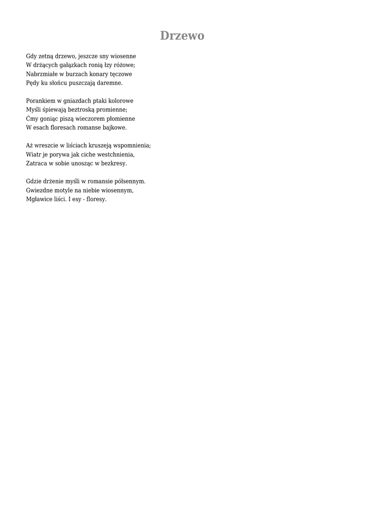 Drzewo Gdy zetną drzewo, jeszcze sny wiosenne W drżących gałązkach ronią łzy różowe; Nabrzmiałe w burzach konary tęczowe Pędy ku słońcu puszczają daremne. Porankiem w gniazdach ptaki kolorowe Myśli śpiewają beztroską promienne; Ćmy goniąc piszą wieczorem płomienne W esach floresach romanse bajkowe. Aż wreszcie w liściach kruszeją wspomnienia; Wiatr je porywa jak ciche westchnienia, Zatraca w sobie unosząc w bezkresy. Gdzie drżenie myśli w romansie półsennym. Gwiezdne motyle na niebie wiosennym, Mgławice liści. I esy - floresy.
