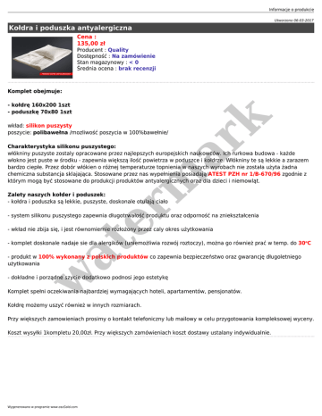 Informacje o produkcie Utworzono 06-03-2017 Kołdra i poduszka antyalergiczna Cena : 135,00 zł Producent : Quality Dostępność : Na zamówienie Stan magazynowy : < 0 Średnia ocena : brak recenzji Komplet obejmuje: er m ar k - kołdrę 160x200 1szt - poduszkę 70x80 1szt wkład: silikon puszysty poszycie: polibawełna /mozliwość poszycia w 100%bawełnie/ Charakterystyka silikonu puszystego: włókniny puszyste zostaly opracowane przez najlepszych europejskich naukowców. Ich rurkowa budowa - każde włokno jest puste w środku - zapewnia większą ilość powietrza w poduszce i kołdrze. Włókniny te są lekkie a zarazem bardzo ciepłe. Przez dobór włókien o różnej temperaturze topnienia w naszych wyrobach nie została użyta żadna chemiczna substancja sklajająca. Stosowane przez nas wypełnienia posiadają ATEST PZH nr 1/B-670/96 zgodnie z którym mogą być stosowane do produkcji produktów antyalergicznych oraz dla dzieci i niemowląt. Zalety naszych kołder i poduszek: - kołdra i poduszka są lekkie, puszyste, doskonale otulają ciało - system silikonu puszystego zapewnia długotrwałość produktu oraz odporność na zniekształcenia at - wkład nie zbija się, i jest równomiernie rozłożony przez caly okres użytkowania - komplet doskonale nadaje sie dla alergików (uniemożliwia rozwój roztoczy), można go również prać w temp. do 30oC w - produkt w 100% wykonany z polskich produktów co zapewnia bezpieczeństwo oraz gwarancję długoletniego użytkowania - dokładne i porządne szycie dodatkowo podnosi jego estetykę Komplet spełni oczekiwania najbardziej wymagających hoteli, apartamentów, pensjonatów. Kołdrę możemy uszyć również w innych rozmiarach. Przy większych zamowieniach prosimy o kontakt telefoniczny lub mailowy w celu przygotowania kompleksowej wyceny. Koszt wysyłki 1kompletu 20,00zł. Przy większych zamówieniach koszt dostawy ustalany indywidualnie. Wygenerowano w programie www.oscGold.com