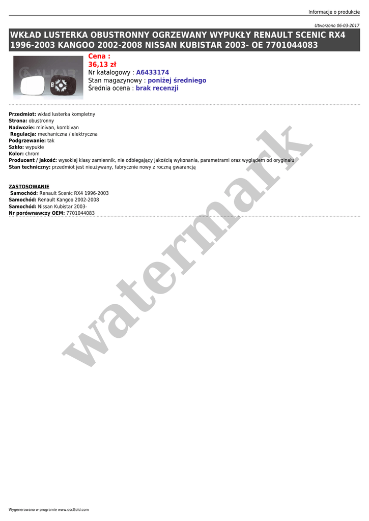 Informacje o produkcie Utworzono 06-03-2017 WKŁAD LUSTERKA OBUSTRONNY OGRZEWANY WYPUKŁY RENAULT SCENIC RX4 1996-2003 KANGOO 2002-2008 NISSAN KUBISTAR 2003- OE 7701044083 Cena : 36,13 zł Nr katalogowy : A6433174 Stan magazynowy : poniżej średniego Średnia ocena : brak recenzji er m ar k Przedmiot: wkład lusterka kompletny Strona: obustronny Nadwozie: minivan, kombivan Regulacja: mechaniczna / elektryczna Podgrzewanie: tak Szkło: wypukłe Kolor: chrom Producent / jakość: wysokiej klasy zamiennik, nie odbiegający jakością wykonania, parametrami oraz wyglądem od oryginału Stan techniczny: przedmiot jest nieużywany, fabrycznie nowy z roczną gwarancją w at ZASTOSOWANIE Samochód: Renault Scenic RX4 1996-2003 Samochód: Renault Kangoo 2002-2008 Samochód: Nissan Kubistar 2003Nr porównawczy OEM: 7701044083 Wygenerowano w programie www.oscGold.com