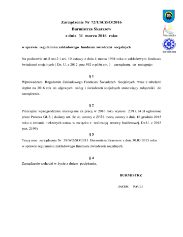 Zarządzenie Nr 72/USCiSO/2016 Burmistrza Skarszew z dnia 31 marca 2016 roku w sprawie regulaminu zakładowego funduszu świadczeń socjalnych Na podstawie art.8 ust.2 i art. 10 ustawy z dnia 4 marca 1994 roku o zakładowym funduszu świadczeń socjalnych ( Dz. U. z 2012 poz 592 z późń zm. ) zarządzam, co następuje: §1 Wprowadzam Regulamin Zakładowego Funduszu Świadczeń Socjalnych wraz z tabelami dopłat na 2016 rok do ulgowych usług i świadczeń socjalnych stanowiący załączniki do zarządzenia. §2 Przeciętne wynagrodzenie miesięczne za pracę w 2016 roku wynosi 2.917,14 zł ogłoszone przez Prezesa GUS ( dodany art. 5e do ustawy o ZFŚS mocą ustawy z dnia 16 grudnia 2015 roku o zmianie niektórych ustaw w związku z realizacją ustawy budżetowej, Dz.U. z 2015 poz. 2199) §3 Tracą moc zarządzenia Nr 58/WOiSO/2015 Burmistrza Skarszew z dnia 30.03.2015 roku w sprawie regulaminu zakładowego funduszu świadczeń socjalnych. §4 Zarządzenie wchodzi w życie z dniem podpisania. BURMISTRZ JACEK PAULI Zał.do Zarządzenia nr 72/USCiSO/16 z dnia 31.03.2016 rok REGULAMIN ZAKŁADOWEGO FUNDUSZU ŚWIADCZEŃ I. ZASADY SOCJALNYCH OGÓLNE §1 Regulamin Zakładowego Funduszu Świadczeń Socjalnych, zwany dalej "Regulaminem" opracowany został na podstawie aktów prawnych: 1. ustawa z 4 marca 1994 roku o zakładowym funduszu świadczeń socjalnych tekst jednolity ( Dz.U. z 2012 poz. 592 z późn. zm.) 2. rozporządzenie Ministra Pracy i Polityki Socjalnej z dnia 9 marca 2009 roku w sprawie sposobu ustalenia przeciętnej liczby zatrudnionych w celu naliczenia odpisu na zakładowy fundusz świadczeń socjalnych ( Dz.U.z 2009 roku nr 43, poz. 349 ). 3.dodany art.5e do ustawy o ZFŚS mocą ustawy z dnia 16 grudnia 2015r. o zmianie niektórych ustaw w związku z realizacją ustawy budżetowej (Dz.U.z 2015, poz. 2199). §2 1. Regulamin określa osoby uprawnione do korzystania ze świadczeń Funduszu oraz zasady przyznawania pomocy. 2.Użyte w regulaminie określenia oznaczają: Fundusz - Zakładowy Fundusz Świadczeń Socjalnych tworzony w Urzędzie Miejskim w Skarszewach na podstawie ustawy z dnia 4 marca 1994 roku o zakładowym funduszu świadczeń socjalnych. Pracodawca - Urząd Miejski w Skarszewach reprezentowany przez Burmistrza Skarszew Komisja Socjalna - zespół utworzony przez Pracodawcę ( powołany zarządzeniem pracodawcy ) do opiniowania przyznawanych świadczeń wymienionych w (zał. Nr 3 do zarządzenia ) Regulaminie II. TWORZENIE FUNDUSZU §3 1. Fundusz jest tworzony z corocznego odpisu podstawowego naliczanego w stosunku do przeciętnej liczby zatrudnionych pracowników oraz zwiększeń objętych opieką emerytów i rencistów. 2.Środki Funduszu mogą być zwiększone o wpływy z opłat osób korzystających ze świadczeń , odsetki z środków wpływy z oprocentowania pożyczek mieszkaniowych oraz inne środki określone ustawą. 3.Fundusz jest przeznaczony na finansowanie świadczeń socjalnych dla pracowników i innych osób uprawnionych, wskazanych w § 10 Regulaminu. 4.Środki Funduszu są gromadzone na odrębnym rachunku bankowym. Środki Funduszu niewykorzystane w danym roku kalendarzowym przechodzą na następny rok. §4 1. Podstawę podziału Funduszu na poszczególne cele i rodzaje działalności socjalnej stanowi roczny plan rzeczowo-finansowy stanowiący zał. nr 1 do Regulaminu. 2.Plan rzeczowo-finansowy opracowuje Burmistrz w uzgodnieniu z Komisją Socjalną Urzędu Miejskiego w Skarszewach oraz podejmuje decyzje w sprawie przyznania osobie uprawnionej do ulgowej usługi lub świadczenia socjalnego finansowanego z Funduszu. Plan ustala się do 31 marca każdego roku. 3.Podstawę do przyznania osobie uprawnionej świadczeń z Funduszu w oparciu o Regulamin stanowi pisemny wniosek samego uprawnionego, przełożonego, opiekuna, wypełniony według wzoru, a następnie zatwierdzony do wypłaty przez Pracodawcę. 4.Fundusz jest funduszem spożycia zbiorowego i nie korzystanie z niego nie daje uprawnionym podstawy do żądania jakiegokolwiek ekwiwalentu. Świadczenia socjalne nie mają charakteru roszczeniowego. III. OSOBY UPRAWNIONE DO KORZYSTANIA Z FUNDUSZU §5 1. Ze świadczeń Funduszu mogą korzystać: a) pracownicy zatrudnieni w pełnym i niepełnym wymiarze czasu pracy na czas nieokreślony i określony, na podstawie umowy o pracę, wyboru i mianowania, b) pracownicy przebywający na urlopach wychowawczych, c) emeryci i renciści - byli pracownicy Urzędu Miejskiego, d) członkowie rodzin pracowników oraz członkowie rodzin emerytów, rencistów wspólnie zamieszkujących i gospodarujących z osobą uprawnioną do korzystania z Funduszu, e) członkowie rodzin po zmarłych pracownikach oraz zmarłych emerytach i rencistach, którzy byli na utrzymaniu tych pracowników w chwili ich śmierci. 2.Członkami rodziny osoby uprawnionej są: a) pozostające na utrzymaniu i wychowaniu dzieci własne, dzieci współmałżonka, dzieci przysposobione, dzieci przyjęte na wychowanie w ramach rodzin zastępczych, wnuki i rodzeństwo w wieku do 18 lat, a jeżeli kształcą się w szkołach - do czasu ukończenia nauki, nie dłużej jednak niż do ukończenia 25 lat. Dotyczy to także małżeństw rozwiedzionych zamieszkujących oddzielnie, jeżeli osoba uprawniona udowodni że łoży na ich utrzymanie, b) osoby wymienione w punkcie „a” niezdolne do żadnej pracy z orzeczoną niepełnosprawnością bez względu na wiek, c) współmałżonkowie, w tym również konkubenci jeżeli zamieszkują razem z osobą uprawnioną i prowadzą wspólne z nią gospodarstwo, 3. Uprawnienia do korzystania z Funduszu jako członkowie rodzin tracą osoby wymienione w pkt 1e w przypadku wstąpienia w związek małżeński. §6 1. Nowo zatrudniony pracownik może ubiegać się o świadczenia z Funduszu od pierwszego dnia zatrudnienia. 2. Zatrudnione w UM małżeństwo może uzyskać tylko jedną dopłatę do świadczeń w ciągu roku na wniosek jednego z małżonków będących pracownika