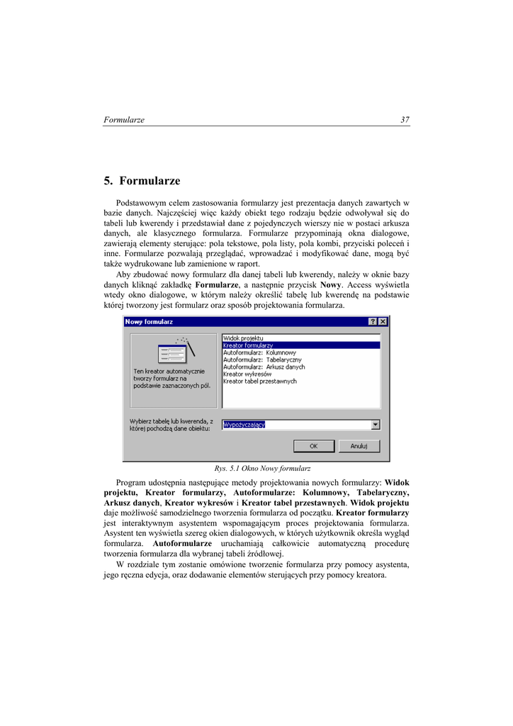Formularze 37 5. Formularze Podstawowym celem zastosowania formularzy jest prezentacja danych zawartych w bazie danych. Najczęściej więc kaŜdy obiekt tego rodzaju będzie odwoływał się do tabeli lub kwerendy i przedstawiał dane z pojedynczych wierszy nie w postaci arkusza danych, ale klasycznego formularza. Formularze przypominają okna dialogowe, zawierają elementy sterujące: pola tekstowe, pola listy, pola kombi, przyciski poleceń i inne. Formularze pozwalają przeglądać, wprowadzać i modyfikować dane, mogą być takŜe wydrukowane lub zamienione w raport. Aby zbudować nowy formularz dla danej tabeli lub kwerendy, naleŜy w oknie bazy danych kliknąć zakładkę Formularze, a następnie przycisk Nowy. Access wyświetla wtedy okno dialogowe, w którym naleŜy określić tabelę lub kwerendę na podstawie której tworzony jest formularz oraz sposób projektowania formularza. Rys. 5.1 Okno Nowy formularz Program udostępnia następujące metody projektowania nowych formularzy: Widok projektu, Kreator formularzy, Autoformularze: Kolumnowy, Tabelaryczny, Arkusz danych, Kreator wykresów i Kreator tabel przestawnych. Widok projektu daje moŜliwość samodzielnego tworzenia formularza od początku. Kreator formularzy jest interaktywnym asystentem wspomagającym proces projektowania formularza. Asystent ten wyświetla szereg okien dialogowych, w których uŜytkownik określa wygląd formularza. Autoformularze uruchamiają całkowicie automatyczną procedurę tworzenia formularza dla wybranej tabeli źródłowej. W rozdziale tym zostanie omówione tworzenie formularza przy pomocy asystenta, jego ręczna edycja, oraz dodawanie elementów sterujących przy pomocy kreatora. 38 Wprowadzenie do projektowania baz danych 5.1 Asystent W celu utworzenia formularza wyświetlającego zawartość danej tabeli lub kwerendy wybrano współpracę z interaktywnym asystentem poprzez wskazanie opcji Kreator formularzy z okna Nowy formularz. Ze względu na to, Ŝe nie zawsze poŜądane jest wyświetlanie wszystkich pól tabeli źródłowej, asystent w następnym kroku Ŝąda wybrania pól, które mają być umieszczone w formularzu. Niezbędne jest ustalenie kolejności wyświetlanych pól. NaleŜy po kolei wybierać pola z listy Dostępne pola i przy pomocy przycisku oznaczonego > przesuwać je do listy Wybrane pola. JeŜeli kolejność ta ma być taka jak kolejność pól w wierszu tabeli i wszystkie pola mają być widoczne moŜna uŜyć przycisku >>. Dwa przyciski umieszczone poniŜej pozwalają usunąć pojedyncze (<) lub wszystkie (<<) pola z listy Wybrane pola. Asystent umoŜliwia równieŜ dołączanie pól z innych tabel, tabele te powinny być powiązane z tabelą główną za pomocą polecenia Narzędzia|Relacje. (patrz punkt 3.4) Rys. 5.2 Kreator formularzy - wybór pól Następny etap tworzenia formularza wymaga podjęcia decyzji co do rodzaju formularza: Kolumnowy, Tabelaryczny, Arkusz danych, Wyjustowany. Wygląd kaŜdego z dostępnych układów widoczny jest w oknie asystenta. Kolejna czynność to wybór stylu formularza, podobnie jak poprzednio wskazanie stylu powoduje aktualizację podglądu w oknie kreatora. Na koniec naleŜy nadać formularzowi nazwę. Standardowo jest to nazwa tabeli źródłowej (wygenerowanemu w tym punkcie formularzowi nadana została nazwa „Wszyscy wypoŜyczający”). Ponadto poprzez wybór jednej z dwóch opcji moŜna Formularze 39 zdecydować o Otwarciu formularza, aby przejrzeć lub wprowadzić informacje czy Modyfikowaniu projektu formularza. Rys. 5.3 Kreator formularzy - wybór układu i stylu 5.2 Edycja formularza Po wybraniu przycisku Modyfikuj projekt formularza z ostatniego okna asystenta lub przycisku Projektuj z okna bazy danych dla wybranego formularza moŜna samodzielnie decydować o jego wyglądzie. Równocześnie z pojawieniem się okna projektu formularza Access włącza pasek narzędzi Projekt formularza oraz Formatowanie. 40 Wprowadzenie do projektowania baz danych Zapisz Widok Podgląd wydruku Drukuj Kopiuj Wytnij Malarz formatów Wklej Pasek Przybornik Kod Buduj Nowy obiekt: narzędzi programu tabela narzędzi Sieć WWW Wstaw hiperłącze Lista pól Właściwości Asystent Autoformatowanie Okno bazy pakietu danych Office Rys 5.4 Pasek narzędzi Projekt formularza Formularz znajduje się w tzw. Widoku Projekt. Widok ten moŜna zmienić posługując się pierwszym przyciskiem paska narzędzi. MoŜna przełączyć formularz w tryb: Widok Formularz lub Widok arkusza danych. Pierwszy z nich jest domyślnie wybrany na pasku narzędzi. Obiekt Czcionka Rozmiar Kursywa czcionki Wyrównaj Wyrównaj Kolor czcionki do lewej do prawej pierwszoplanowy Efekt specjalny Podkreślenie Kolor wypełnienia/tła Szerokość linii Pogrubienie Wyśrodkuj Kolor linii/obramowania Rys 5.5 Pasek narzędzi Formatowanie Stworzony przez asystenta formularz to prostokątny blankiet podzielony na trzy sekcje. W nagłówku, w przypadku układu tabelarycznego, znajdują się nazwy wyświetlanych pól, w sekcji szczegółowej znajdują się pola tekstowe przypisane polom tabeli źródłowej, stopka formularza jest pusta. UŜytkownik moŜe zmieniać rozmiary całego formularza jak i jego sekcji. Wystarczy w tym celu złapać myszą dowolną krawędź blankietu lub sekcji i przeciągnąć ją w nowe połoŜenie. Kursor myszy , . przyjmuje wtedy postać: Blankiet formularza pokryty jest siatką kropek, oraz linii. Siatka umoŜliwia wyrównywanie wzajemnego połoŜenia detali na formularzu w poziomie i w pionie, dzięki swym „przyciągającym” właściwościom. Wyświetlanie siatki i „przyciąganie” do niej zaleŜy od stanu opcji Widok|Siatka. Elementy formularza takie jak pola tekstowe, etykiety są nazywane formantami. Tryb projektowania pozwala zaznaczać, przesuwać zmieniać rozmiar i dokonywać innych działań na tych elementach. Formularze 41 Rys. 5.6 Okno projektu formularza Zaznaczenie sygnalizowane jest pojawieniem się czarnych kwadratów w naroŜnikac