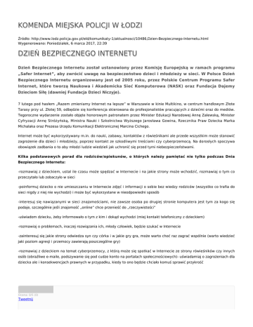 KOMENDA MIEJSKA POLICJI W ŁODZI Źródło: http://www.lodz.policja.gov.pl/eld/komunikaty-1/aktualnosci/10486,Dzien-Bezpiecznego-Internetu.html Wygenerowano: Poniedziałek, 6 marca 2017, 22:39 DZIEŃ BEZPIECZNEGO INTERNETU Dzień Bezpiecznego Internetu został ustanowiony przez Komisję Europejską w ramach programu „Safer Internet”, aby zwrócić uwagę na bezpieczeństwo dzieci i młodzieży w sieci. W Polsce Dzień Bezpiecznego Internetu organizowany jest od 2005 roku, przez Polskie Centrum Programu Safer Internet, które tworzą Naukowa i Akademicka Sieć Komputerowa (NASK) oraz Fundacja Dajemy Dzieciom Siłę (dawniej Fundacja Dzieci Niczyje). 7 lutego pod hasłem „Razem zmieniamy Internet na lepsze” w Warszawie w kinie Multikino, w centrum handlowym Złote Tarasy przy ul. Złotej 59, odbędzie się konferencja skierowana do profesjonalistów pracujących z dziećmi oraz do mediów. Tegoroczne wydarzenie zostało objęte honorowym patronatem przez Minister Edukacji Narodowej Annę Zalewską, Minister Cyfryzacji Annę Stróżyńską, Ministra Nauki i Szkolnictwa Wyższego Jarosława Gowina, Rzecznika Praw Dziecka Marka Michalaka oraz Prezesa Urzędu Komunikacji Elektronicznej Marcina Cichego. Internet może być wykorzystywany m.in. do nauki, zabawy, kontaktów z rówieśnikami ale przede wszystkim może stanowić zagrożenie dla dzieci i młodzieży, poprzez kontakt ze szkodliwymi treściami czy cyberprzemocą. Na dorosłych spoczywa obowiązek zadbania o to aby młodzi ludzie wiedzieli jak uchronić się przed tymi niebezpieczeństwami. Kilka podstawowych porad dla rodziców/opiekunów, o których należy pamiętać nie tylko podczas Dnia Bezpiecznego Internetu: -rozmawiaj z dzieckiem, ustal ile czasu może spędzać w Internecie i na jakie strony może wchodzić, rozmawiaj o tym co przeczytało lub zobaczyło w sieci -poinformuj dziecko o nie umieszczaniu w Internecie zdjęć i informacji o sobie bez wiedzy rodziców (wszystko co trafia do sieci nigdy z niej nie wychodzi) i może być wykorzystane w nieodpowiedni sposób -interesuj się nawiązanymi w sieci znajomościami, nie zawsze osoba po drugiej stronie komputera jest tym za kogo się podaje, szczególnie jeśli znajomość „online” chce przenieść do „rzeczywistości” -uświadom dziecku, żeby informowało o tym z kim i dokąd wychodzi (miej kontakt telefoniczny z dzieckiem) -rozmawiaj o problemach, inaczej rozwiązania ich, młody człowiek, będzie szukać w Internecie -zainteresuj się jakie strony odwiedza syn czy córka i w jakie gry gra, może warto choć raz zagrać wspólnie (warto wiedzieć jaki poziom agresji i przemocy zawierają poszczególne gry) -rozmawiaj z dzieckiem na temat cyberprzemocy, z którą może się spotkać w Internecie ze strony rówieśników czy innych osób (obraźliwe e-maile, podszywanie się pod cudze konto na portalach społecznościowych)- uświadamiaj o zagrożeniach dla dziecka ale i konsekwencjach prawnych w przypadku, kiedy to ono będzie chciało komuś sprawić przykrość Ocena: 0/5 (0) Tweetnij
