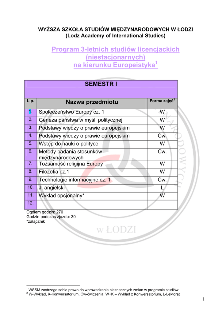 WYśSZA SZKOŁA STUDIÓW MIĘDZYNARODOWYCH W ŁODZI (Lodz Academy of International Studies) Program 3-letnich studiów licencjackich (niestacjonarnych) na kierunku Europeistyka1 SEMESTR I L.p. Nazwa przedmiotu Forma zajęć2 1. Społeczeństwo Europy cz. 1 W 2. Geneza państwa w myśli politycznej W 3. Podstawy wiedzy o prawie europejskim W 4. Podstawy wiedzy o prawie europejskim Ćw. 5. Wstęp do nauki o polityce 6. 7. Metody badania stosunków międzynarodowych ToŜsamość religijna Europy 8. Filozofia cz.1 9. Technologie informacyjne cz. 1 10. J. angielski L 11. Wykład opcjonalny* W W Ćw. W W Ćw. 12. Ogółem godzin: 270 Godzin podczas zjazdu: 30 *załącznik 1 2 WSSM zastrzega sobie prawo do wprowadzania nieznacznych zmian w programie studiów W-Wykład, K-Konwersatorium, Ćw-ćwiczenia, W+K – Wykład z Konwersatorium, L-Lektorat 1 SEMESTR II L.p. Nazwa przedmiotu Forma zajęć3 1. Ekonomia cz.1 W 2. Ekonomia cz.1 Ćw. 3. Europejska myśl polityczna W 4. Podstawy prawa wspólnotowego W 5. Narodziny cywilizacji europejskiej W 6. Państwo i Kościół w Europie W 7. Geografia polityczna Europy W 8. Rosja współczesna W 9. Technologie informacyjne cz. 2 10. Metody analizy statystycznej W 11. Globalizacja kultury W 12. Społeczeństwo Europy cz. 2 W 13. Filozofia cz.2 W 14. J. angielski L 15. J. obcy 2 L 16, Wykład opcjonalny* W Ćw. Ogółem godzin: 324 Godzin podczas zjazdu: 36 *załącznik 3 W-Wykład, K-Konwersatorium, Ćw-ćwiczenia, W+K – Wykład z Konwersatorium, L-Lektorat 2 SEMESTR III L.p. Nazwa przedmiotu Forma zajęć4 1. Ochrona praw człowieka w Radzie Europy W 2. Ekonomia cz.2 W 3. Ekonomia cz.2 Ćw. 4. Europa w stosunkach międzynarodowych W 5. Europa w stosunkach międzynarodowych Ćw. 6. 7. Transformacja ustrojowa w Europie ŚrodkowoWschodniej Korzenie kultury europejskiej W 8. Przedsiębiorstwo na rynku międzynarodowym W+Ćw. 9. Podstawy zarządzania W 10. Kultura współczesnej Europy W 11. 12. Instytucje i procesy decyzyjne w UE Historia społeczna Europy cz. 1 13. J. obcy 2 L 14. J. angielski L 15. Wykład opcjonalny* W W Ćw. W 16. Ogółem godzin: 288 Godzin podczas zjazdu: 32 *załącznik 4 W-Wykład, K-Konwersatorium, Ćw-ćwiczenia, W+K – Wykład z Konwersatorium, L-Lektorat 3 SEMESTR IV L.p. Nazwa przedmiotu Forma zajęć5 1. Rewolucje w Europie W 2. Geografia Polski W 3. Region Bałtyku W 4. Ćw. 5. Transmisja kultury europejskiej do kultur pozaeuropejskich Istota i elementy systemu politycznego 6. Międzynarodowe prawo publiczne Ćw. 7. Integracja gospodarcza w Europie W 8. Integracja polityczna w Europie W 9. Polityka zagraniczna UE W 10. Polityka zagraniczna UE Ćw. 11. Historia społeczna Europy cz. 2 W 12. Wykład opcjonalny W 13. J. obcy 2 L 14. Proseminarium W SEM Ogółem godzin: 270 Godzin podczas zjazdu: 30 *załącznik 5 W-Wykład, K-Konwersatorium, Ćw-ćwiczenia, W+K – Wykład z Konwersatorium, L-Lektorat 4 SEMESTR V L.p. Nazwa przedmiotu Forma zajęć6 1. System polityczny Rosji W 2. Integracja regionalna w Europie W 3. W 4. Makro i mikroekonomiczne polityki wspólnotowe Polska w Europie 5. Cywilizacja i kultura w Ameryce Łacińskiej Ćw. 6. ToŜsamość kulturowa w dobie globalizacji W 7. Europejski System Ochrony Praw Człowieka 8. Totalitaryzmy w Europie W 9. Wykłady specjalizacyjne W+Ćw. 10. Wykład opcjonalny* 11. Seminarium dyplomowe W W+Ćw. W SEM 12. 13. Ogółem godzin: 216 Godzin podczas zjazdu: 24 *załącznik 6 W-Wykład, K-Konwersatorium, Ćw-ćwiczenia, W+K – Wykład z Konwersatorium, L-Lektorat 5 SEMESTR VI L.p. Nazwa przedmiotu Forma zajęć7 1. Idee i instytucje współczesnej demokracji W 2. Polski system polityczny W 3. Ochrona własności intelektualnej 4. System polityczny Niemiec 5. Traktat Lizboński 6. Wykłady specjalizacyjne W+Ćw. Seminarium dyplomowe SEM Ćw. W Ćw. Ogółem godzin: 162 Tygodniowo godzin: 18 *załącznik 7 W-Wykład, K-Konwersatorium, Ćw-ćwiczenia, W+K – Wykład z Konwersatorium, L-Lektorat 6
