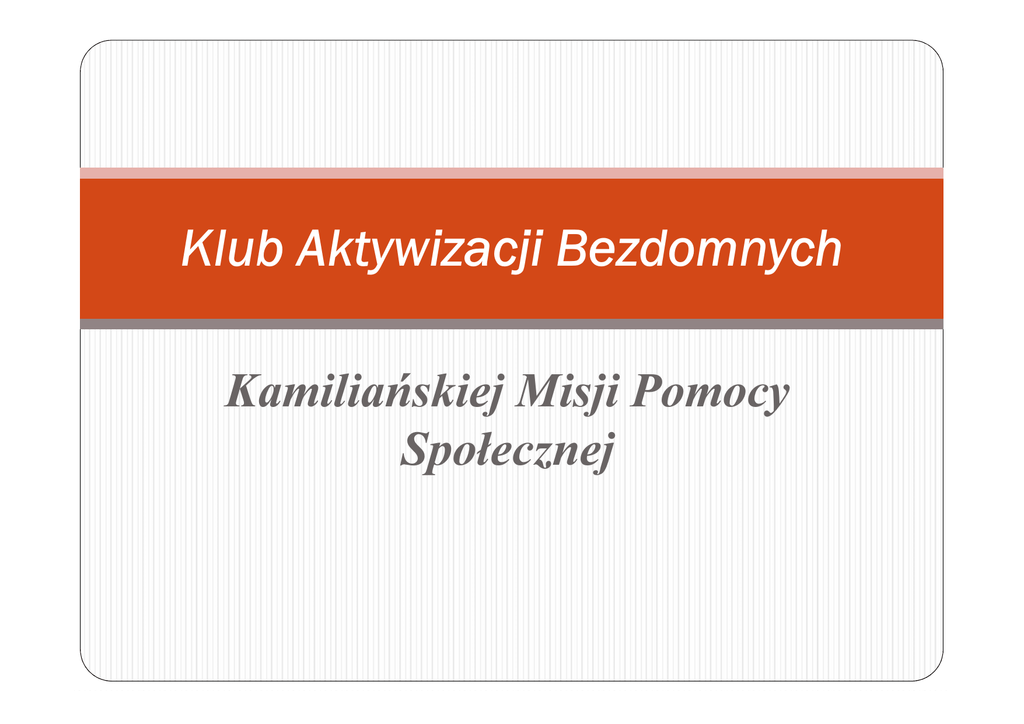 Klub Aktywizacji Bezdomnych Kamiliańskiej Misji Pomocy Społecznej Bezdomność wg KMPS Jest to szczególna sytuacja mieszkaniowa w której przejściowo lub przewlekle znajduje się człowiek w wyniku splotu wydarzeń związanych z sytuacją m.in. osobistą, materialną tracąc stałe miejsce pobytu. Kto jest osobą w kryzysie bezdomności? Stereotypowo Osoby bez dachu nad głową, przebywające na stałe w przestrzeni publicznej, brudni, nieogoleni, spożywający substancje odurzające itp. badania i analizy m.in. w bazie danych o mieszkańcach stosujemy: Europejską typologię sytuacji mieszkaniowych ETHOS Bezdomność zaczyna się w domu. Osoby zagrożone bezdomnością np.: - z wyrokiem eksmisji; - mające duże zadłużenie czynszowe; - w lokalach substandardowych; - w mieszkaniach z nieuregulowaną sytuacją prawną; OSOBA ZNAJDUJĄCA SIĘ W KRYZYSIE BEZDOMNOŚCI Placówki Stacjonarne Całodobowe USAMODZIELNIENIE Najpierw Mieszkanie Punkty Pomocy Doraźnej Placówki umożliwiające pobyt w warunkach samodzielnego funkcjonowania KAB-el Klub Aktywizacji Osób Bezdomnych Obejmujemy wsparciem osoby w kryzysie bezdomności oraz zagrożone bezdomnością. Zespół Interdyscyplinarny Osoby reprezentujące różne dziedziny wspólnie rozwiązują problemy osób w kryzysie bezdomności. Zaletą naszego zespołu jest nie tylko wiedza, ale i sposób myślenia. Zespół Interdyscyplinarny Streetworker; Pracownik socjalny; Psycholog/ coach; Terapeuta ds. uzależnień; Prawnik; Duchowny; Doradca zawodowy. KAB-el Mieszkania Treningowe Przestrzeń publiczna Dziękujemy za uwagę.