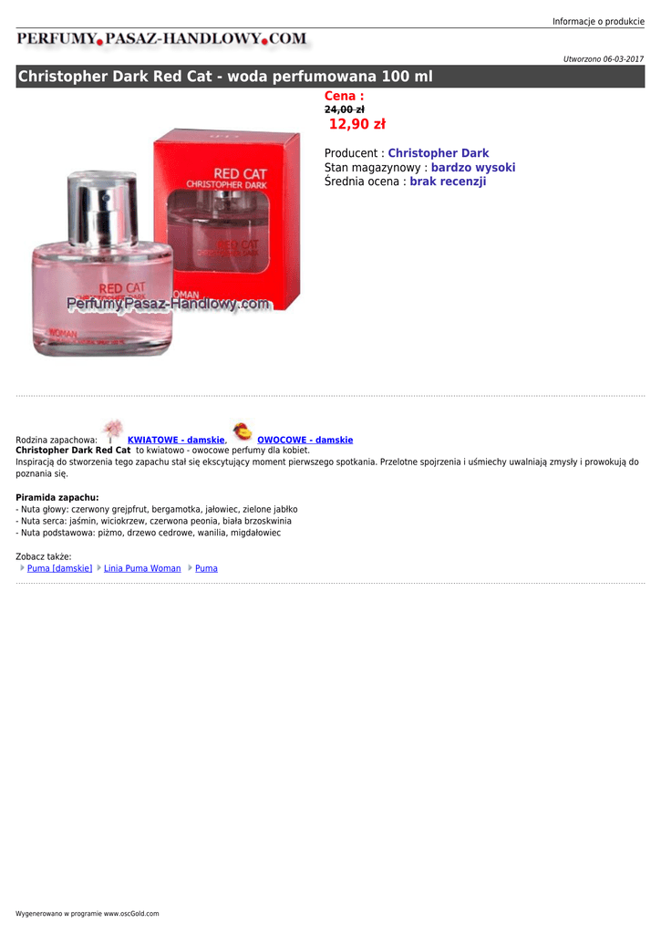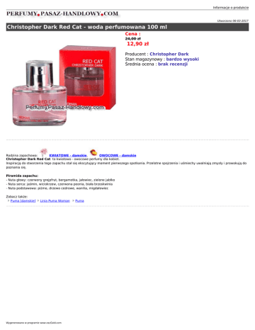 Informacje o produkcie Utworzono 06-03-2017 Christopher Dark Red Cat - woda perfumowana 100 ml Cena : 24,00 zł 12,90 zł Producent : Christopher Dark Stan magazynowy : bardzo wysoki Średnia ocena : brak recenzji Rodzina zapachowa: KWIATOWE - damskie, OWOCOWE - damskie Christopher Dark Red Cat to kwiatowo - owocowe perfumy dla kobiet. Inspiracją do stworzenia tego zapachu stał się ekscytujący moment pierwszego spotkania. Przelotne spojrzenia i uśmiechy uwalniają zmysły i prowokują do poznania się. Piramida zapachu: - Nuta głowy: czerwony grejpfrut, bergamotka, jałowiec, zielone jabłko - Nuta serca: jaśmin, wiciokrzew, czerwona peonia, biała brzoskwinia - Nuta podstawowa: piżmo, drzewo cedrowe, wanilia, migdałowiec Zobacz także: Puma [damskie] Linia Puma Woman Wygenerowano w programie www.oscGold.com Puma