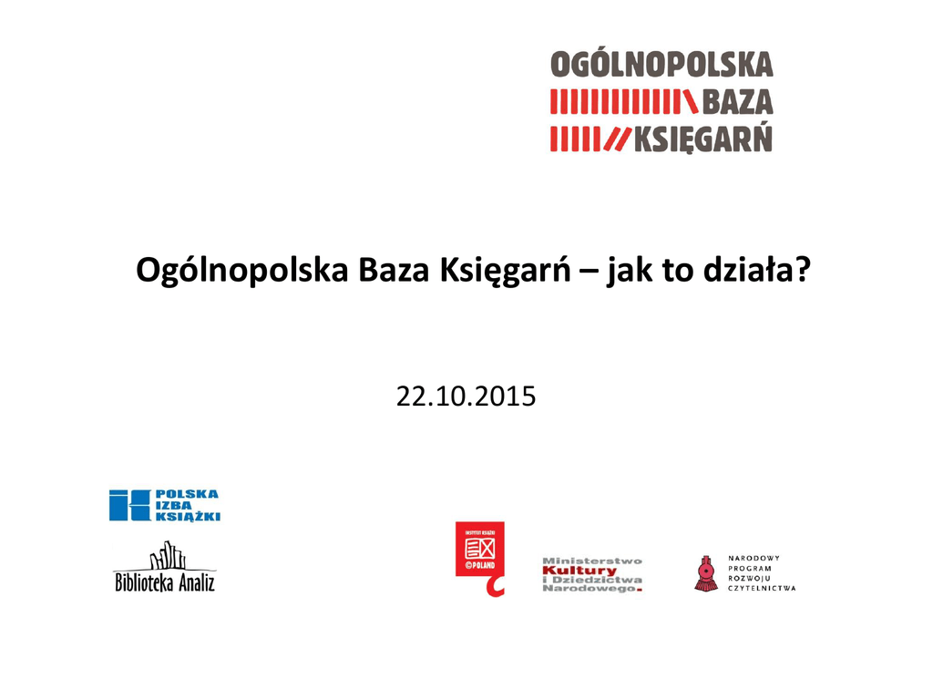 Ogólnopolska Baza Księgarń – jak to działa? 22.10.2015 Ogólnie o OBK 1. Nieodpłatna, ogólnodostępna baza danych o księgarniach w Polsce, która docelowo obejmie księgarnie tradycyjne, internetowe oraz inne miejsca sprzedaży książek. W chwili obecnej budujemy dane o księgarniach tradycyjnych. 2. Baza powstaje ze środków Ministerstwa Kultury i Dziedzictwa Narodowego, zarządzanych przez Instytut Książki w ramach Narodowego Programu Rozwoju Czytelnictwa 2014-2020. Realizacją OBK zajmuje się na zlecenie Instytutu Książki Polska Izba Książki i współpracujące z Izbą Biblioteka Analiz oraz Libroskop. Izba Księgarstwa Polskiego, Stowarzyszenie Księgarzy Polskich oraz Ogólnopolskie Stowarzyszenie Księgarzy wspierają ten projekt. 3. Pod pojęciem księgarni tradycyjnej rozumiemy miejsca ekspozycji i sprzedaży książek w ich różnej formie (drukowane, audiobooki, e-booki), z zastrzeżeniem, że obrót książkami w tej fizycznej placówce handlowej jest dominujący wobec ewentualnych innych przychodów. Ogólnie o OBK 4. W OBK zbierzemy obszerne dane o poszczególnych placówkach księgarskich, tak aby powstawały raporty dokładnie opisujące stan rynku księgarskiego w Polsce: ile jest księgarń w Polsce ile w poszczególnych województwach i powiatach ile jest księgarń ogólnoasortymentowych a ile o specjalistycznym profilu ile mających w swojej ofercie np. podręczniki szkolne czy też literaturę dla młodzieży i dla dzieci ile księgarń prowadzi programy wspierające sprzedaż liczba zatrudnionych na rynku księgarskim itp. Ogólnie o OBK 5. Poprzez aktualizację danych raz w roku i agregowanie danych historycznych OBK będzie ważnym instrumentem monitoringu rozwoju rynku księgarskiego. Będziemy mogli konkretnie odpowiedzieć na pytanie, czy w danym powiecie/województwie przybyło, czy ubyło księgarń? Czy zaszły zmiany w profilu księgarń, w ich ofercie, itd. itp. Ogólnie o OBK 6. Ważną funkcją OBK będzie także informowanie zainteresowanych o samych księgarniach. Klient poszukujący księgarni w swoim otoczeniu będzie ją mógł odszukać w OBK, zasięgnąć podstawowych informacji o księgarni w interesującym go miejscu względnie o księgarni poszukiwanego profilu, poszukiwanej aktywności. Przejdzie na stronę internetową wybranej księgarni, jeśli księgarnia ją posiada , skontaktuje się z nią. 7. Wpisanie swoich danych oraz aktywności do OBK pozwoli dotrzeć do szerokiej publiczności i do mediów z informacjami o wydarzeniach w księgarniach promujących autorów, ich książki i czytanie. To ważne, abyśmy uświadomili poprzez konkretne raporty i cyfry rolę, jaką spełnia księgarstwo w promocji i rozwoju czytelnictwa. 8. Aktywny kontakt z księgarzami poprzez OBK, monitoring biegnących zmian na rynku księgarskim pozwoli na rozwój skutecznych programów wspierających księgarnie i badanie ich skutków. Ogólnie o OBK 9. Jednakże : OBK spełni wszystkie te zacne cele tylko wtedy, jeśli wszyscy księgarze wejdą w system, podadzą rzetelnie dane i będą corocznie samodzielnie je aktualizować. Akcje aktualizacji danych muszą odbywać się systematycznie w miesiącach maj – lipiec każdego roku. ZAPRASZAMY wszystkich księgarzy do aktywnej współpracy przy tworzeniu i rozwijaniu OBK. Jak zgłaszamy księgarnię do OBK 1. Zbiór danych do OBK rozpoczęliśmy w sierpniu tego roku poprzez szablon w Excelu. Gdy zakończone będzie oprogramowanie dla OBK – najpóźniej w listopadzie tego roku - uruchomimy samodzielne wpisy autoryzowanych księgarzy do systemu. Dane zebrane do tego czasu w Excelu zostaną wyeksportowane do aplikacji. 2. Jeżeli posiadacie Państwo księgarnię, zachęcamy do jej zgłoszenia już teraz. Prosimy o kontakt z Ewą Tenderendą-Ożóg na adres : [email protected] lub telefonicznie 22 8283631. Mając reprezentatywną liczbę księgarń w bazie możemy uruchomić raportowanie o stanie rynku księgarskiego. Wszystkim nam zależy na tym, aby dokonać tego jak najszybciej. Jak zgłaszamy księgarnię do OBK • Szablon w excelu: Jak zgłaszamy księgarnię do OBK • • • • • • • • • • • • • • • Pola obowiązkowe do wypełnienia: Nazwa księgarni Ulica Numer budynku Kod Miejscowość Województwo Powiat NIP REGON Telefony Adres email Forma prawna Rok otwarcia Imię i nazwisko osoby uprawnionej do zarządzania danymi, adres-email, nr tel. Jak zgłaszamy księgarnię do OBK • • • • • • • • • • • • • • • • • • • • • Pola, które będą publicznie dostępne w OBK: Nazwa księgarni Ulica Numer budynku Numer lokalu Kod Miejscowość Województwo Powiat Telefony Adres email Strona www Nazwa sieci księgarskiej Rok otwarcia Rok prywatyzacji Oferta asortymentowa Rodzaj księgarni Liczba wydarzeń prowadzonych w księgarni Czy księgarnia prowadzi działania wspierające sprzedaż Ilość miejsc w kawiarni Czy księgarnia prowadzi sprzedaż internetową książek Jak zgłaszamy księgarnię do OBK Docelowo uruchomiona zostanie dedykowana aplikacja, która pozwoli na samodzielne wpisy autoryzowanych księgarzy do systemu Jak zgłaszamy księgarnię do OBK Jak zgłaszamy księgarnię do OBK Dziękujemy, zapraszamy! Dziękujemy Państwu za uwagę i zapraszamy do współpracy! Grażyna Szarszewska , Polska Izba Książki, [email protected] Ewa Tenederenda-Ożóg, Biblioteka Analiz, [email protected]