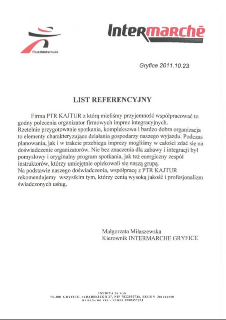 In te r m a r c h e Gryfice 2011.10.23 LIST REFERENCYJNY Firma PTR KAJTUR z którą mieliśmy przyjemność współpracować to godny polecenia organizator firmowych imprez integracyjnych. Rzetelnie przygotowanie spotkania, kompleksowa i bardzo dobra organizacja to elementy charakteryzujące działania gospodarzy naszego wyjazdu. Podczas planowania, jak i w trakcie przebiegu imprezy mogliśmy w całości zdać się na doświadczenie organizatorów. Nic bez znaczenia dla zabawy i integracji był pomysłowy i oryginalny program spotkania, jak też energiczny zespół instruktorów, którzy umiejętnie opiekowali się naszą grupą. Na podstawie naszego doświadczenia, współpracę z PTR KAJTUR rekomendujemy wszystkim tym, którzy cenią wysoką jakość i profesjonalizm świadczonych usług. Małgorzata Miłaszewska Kierownik INTERMARCHE GRYFICE