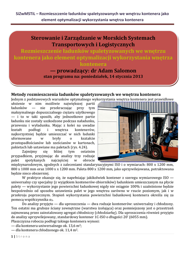 SiZwMSTiL – Rozmieszczenie ładunków spaletyzowanych we wnętrzu kontenera jako element optymalizacji wykorzystania wnętrza kontenera Sterowanie i Zarządzanie w Morskich Systemach Transportowych i Logistycznych Rozmieszczenie ładunków spaletyzowanych we wnętrzu kontenera jako element optymalizacji wykorzystania wnętrza kontenera — prowadzący: dr Adam Salomon stan programu na: poniedziałek, 14 stycznia 2013 Metody rozmieszczenia ładunków spaletyzowanych we wnętrzu kontenera Jednym z podstawowych warunków optymalnego wykorzystania wnętrza kontenera jest prawidłowe ułożenie w nim możliwie największej partii ładunków — nie przekraczając przy tym maksymalnego dopuszczalnego ciężaru użytkowego — i to w taki sposób, aby jednostkowe partie ładunku nie zostały uszkodzone podczas naładunku, przewozu i wyładunku. Mając z kolei na uwadze kształt podłogi i wnętrza kontenerów, najkorzystniej będzie umieszczać w nich ładunki uformowane w bryły o kształcie prostopadłościanów lub sześcianów w kartonach, pakietach lub ustawiane ma paletach (rys. 4.24). Zajmijmy się bliżej tym ostatnim przypadkiem, przyjmując do analizy trzy rodzaje palet spotykanych najczęściej w obrocie międzynarodowym, zgodnych z zaleceniami standaryzacyjnymi ISO i o wymiarach: 800 x 1200 mm, 800 x 1000 mm oraz 1000 x x 1200 mm. Paleta 800 x 1200 mm, jako uprzywilejowana, potraktowana będzie nieco obszerniej. W praktyce okazuje się, że napełniając jakikolwiek kontener z szeregu wymiarowego ISO — uniwersalny czy specjalny (z wyjątkiem kontenerów-zbiorników) ładunkiem umieszczanym na płycie palety — wykorzystanie jego powierzchni ładunkowej nigdy nie osiągnie 100% i uzależnione będzie bezpośrednio od sposobu ustawienia palet w jego wnętrzu zarówno w rzucie poziomym, jak i w przekroju poprzecznym. Stopień wykorzystania powierzchni ładunkowej kontenera określa się za pomocą współczynnika αS. Do analizy przyjęto — dla uproszczenia — dwa rodzaje kontenerów: uniwersalny i chłodzony. Ten ostatni ma grubsze ściany zewnętrzne (warstwa izolująca) oraz pomniejszony jest o przestrzeń zajmowaną przez zainstalowany agregat chłodniczy (chłodziarkę). Dla uproszczenia również przyjęto do analizy uprzywilejowany, standardowy kontener 1C-ISO o długości 20' (6055 mm). Płaszczyzna robocza podłogi takiego kontenera wynosi: — dla kontenera uniwersalnego ok. 13,6 m2; — dla kontenera chłodzonego ok. 11,4 m2. 1|Strona SiZwMSTiL – Rozmieszczenie ładunków spaletyzowanych we wnętrzu kontenera jako element optymalizacji wykorzystania wnętrza kontenera Wariant 1 Do kontenera uniwersalnego 1C-ISO (rys. 4.25) można wstawić, jeżeli ładunek umocowany jest na paletach o wymiarach: 1) 800 x 1200 mm (uprzywilejowanych) — 11 palet w jednej warstwie (αS = 0,78); 2) 800 x 1000 mm — 12 palet w jednej warstwie (αS = 0,71) lub 14 palet w jednej warstwie (αS = 0,82); 3) 1000 x 1200 mm — 10 palet w jednej warstwie (αS = 0,88) lub 9 palet w jednej warstwie (αS = 0,79). Wariant 2 Do kontenera chłodzonego 1C-ISO (rys. 4.26) można wstawić, jeżeli ładunek umocowany jest na paletach o wymiarach: 1) 1000 x 1200 mm — 8 palet w jednej warstwie; 2) 800 x 1200 mm (uprzywilejowanych)— 10 palet w jednej warstwie; 3) 800 x 1000 mm — 12 palet w jednej warstwie. Dla wszystkich trzech przypadków podanych w wariancie 2 współczynnik wykorzystania powierzchni kontenera αS jest jednakowy i wynosi 0,84. 2|Strona SiZwMSTiL – Rozmieszczenie ładunków spaletyzowanych we wnętrzu kontenera jako element optymalizacji wykorzystania wnętrza kontenera Jak z powyższego zestawienia wynika, w każdym przypadku istnieje niepełne wykorzystanie powierzchni kontenera w granicach od 12 do 29%. Wykorzystanie powierzchni jak również wnętrza (pojemności) kontenera zależy również w znacznym stopniu od tego, ile wejść (kieszeni) na wsunięcie wideł urządzenia ładunkowego ma paleta, na której znajduje się ładunek. W użyciu znajdują się palety dwu- lub czterowejściowe. Jak wynika z praktyki przewozowej, palety czterowejściowe można wykorzystywać bardziej operatywnie, zmieniać ich położenie w stosunku do osi wzdłużnej kontenera oraz podchodzić z widłami unoszącymi aż z czterech stron. Ma to istotne znaczenie dla możliwości rozlokowania palet z ładunkiem we wnętrzu kontenera, co potwierdza wykres przytoczony na rys. 4.27, na którym przedstawiono procentowe wykorzystanie wnętrza kontenera w zależności od wielkości palety oraz liczby wejść na widły ładunkowe. Dla tych samych palet różnica wynosi co najmniej 10% wykorzystania wnętrza kontenera, co stanowi dla kontenera 1C-ISO 20 t ok. 3 m3. W celu zabezpieczenia ładunku i palet przed przesuwaniem się po podłodze kontenera podczas prac ładunkowych oraz w czasie jego przewozu, stosuje się szereg różnych sposobów unieruchamiania ładunku. Najczęściej stosowane z nich to: — wypełnianie wolnych przestrzeni pomiędzy ładunkami na paletach oraz między ścianami bocznymi specjalnymi poduszkami gumowymi lub z tworzyw sztucznych, wkładając je albo już wypełnione powietrzem, w miarę jak układa się ładunek w kontenerze, albo wypełnione tylko częściowo, a następnie dopompowuje się je centralnie po całkowitym załadunku kontenera; każda z poduszek ma indywidualny zawór jednokierunkowy, który nie dopuszcza do ujścia z niej powietrza, jeżeli centralny przewód lub zawór zostanie uszkodzony; — mocowanie ładunku za pomocą taśmy z uchwytami do zamontowanych w tym celu wewnątrz specjalnych szyn wzdłuż ścian, podłogi i sufitu (sposób mocowania ładunku w 3|Strona SiZwMSTiL – Rozmieszczenie ładunków spaletyzowanych we wnętrzu kontenera jako element optymalizacji wykorzystania wnętrza kontenera kontenerze oraz kształt uchwytów i ich gniazd przedstawiono na rys. 4.28 i 4.29). W analogiczny sposób mocuje się również całe kontenery typu lotniczego w