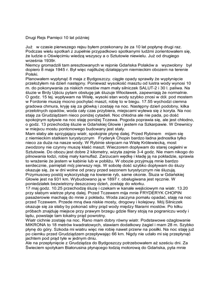 Drugi Rejs Pamięci 10 lat póżniej Już w czasie pierwszego rejsu byłem przekonany że za 10 lat popłynę drugi raz. Podczas wielu spotkań z zupełnie przypadkowo spotkanymi ludżmi zorientowałem się, że ludzie o Oświęcimiu wiedzą wszyscy a o Sztutowie niewielu. Już od drugiego września 1939r. Niemcy gromadzili tam aresztowanych w rejonie Gdańska Polaków a wyzwolony był dopiero 8 maja 1945 r. Był więc najdłużej działającym niemieckim obozem na terenie Polski. Planowałem wypłynąć 8 maja z Bydgoszczy. ciągłe opady sprawiły że wypłynięcie przełożyłem na dzień następny. Ponieważ wysokość masztu od lustra wody wynosi 10 m. do pokonywania za niskich mostów mam mały silniczek SALUT-2 i 30 l. paliwa. Na śluzie w Brdy Ujściu pytam obsługę jak śluzuje Włocławek, zapewniają że normalnie. O godz. 15 tej. wypływam na Wisłę, wysoki stan wody szybko znosi w dół. pod mostem w Fordonie muszę mocno pochylać maszt, robię to w biegu. 17.55 wychodzi ciemna gradowa chmura, kryję się za główką i zostaję na noc. Następny dzień podobny, kilka przelotnych opadów, woda cały czas przybiera, miejscami wylewa się z koryta. Na noc staję za Grudziądzem nieco poniżej cytadeli. Noc chłodna ale nie pada, po dość spokojnym spływie na noc staję poniżej Tczewa. Pogoda poprawia się, ale jest chłodno, o godz. 13 przechodzę śluzie w Gdańskiej Głowie i jestem na Szkarpawie. W Drewnicy w miejscu mostu pontonowego budowany jest stały. Mam słaby ale sprzyjający wiatr, spokojnie płynę dalej. Przed Rybinem mijam się z niemieckim statkiem turystycznym Fryderyk Chopin bardzo ładna jednostka tylko nieco za duża na nasze wody. W Rybinie skręcam na Wisłę Królewiecką, most zwodzony nie czynny muszę kłaść maszt. Wieczorem dopływam do starej cegielni w Sztutowie. Do obozu jest dobre 2 kilometry, wizyta zajmie 3-4 godz. Nie mam nikogo do pilnowania łodzi, robię mały kamuflaż. Zarzucam wędkę i kładę ją na pokładzie, sprawia to wrażenie że jestem w kabinie lub w pobliżu. W obozie przyjmują mnie bardzo serdecznie, pamiętali mój pierwszy rejs. W sobotę dość szybko dopływam do śluzy okazuje się, że w dni wolne od pracy przed sezonem turystycznym nie śluzują. Przymusowy postój wykorzystuję na łowienie ryb, same okonie. Śluza w Gdańskiej Głowie jest na 931 km. Wybudowano ją w 1897 r. obsługiwana jest ręcznie. W poniedziałek bezwietrzny deszczowy dzień, zostaję do wtorku. 17 maj godz. 10.25 przechodzę śluzę i czekam w kanale wejściowym na wiatr. 13.20 przy słabym wietrze płynę dalej. Przed Tczewem mija mnie FRYDERYK CHOPIN pasażerowie machają do mnie z pokładu. Woda zaczyna pomału opadać, staję na noc przed Tczewem. Przede mną dwa niskie mosty, drogowy i kolejowy. Mój Silniczek okazuje się za słaby by pokonać silny prąd wody między filarami mostów. Po kilku próbach znajduję miejsce przy prawym brzegu gdzie filary stoją na pograniczu wody i lądu, powstaje tam lokalny prąd powrotny. Wiatr cichnie zostaję na noc. Rano mam dobry równy wiatr. Podstawowe ożaglowanie MIKRONA to 18 metrów kwadratowych, stawiam dodatkowy żagiel i mam 28 m. Szybko płynę do góry. Szkoda mi wiatru więc nie robię nawet przerw na posiłki. Na noc staję już po ciemku przed Grudziądzem przepływając 66 km. Nigdy nie udało mi się przepłynąć jachtem pod prąd tyle w jednym dniu. Ale na przepłynięcie z Grudziądza do Bydgoszczy potrzebowałem aż sześciu dni. Za Świeciem spotykam Białorusina płynącego łodzią motorową do Gdańska, pyta mnie gdzie płynę. Mówię mu do Oświęcimia, a gdzie to pyta. Najpierw będzie Warszawa potem Kraków i dopiero Oświęcim. Nie przejdziesz Włocławek zamknięty na dwa miesiące do remontu, ja ostatni przechodziłem. W Bydgoszczy na śluzie ani w Inspektoracie Nadzoru Wodnego nic o tym nie wiedzą. Dopiero telefon do Włocławka wyjaśnia sprawę. Na moje pytanie jak to możliwe że śliza nie czynna, a oni nic o tym nie wiedzą mówią -my jesteśmy w Dyrekcji Gdańskiej a oni w warszawskiej. Miałem dwie możliwości, przerwać rejs albo przewieść jacht do Włocławka i zwodować na górnej wodzie. Wybrałem wariant drugi. Pływanie po rzece takiej jak Wisła wyłącznie na żaglach w porównaniu z pływaniem po jeziorach to są dwa odrębne światy, dotyczy to warunków pływania jak i sprzętu na którym chcemy pływać. Na jeziorze można dopłynąć w dowolne miejsce przy każdym wietrze, na rzece podczas pływania pod prąd można wykorzystywać tylko wiatry od dołu rzeki lub lekko z boku [ bakrztagi]. Rzeka nie płynie równo swoim korytem lecz jej główny nurt meandruje od brzegu do brzegu. Na przykład płynąc w kierunku lewego brzegu mamy dobry boczny wiatr, po zwrocie w prawo wiatr jest przeciwny i pokonanie takiego odcinka rzeki staje się często nie możliwe. 28 maj sobota, przewozimy jacht do Włocławka i wodujemy w klubie BRYZA na górnej wodzie. Jest ładna ciepła pogoda lecz bardzo słaby wiatr. Do wieczora ledwo dopływam do przystani przy ośrodku wypoczynkowym w Wistce Szlacheckiej. Staję razem z trzema jachtami z Włocławka, bardzo sympatyczne załogi przy ognisku i szantach przesiedzieliśmy do pierwszej w nocy. Następny dzień prawie bezwietrzny ledwo dopływam do Płocka. Po krótkim postoju wypływam dalej, przed nowym mostem obejrzałem się do tyłu, na horyzoncie widoczna była cienka smuga zachmurzenia, nie zlekceważyłem tego i chciałem dojść do pobliskiej wyspy i poczekać co będzie. Niestety front zmiany pogody znacznie wyprzedzał widoczne zachmurzenie, gdy się zorientowałem zacząłem robić zwrot na wiatr lecz z powodu braku szybkości manewr ten wykonywany był bardzo powoli. W połowie zwrotu dostałem silne uderzenie wiatru, jachtem po prostu rzuciło i wyłożyłem się na bok dziobem zwrócony do wiatru. To prawdopodobnie uratowało mnie przed całkowitą wywrotką. Wszystko z kokpitu poleciało do wo