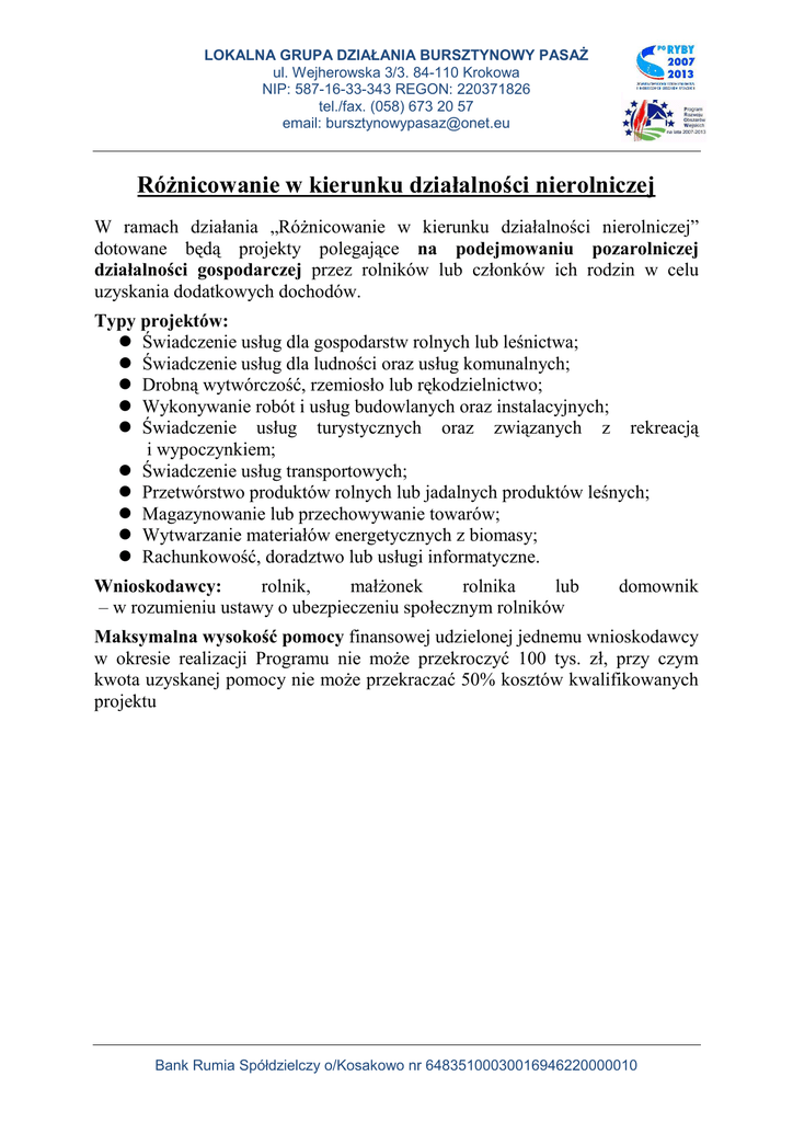LOKALNA GRUPA DZIAŁANIA BURSZTYNOWY PASAś ul. Wejherowska 3/3. 84-110 Krokowa NIP: 587-16-33-343 REGON: 220371826 tel./fax. (058) 673 20 57 email: [email protected] RóŜnicowanie w kierunku działalności nierolniczej W ramach działania „RóŜnicowanie w kierunku działalności nierolniczej” dotowane będą projekty polegające na podejmowaniu pozarolniczej działalności gospodarczej przez rolników lub członków ich rodzin w celu uzyskania dodatkowych dochodów. Typy projektów: Świadczenie usług dla gospodarstw rolnych lub leśnictwa; Świadczenie usług dla ludności oraz usług komunalnych; Drobną wytwórczość, rzemiosło lub rękodzielnictwo; Wykonywanie robót i usług budowlanych oraz instalacyjnych; Świadczenie usług turystycznych oraz związanych z rekreacją i wypoczynkiem; Świadczenie usług transportowych; Przetwórstwo produktów rolnych lub jadalnych produktów leśnych; Magazynowanie lub przechowywanie towarów; Wytwarzanie materiałów energetycznych z biomasy; Rachunkowość, doradztwo lub usługi informatyczne. Wnioskodawcy: rolnik, małŜonek rolnika lub – w rozumieniu ustawy o ubezpieczeniu społecznym rolników domownik Maksymalna wysokość pomocy finansowej udzielonej jednemu wnioskodawcy w okresie realizacji Programu nie moŜe przekroczyć 100 tys. zł, przy czym kwota uzyskanej pomocy nie moŜe przekraczać 50% kosztów kwalifikowanych projektu Bank Rumia Spółdzielczy o/Kosakowo nr 64835100030016946220000010