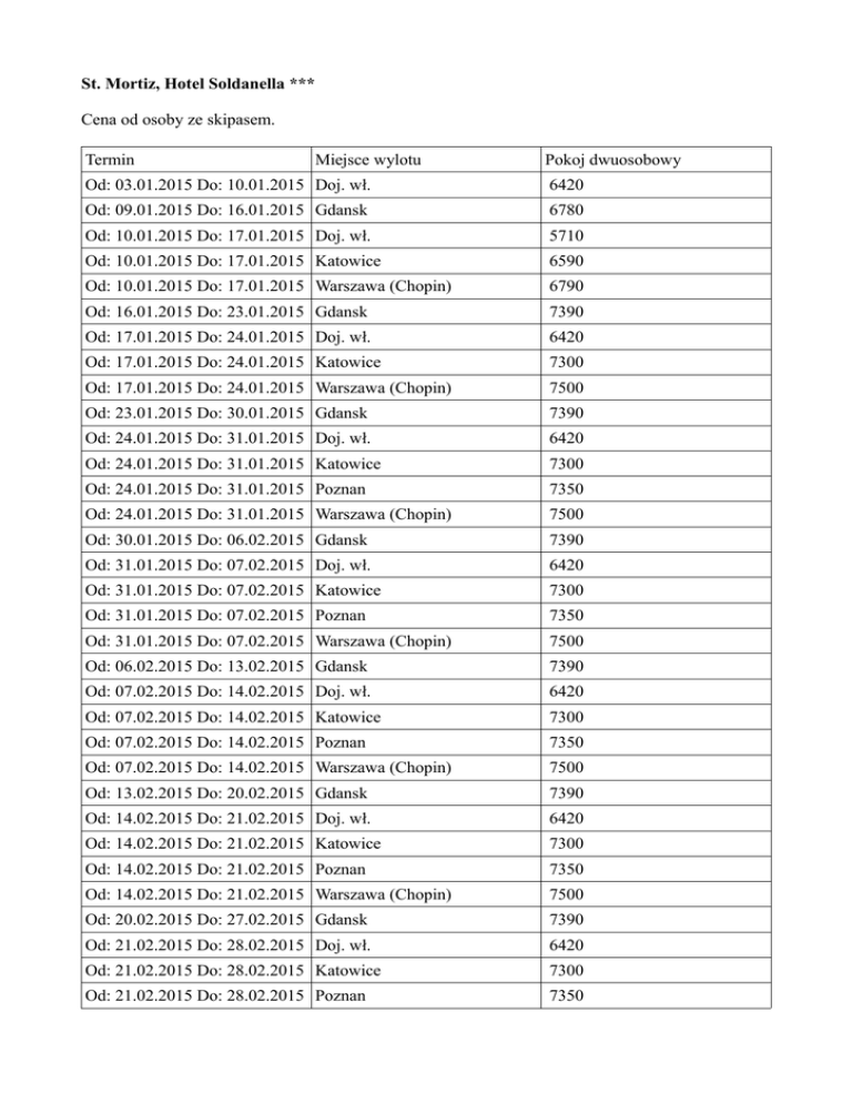 St. Mortiz, Hotel Soldanella *** Cena od osoby ze skipasem. Termin Miejsce wylotu Pokoj dwuosobowy Od: 03.01.2015 Do: 10.01.2015 Doj. wł. 6420 Od: 09.01.2015 Do: 16.01.2015 Gdansk 6780 Od: 10.01.2015 Do: 17.01.2015 Doj. wł. 5710 Od: 10.01.2015 Do: 17.01.2015 Katowice 6590 Od: 10.01.2015 Do: 17.01.2015 Warszawa (Chopin) 6790 Od: 16.01.2015 Do: 23.01.2015 Gdansk 7390 Od: 17.01.2015 Do: 24.01.2015 Doj. wł. 6420 Od: 17.01.2015 Do: 24.01.2015 Katowice 7300 Od: 17.01.2015 Do: 24.01.2015 Warszawa (Chopin) 7500 Od: 23.01.2015 Do: 30.01.2015 Gdansk 7390 Od: 24.01.2015 Do: 31.01.2015 Doj. wł. 6420 Od: 24.01.2015 Do: 31.01.2015 Katowice 7300 Od: 24.01.2015 Do: 31.01.2015 Poznan 7350 Od: 24.01.2015 Do: 31.01.2015 Warszawa (Chopin) 7500 Od: 30.01.2015 Do: 06.02.2015 Gdansk 7390 Od: 31.01.2015 Do: 07.02.2015 Doj. wł. 6420 Od: 31.01.2015 Do: 07.02.2015 Katowice 7300 Od: 31.01.2015 Do: 07.02.2015 Poznan 7350 Od: 31.01.2015 Do: 07.02.2015 Warszawa (Chopin) 7500 Od: 06.02.2015 Do: 13.02.2015 Gdansk 7390 Od: 07.02.2015 Do: 14.02.2015 Doj. wł. 6420 Od: 07.02.2015 Do: 14.02.2015 Katowice 7300 Od: 07.02.2015 Do: 14.02.2015 Poznan 7350 Od: 07.02.2015 Do: 14.02.2015 Warszawa (Chopin) 7500 Od: 13.02.2015 Do: 20.02.2015 Gdansk 7390 Od: 14.02.2015 Do: 21.02.2015 Doj. wł. 6420 Od: 14.02.2015 Do: 21.02.2015 Katowice 7300 Od: 14.02.2015 Do: 21.02.2015 Poznan 7350 Od: 14.02.2015 Do: 21.02.2015 Warszawa (Chopin) 7500 Od: 20.02.2015 Do: 27.02.2015 Gdansk 7390 Od: 21.02.2015 Do: 28.02.2015 Doj. wł. 6420 Od: 21.02.2015 Do: 28.02.2015 Katowice 7300 Od: 21.02.2015 Do: 28.02.2015 Poznan 7350 Od: 21.02.2015 Do: 28.02.2015 Warszawa (Chopin) 7500 Od: 27.02.2015 Do: 06.03.2015 Gdansk 7390 Od: 28.02.2015 Do: 07.03.2015 Doj. wł. 6420 Od: 28.02.2015 Do: 07.03.2015 Katowice 7300 Od: 28.02.2015 Do: 07.03.2015 Poznan 7350 Od: 28.02.2015 Do: 07.03.2015 Warszawa (Chopin) 7500 Od: 06.03.2015 Do: 13.03.2015 Gdansk 6880 Od: 07.03.2015 Do: 14.03.2015 Doj. wł. 5810 Od: 07.03.2015 Do: 14.03.2015 Katowice 6690 Od: 07.03.2015 Do: 14.03.2015 Poznan 6740 Od: 07.03.2015 Do: 14.03.2015 Warszawa (Chopin) 6890 Od: 13.03.2015 Do: 20.03.2015 Gdansk 6680 Od: 14.03.2015Do: 21.03.2015 Doj. wł. 5710 Od: 14.03.2015 Do: 21.03.2015 Katowice 6590 Od: 14.03.2015 Do: 21.03.2015 Poznan 6630 Od: 14.03.2015 Do: 21.03.2015 Warszawa (Chopin) 6790 Od: 20.03.2015 Do: 27.03.2015 Gdansk 6680 Od: 21.03.2015 Do: 28.03.2015 Doj. wł. 5710 Od: 21.03.2015 Do: 28.03.2015 Katowice 6590 Od: 21.03.2015 Do: 28.03.2015 Warszawa (Chopin) 6790 Od: 27.03.2015 Do: 03.04.2015 Gdansk 6680 Od: 28.03.2015 Do: 04.04.2015 Doj. wł. 5710 Od: 28.03.2015 Do: 04.04.2015 Katowice 6590 Od: 28.03.2015 Do: 04.04.2015 Warszawa (Chopin) 6790