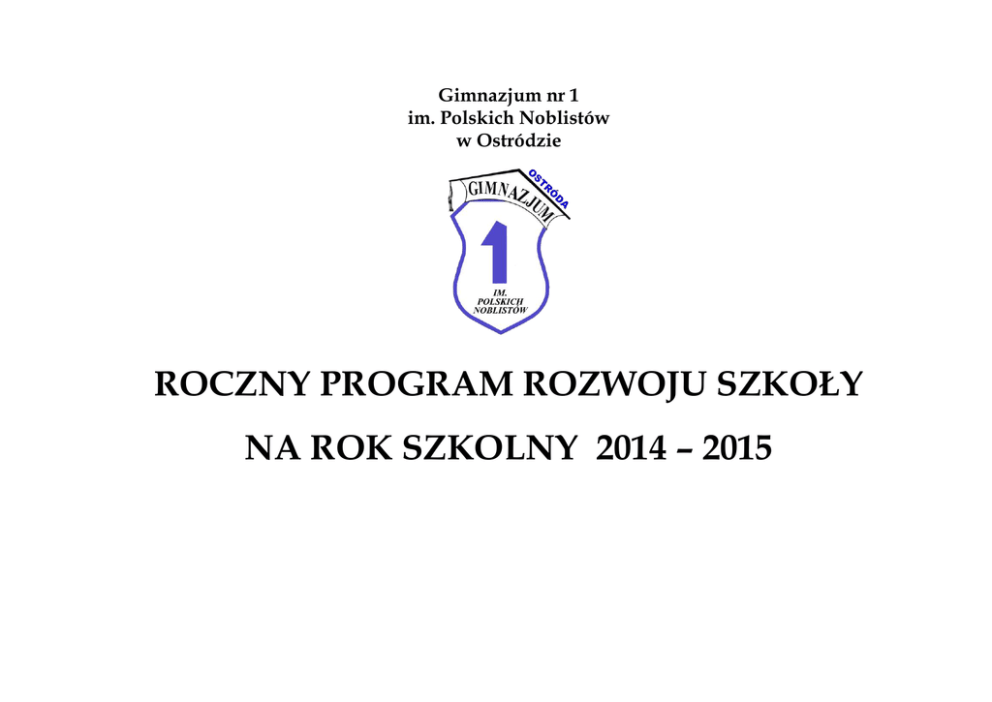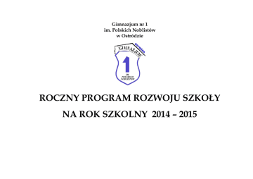 Gimnazjum nr 1 im. Polskich Noblistów w Ostródzie ROCZNY PROGRAM ROZWOJU SZKOŁY NA ROK SZKOLNY 2014 – 2015 Gimnazjum nr 1 im. Polskich Noblistów w Ostródzie ROCZNY PROGRAM ROZWOJU SZKOŁY NA ROK SZKOLNY 2014-2015 _____________________________________________________________________________________________________________________________ ___________________________________________________________________________________________________________________________________________________________________________________________________________________________________________________ Gimnazjum nr 1 im. Polskich Noblistów w Ostródzie dąży do tego, aby być szkołą bezpieczną i przyjazną uczniowi. Dobrze przygotować do egzaminu gimnazjalnego, podjęcia nauki w szkole ponadgimnazjalnej i życia w zjednoczonej Europie. Stara się, by każdy uczeń, w miarę swoich możliwości, osiągał sukcesy w różnych sferach: naukowej, artystycznej, sportowej i społecznej. Zadowolenie, satysfakcja i prestiż szkoły w środowisku to cel, do którego dążymy. 2 Gimnazjum nr 1 im. Polskich Noblistów w Ostródzie ROCZNY PROGRAM ROZWOJU SZKOŁY NA ROK SZKOLNY 2014-2015 _____________________________________________________________________________________________________________________________ ___________________________________________________________________________________________________________________________________________________________________________________________________________________________________________________ KONCEPCJA SZKOŁY Działamy po to, aby: NASI UCZNIOWIE: byli solidnie przygotowani do dalszej nauki i demokratycznego życia w zjednoczonej Europie, reprezentowali wysoki poziom kultury, odznaczali się życzliwością i tolerancją wobec siebie i innych, darzyli się wzajemnym szacunkiem, prezentowali właściwą postawę wobec środowiska naturalnego, podejmowali racjonalne decyzje dotyczące zdrowego stylu życia, byli aktywni społecznie, działali bezinteresownie na rzecz drugiego człowieka, utożsamiali się z własnym regionem – swoją mała ojczyzną. ICH RODZICE: wspierali swoje dzieci w nauce, a nauczycieli w pracy dydaktycznej, wychowawczej, opiekuńczej, interesowali się rozwojem i postępami swojego dziecka, byli wzorem postaw i zachowań, jako partnerzy wspierali działania podejmowane przez szkołę oraz aktywnie uczestniczyli w jej życiu. 3 Gimnazjum nr 1 im. Polskich Noblistów w Ostródzie ROCZNY PROGRAM ROZWOJU SZKOŁY NA ROK SZKOLNY 2014-2015 _____________________________________________________________________________________________________________________________ ___________________________________________________________________________________________________________________________________________________________________________________________________________________________________________________ SZKOŁA: stara się być przyjazną uczniom i szkołą dla wszystkich, dzięki temu że: zapewnia uczniom właściwą jakość nauczania, wychowania i opieki, oferuje zajęcia rozwijające zainteresowania ucznia, troszczy się o każdego ucznia i wspiera go jako niepowtarzalną jednostkę, tworzy życzliwą i bezpieczną atmosferę opartą na kulturze osobistej nauczycieli, pracowników administracyjno – technicznych, uczniów i rodziców, szacunku, akceptacji oraz wzajemnej pomocy i współpracy, ceni każdego pracownika szkoły jako indywidualność i specjalistę, stwarza warunki do rozwoju ucznia w dziedzinie samorządności i wolontariatu, umożliwia i wspiera tworzenie i realizację własnych projektów i inicjatyw. Pracę wychowawczą opiera na: wskazywaniu właściwego systemu wartości wynikającego z tożsamości szkoły, przydatności do budowania godnego i indywidualnego życia w społeczeństwie, kształtowaniu systematyczności, obowiązkowości i odpowiedzialności za siebie i innych, promocji zdrowego stylu życia. Nauczyciele: podnoszą swoje kwalifikacje zgodnie z potrzebami placówki, prowadzą działania mające na celu podwyższanie jakości pracy szkoły, wspierają swoimi umiejętnościami uczniów i rodziców, dbają o sukces każdego ucznia jako indywidualnej jednostki. 4 Gimnazjum nr 1 im. Polskich Noblistów w Ostródzie ROCZNY PROGRAM ROZWOJU SZKOŁY NA ROK SZKOLNY 2014-2015 _____________________________________________________________________________________________________________________________ ___________________________________________________________________________________________________________________________________________________________________________________________________________________________________________________ Pracownicy szkoły w swojej pracy wychowawczej winni zmierzać do tego, aby uczniowie: znajdowali w szkole środowisko wszechstronnego rozwoju osobowego, rozwijali w sobie dociekliwość poznawczą ukierunkowaną na poszukiwanie prawdy, dobra i piękna w świecie, mieli świadomość życiowej użyteczności zdobywanej wiedzy i nabywanych umiejętności, dążyli na drodze rzetelnej pracy do osiągnięcia celów życiowych, uczyli się szacunku dla dobra wspólnego jako podstawy życia społecznego, przygotowywali się do życia w rodzinie, w społeczności lokalnej, regionalnej, ogólnonarodowej i europejskiej w duchu przekazu dziedzictwa kulturowego i kształtowania postaw patriotycznych, kształtowali postawę wrażliwości, tolerancji oraz umiejętności słuchania innych. 5 Gimnazjum nr 1 im. Polskich Noblistów w Ostródzie ROCZNY PROGRAM ROZWOJU SZKOŁY NA ROK SZKOLNY 2014-2015 _____________________________________________________________________________________________________________________________ ___________________________________________________________________________________________________________________________________________________________________________________________________________________________________________________ WSTĘP Szkoła pełni trzy podst