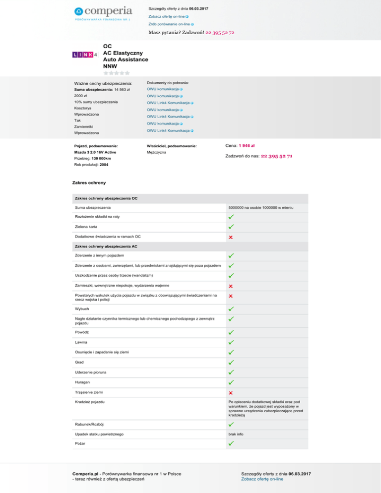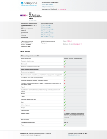 Szczegóły oferty z dnia 06.03.2017 Zobacz ofertę on-line Zrób porównanie on-line Masz pytania? Zadzwoń! 22 395 52 72 OC AC Elastyczny Auto Assistance NNW Ważne cechy ubezpieczenia: Dokumenty do pobrania: Suma ubezpieczenia: 14 563 zł OWU komunikacja 2000 zł OWU komunikacja 10% sumy ubezpieczenia OWU Link4 Komunikacja Kosztorys OWU komunikacja Wprowadzona Tak Zamienniki Wprowadzona OWU Link4 Komunikacja OWU komunikacja OWU Link4 Komunikacja Pojazd, podsumowanie: Właściciel, podsumowanie: Mazda 3 2.0 16V Active Mężczyzna Przebieg: 130 000km Cena: 1 946 zł Zadzwoń do nas: 22 395 52 71 Rok produkcji: 2004 Zakres ochrony Zakres ochrony ubezpieczenia OC Suma ubezpieczenia 5000000 na osobie 1000000 w mieniu Rozłożenie składki na raty Zielona karta Dodatkowe świadczenia w ramach OC Zakres ochrony ubezpieczenia AC Zderzenie z innym pojazdem Zderzenie z osobami, zwierzętami, lub przedmiotami znajdującymi się poza pojazdem Uszkodzenie przez osoby trzecie (wandalizm) Zamieszki, wewnętrzne niepokoje, wydarzenia wojenne Powstałych wskutek użycia pojazdu w związku z obowiązującymi świadczeniami na rzecz wojska i policji Wybuch Nagłe działanie czynnika termicznego lub chemicznego pochodzącego z zewnątrz pojazdu Powódź Lawina Osunięcie i zapadanie się ziemi Grad Uderzenie pioruna Huragan Trzęsienie ziemi Kradzież pojazdu Po opłaceniu dodatkowej składki oraz pod warunkiem, że pojazd jest wyposażony w sprawne urządzenia zabezpieczające przed kradzieżą Rabunek/Rozbój Upadek statku powietrznego brak info Pożar Comperia.pl - Porównywarka finansowa nr 1 w Polsce - teraz również z ofertą ubezpieczeń Szczegóły oferty z dnia 06.03.2017 Zobacz ofertę on-line Szczegóły oferty z dnia 06.03.2017 Zobacz ofertę on-line Zrób porównanie on-line Masz pytania? Zadzwoń! 22 395 52 72 Zakres ochrony Assistance Suma ubezpieczenia brak Zakres terytorialny Polska i Europa z tym, że Turca tylko w części europejskiej Wiek pojazdu do którego można wykupić ubezpieczenie brak Rodzaj pojazdu na który można wykupić ubezpieczenie samochody osobowe, Ciężarowo-osobowe, Ciężarowe do 3,5 t Ograniczenia ze względu na sposób użytkowania pojazdu (np. taxi, nauka jazdy, rent a car) Opcje zawarcia Usprawnienie pojazdu na miejscu zdarzenia z OC i/lub AC Polska 400 zł. Europa1000 zł. Pomoc w razie awarii Pomoc w razie wypadku Limit odległości od miejsca zamieszkania Miejsce holowania Polska i Europa do 100 km do wskazanego miejsca Samochód zastępczy 7 dni ( po kradzieży lub wypadku) Złomowanie pojazdu Polska -500 zł. Europa 1000 zł. Parkowanie pojazdu Transport zastępczy/przewóz osób Nocleg/zakwaterowanie Dodatkowe informacje Do 3 dób Polska 400 zł. Europa 1000 zł. (jeśli odległość przekracza 20 km od miejsca zamieszkania ) 1 doba otwarcie pojazdu w przypadku utraty lub zniszczenia kluczyków, opieka nad zwierzętami, infolinia medyczna, dostarczenie paliwa Zakres ochrony NNW Suma ubezpieczenia Wypłata świadczenia w razie śmierci Jeżeli zmarł w przeciągu 2 lat od daty nieszczęśliwego wypadku wówczas przysługuje 50% świadczenia Wsiadanie i wysiadanie z pojazdu Załadowanie lub wyładowanie pojazdu Pożar, wybuch pojazdu Zatrzymanie, postój, naprawa pojazdu Podwójne świadczenie w przypadku 90% trwałego uszczerbku na zdrowiu Garażowanie pojazdu Terytorium ochrony Terytorium ochrony ubezpieczenia AC Kraje Unii Europejskiej Algeria Albania Libia Maroko Mołdawia Z wyłączeniem kradzieży i wyposażenia Białoruś Z wyłączeniem kradzieży i wyposażenia Comperia.pl - Porównywarka finansowa nr 1 w Polsce - teraz również z ofertą ubezpieczeń Szczegóły oferty z dnia 06.03.2017 Zobacz ofertę on-line Szczegóły oferty z dnia 06.03.2017 Zobacz ofertę on-line Zrób porównanie on-line Masz pytania? Zadzwoń! 22 395 52 72 Rosja (część europejska) Z wyłączeniem kradzieży i wyposażenia Czarnogóra Serbia Bośnia i Hercegowina Tunezja Iran Turcja Izrael Ukraina Z wyłączenie kradzieży i wyposażenia Wyłączenia Wyłączenia ubezpieczenia AC Udział własny w szkodzie W szkodach wypadkowych w wysokości 500, 1000, 2000 zł. lub jego brak, w kradzieżowych 10 sumy ubezpieczenia lub brak Amortyzacja za części Możliwość zniesienia lub wprowadzenia Rodzaj stacji naprawczej (ze względu na metodę naprawy) Wariant kosztorys, wariant warsztatrachunki I faktury Rodzaj używanych części do naprawy W wariancie warsztat auta do 5 lat są naprawiane częściami oryginalnymi zaś powyżej 5 lat części alternatywne Okres eksploatacji pojazdu w jakim można wykupić polisę AutoCasco Do 15 lat Minimalna szkoda (franszyza integralna) 500 zł. Szkoda została spowodowana wskutek rażącego niedbalstwa Kierowanie pojazdem w stanie nietrzeźwości, po zażyciu alkoholu, środków odurzających, substancji psychotropowych, lub jego pochodnych Kierujący pojazdem nie posiadał uprawnień do prowadzenia pojazdu Sprawca zbiegł lub oddalił się z miejsca zdarzenia Pojazd nie miał ważnego przeglądu technicznego lub nie jest dopuszczony do ruchu Przywłaszczenie pojazdu Kradzież wyposażenia dodatkowego wypłaci, jeśli zostało doubezpieczone wyposażenie dodatkowe Uszkodzenie wyposażenia dodatkowego pojazdu wypłaci, jeśli zostało doubezpieczone wyposażenie dodatkowe Wada fabryczna pojazdu, jego naprawa, użytkowanie w sposób niezgodny z jego przeznaczeniem Uszkodzenie lub zniszczenie ogumienia Chyba że uszkodzeniu lub zniszczeniu uległy również inne części pojazdu Konsumpcja sumy ubezpieczenia brak info Szyby Nie powoduje utraty zniżek jeżeli naprawa będzie w warsztacie wskazanym przez ubezpieczyciela Wartość pojazdu Z dnia szkody Zasada proporcji brak info Dodatkowe wyłączenia Przekroczenie prędkości o 30 km, naruszenie zakazu wyprzedzania lub przekroczenia podwójnej linii ciągłej, rozmowa przez tel. Bez zestawu głośnomówiącego, złamanie nakazu lub zakazu wjazdu- zmniejszenie odszkodowania o 30% Młody kiero