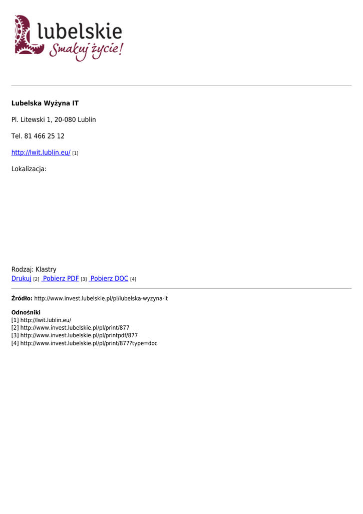 Lubelska Wyżyna IT Pl. Litewski 1, 20-080 Lublin Tel. 81 466 25 12 http://lwit.lublin.eu/ [1] Lokalizacja: Rodzaj: Klastry Drukuj [2] Pobierz PDF [3] Pobierz DOC [4] Źródło: http://www.invest.lubelskie.pl/pl/lubelska-wyzyna-it Odnośniki [1] http://lwit.lublin.eu/ [2] http://www.invest.lubelskie.pl/pl/print/877 [3] http://www.invest.lubelskie.pl/pl/printpdf/877 [4] http://www.invest.lubelskie.pl/pl/print/877?type=doc