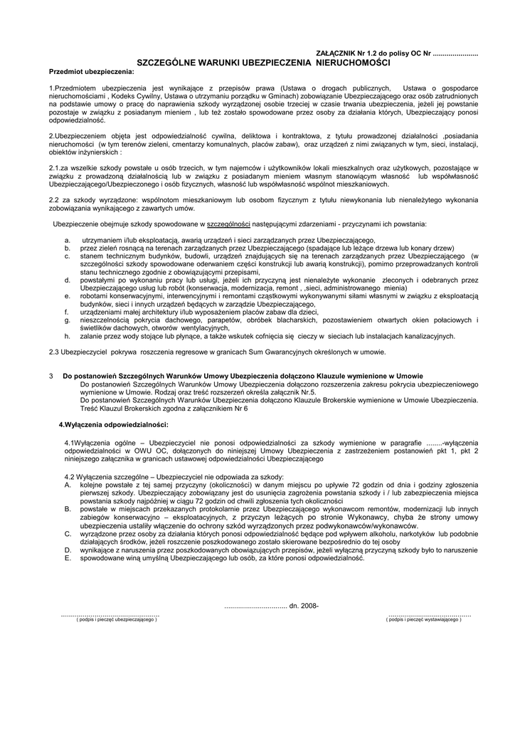 ZAŁĄCZNIK Nr 1.2 do polisy OC Nr ....................... SZCZEGÓLNE WARUNKI UBEZPIECZENIA NIERUCHOMOŚCI Przedmiot ubezpieczenia: 1.Przedmiotem ubezpieczenia jest wynikające z przepisów prawa (Ustawa o drogach publicznych, Ustawa o gospodarce nieruchomościami , Kodeks Cywilny, Ustawa o utrzymaniu porządku w Gminach) zobowiązanie Ubezpieczającego oraz osób zatrudnionych na podstawie umowy o pracę do naprawienia szkody wyrządzonej osobie trzeciej w czasie trwania ubezpieczenia, jeżeli jej powstanie pozostaje w związku z posiadanym mieniem , lub też zostało spowodowane przez osoby za działania których, Ubezpieczający ponosi odpowiedzialność. 2.Ubezpieczeniem objęta jest odpowiedzialność cywilna, deliktowa i kontraktowa, z tytułu prowadzonej działalności ,posiadania nieruchomości (w tym terenów zieleni, cmentarzy komunalnych, placów zabaw), oraz urządzeń z nimi związanych w tym, sieci, instalacji, obiektów inżynierskich : 2.1.za wszelkie szkody powstałe u osób trzecich, w tym najemców i użytkowników lokali mieszkalnych oraz użytkowych, pozostające w związku z prowadzoną działalnością lub w związku z posiadanym mieniem własnym stanowiącym własność lub współwłasność Ubezpieczającego/Ubezpieczonego i osób fizycznych, własność lub współwłasność wspólnot mieszkaniowych. 2.2 za szkody wyrządzone: wspólnotom mieszkaniowym lub osobom fizycznym z tytułu niewykonania lub nienależytego wykonania zobowiązania wynikającego z zawartych umów. Ubezpieczenie obejmuje szkody spowodowane w szczególności następującymi zdarzeniami - przyczynami ich powstania: a. b. c. d. e. f. g. h. utrzymaniem i/lub eksploatacją, awarią urządzeń i sieci zarządzanych przez Ubezpieczającego, przez zieleń rosnącą na terenach zarządzanych przez Ubezpieczającego (spadające lub leżące drzewa lub konary drzew) stanem technicznym budynków, budowli, urządzeń znajdujących się na terenach zarządzanych przez Ubezpieczającego (w szczególności szkody spowodowane oderwaniem części konstrukcji lub awarią konstrukcji), pomimo przeprowadzanych kontroli stanu technicznego zgodnie z obowiązującymi przepisami, powstałymi po wykonaniu pracy lub usługi, jeżeli ich przyczyną jest nienależyte wykonanie zleconych i odebranych przez Ubezpieczającego usług lub robót (konserwacja, modernizacja, remont , ,sieci, administrowanego mienia) robotami konserwacyjnymi, interwencyjnymi i remontami cząstkowymi wykonywanymi siłami własnymi w związku z eksploatacją budynków, sieci i innych urządzeń będących w zarządzie Ubezpieczającego, urządzeniami małej architektury i/lub wyposażeniem placów zabaw dla dzieci, nieszczelnością pokrycia dachowego, parapetów, obróbek blacharskich, pozostawieniem otwartych okien połaciowych i świetlików dachowych, otworów wentylacyjnych, zalanie przez wody stojące lub płynące, a także wskutek cofnięcia się cieczy w sieciach lub instalacjach kanalizacyjnych. 2.3 Ubezpieczyciel pokrywa roszczenia regresowe w granicach Sum Gwarancyjnych określonych w umowie. 3 Do postanowień Szczególnych Warunków Umowy Ubezpieczenia dołączono Klauzule wymienione w Umowie Do postanowień Szczególnych Warunków Umowy Ubezpieczenia dołączono rozszerzenia zakresu pokrycia ubezpieczeniowego wymienione w Umowie. Rodzaj oraz treść rozszerzeń określa załącznik Nr.5. Do postanowień Szczególnych Warunków Ubezpieczenia dołączono Klauzule Brokerskie wymienione w Umowie Ubezpieczenia. Treść Klauzul Brokerskich zgodna z załącznikiem Nr 6 4.Wyłączenia odpowiedzialności: 4.1Wyłączenia ogólne – Ubezpieczyciel nie ponosi odpowiedzialności za szkody wymienione w paragrafie ........-wyłączenia odpowiedzialności w OWU OC, dołączonych do niniejszej Umowy Ubezpieczenia z zastrzeżeniem postanowień pkt 1, pkt 2 niniejszego załącznika w granicach ustawowej odpowiedzialności Ubezpieczającego 4.2 Wyłączenia szczególne – Ubezpieczyciel nie odpowiada za szkody: A. kolejne powstałe z tej samej przyczyny (okoliczności) w danym miejscu po upływie 72 godzin od dnia i godziny zgłoszenia pierwszej szkody. Ubezpieczający zobowiązany jest do usunięcia zagrożenia powstania szkody i / lub zabezpieczenia miejsca powstania szkody najpóźniej w ciągu 72 godzin od chwili zgłoszenia tych okoliczności B. powstałe w miejscach przekazanych protokolarnie przez Ubezpieczającego wykonawcom remontów, modernizacji lub innych zabiegów konserwacyjno – eksploatacyjnych, z przyczyn leżących po stronie Wykonawcy, chyba że strony umowy ubezpieczenia ustaliły włączenie do ochrony szkód wyrządzonych przez podwykonawców/wykonawców. C. D. E. wyrządzone przez osoby za działania których ponosi odpowiedzialność będące pod wpływem alkoholu, narkotyków lub podobnie działających środków, jeżeli roszczenie poszkodowanego zostało skierowane bezpośrednio do tej osoby wynikające z naruszenia przez poszkodowanych obowiązujących przepisów, jeżeli wyłączną przyczyną szkody było to naruszenie spowodowane winą umyślną Ubezpieczającego lub osób, za które ponosi odpowiedzialność. ................................ dn. 2008.................................................. ( podpis i pieczęć ubezpieczającego ) .......................................... ( podpis i pieczęć wystawiającego )