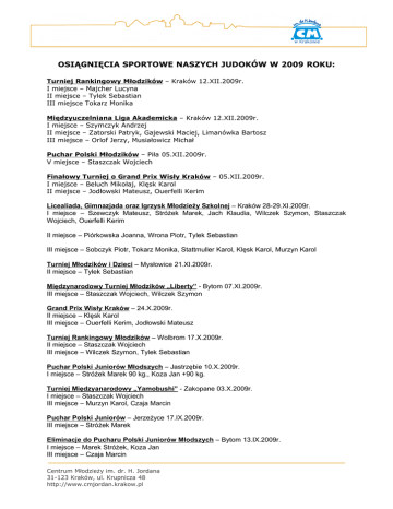 OSIĄGNIĘCIA SPORTOWE NASZYCH JUDOKÓW W 2009 ROKU: Turniej Rankingowy Młodzików – Kraków 12.XII.2009r. I miejsce – Majcher Lucyna II miejsce – Tylek Sebastian III miejsce Tokarz Monika Międzyuczelniana Liga Akademicka – Kraków 12.XII.2009r. I miejsce – Szymczyk Andrzej II miejsce – Zatorski Patryk, Gajewski Maciej, Limanówka Bartosz III miejsce – Orlof Jerzy, Musiałowicz Michał Puchar Polski Młodzików – Piła 05.XII.2009r. V miejsce – Staszczak Wojciech Finałowy Turniej o Grand Prix Wisły Kraków – 05.XII.2009r. I miejsce – Beluch Mikołaj, Klęsk Karol II miejsce – Jodłowski Mateusz, Ouerfelli Kerim Licealiada, Gimnazjada oraz Igrzysk Młodzieży Szkolnej – Kraków 28-29.XI.2009r. I miejsce – Szewczyk Mateusz, Stróżek Marek, Jach Klaudia, Wilczek Szymon, Staszczak Wojciech, Ouerfelli Kerim II miejsce – Piórkowska Joanna, Wrona Piotr, Tylek Sebastian III miejsce – Sobczyk Piotr, Tokarz Monika, Stattmuller Karol, Klęsk Karol, Murzyn Karol Turniej Młodzików i Dzieci – Mysłowice 21.XI.2009r. II miejsce – Tylek Sebastian Międzynarodowy Turniej Młodzików „Liberty” - Bytom 07.XI.2009r. III miejsce – Staszczak Wojciech, Wilczek Szymon Grand Prix Wisły Kraków – 24.X.2009r. II miejsce – Klęsk Karol III miejsce – Ouerfelli Kerim, Jodłowski Mateusz Turniej Rankingowy Młodzików – Wolbrom 17.X.2009r. II miejsce – Staszczak Wojciech III miejsce – Wilczek Szymon, Tylek Sebastian Puchar Polski Juniorów Młodszych – Jastrzębie 10.X.2009r. I miejsce – Stróżek Marek 90 kg., Koza Jan +90 kg. Turniej Międzyanarodowy „Yamobushi” - Zakopane 03.X.2009r. I miejsce – Staszczak Wojciech III miejsce – Murzyn Karol, Czaja Marcin Puchar Polski Juniorów – Jerzeżyce 17.IX.2009r. III miejsce – Stróżek Marek Eliminacje do Pucharu Polski Juniorów Młodszych – Bytom 13.IX.2009r. I miejsce – Marek Stróżek, Koza Jan III miejsce – Czaja Marcin Centrum Młodzieży im. dr. H. Jordana 31-123 Kraków, ul. Krupnicza 48 http://www.cmjordan.krakow.pl Eliminacje do Pucharu Polski Juniorów – Bytom 06.IX.2009r. III miejsce – Stróżek Marek Mistrzostwa Europy Kadetów – Słowenia 26-28VI.2009r. Marek Stróżek – udział kategoria wagowa do 90 kg. Międzywojewódzkie Mistrzostwa Młodzików – Bytom 06.VI.2009r. I miejsce – Wilczek Szymon III miejsce – Staszczak Wojciech Gran Prix Wisły Kraków – 31.V.2009r. II miejsce – Jędrusiak Karol, Klęsk Karol, Kaczmarczyk Franciszek III miejsce – Jodłowski Mateusz, Kijewski Kamil, Zyss Aleksandra Międzynarodowe Mistrzostwa Łodzi – 31.V.2009r. III miejsce – Szewczyk Mateusz VII miejsce – Limanówka Bartosz, Stróżek Marek Mistrzostwa Województwa Małopolskiego Juniorów – Kęty 30.V.2009r. I miejsce – Limanówka Bartosz II miejsce – Szewczyk Mateusz, Guzik Mariusz, Orlof Jerzy, Murzyn Karol, Mistarz Patryk, Czaja Marcin III miejsce – Borzemski Amadeusz, Sobczyk Piotr, Pers Mateusz, Koza Jan Puchar Europy Juniorów Młodszych – Szczyrk 23-24.V.2009r. II miejsce – Stróżek Marek 90 kg. Turniej Międzynarodowy Dzieci i Młodzików – Tuchów 16.V.2009r. I miejsce – Wilczek Szymon, Wilczek Igor II miejsce – Staszczak Wojciech III miejsce – Łukasik Filip, Kaczmarczyk Franciszek Mistrzostwa Polski Młodzieży – Wrocław 09-10.V.2009r. III miejsce – Szymczyk Andrzej VII miejsce – Musiałowicz Michał Ogólnopolska Olimpiada Młodzieży – Kielce 26-27.IV.2009r. I miejsce – Stróżek Marek III miejsce – Jach Klaudia, Koza Jan V miejsce – Czaja Marcin Turniej Dzieci i Młodzików – Mysłowice - 18.IV.2009r. I miejsce – Wiczek Szymon II miejsce – Bożemski Amadeusz, Popiela Artur, Tylek Sebastian, Jędrusiak Karol III miejsce – Woszczyk Krystian II Eliminacja do OOM Juniorów Młodszych – Butom 15.IV.2009r. I miejsce – Jach Klaudia, Koza Jan II miejsce – Stróżek Marek III miejsce – Guzik Mariusz V miejsce – Czaja Marcin I Eliminacja do OOM Juniorów Młodszych – Bytom 01.IV.2009r. I miejsce – Koza Jan, Jach Klaudia III miejsce – Stróżek Marek, Czaja Marcin Centrum Młodzieży im. dr. H. Jordana 31-123 Kraków, ul. Krupnicza 48 http://www.cmjordan.krakow.pl Grand Prix Wisły Kraków – 04.IV.2009r. III miejsce – Jędrusiak Karol, Kaczmarczyk Franciszek, Klęsk Karol, Bereza Mateusz Puchar Polski Juniorów – Opole 04.IV.2009r. V miejsce – Szewczyk Mateusz Puchar Polski Juniorów Młodszych – Piła 28-29.III.2009r. II miejsce – Stróżek Marek III miejsce – Koza Jan VII miejsce – Guzik Mariusz Eliminacje do Pucharu Polski Juniorów Młodszych – Bytom 21.III.2009r. I miejsce – Stróżek Marek, Koza Jan III miejsce – Guzik Mariusz, Czaja Marcin V miejsce – Murzyn Karol, Jach Klaudia Eliminacje do Pucharu Polski Juniorów – Bytom 01.III.2009r. III miejsce – Szewczyk Mateusz Grand Prix Wisły Kraków – 07.II.2009r. I miejsce – Wilczek Szymon, Kaczmarczyk Franciszek II miejsce – Bąkowski Piotr, Ouerfelli Kerim III miejsce – Kruszyna Jakub, Klęsk Karol, Twardzik Piotr Turniej z Okazji Wielkiej Orkiestry Świątecznej Pomocy – Kraków 11.I.2009r. I miejsce – Kubacka Julia, Ouerfelli Kerim, Twardzik Piotr, Jędrusiak Karol, Klęsk Karol, Wilczek Igor II miejsce – Włodarczyk Wiktoria III miejsce – Kaczmarczyk Franciszek, Serha Jakub, Janusz Patryk Centrum Młodzieży im. dr. H. Jordana 31-123 Kraków, ul. Krupnicza 48 http://www.cmjordan.krakow.pl
