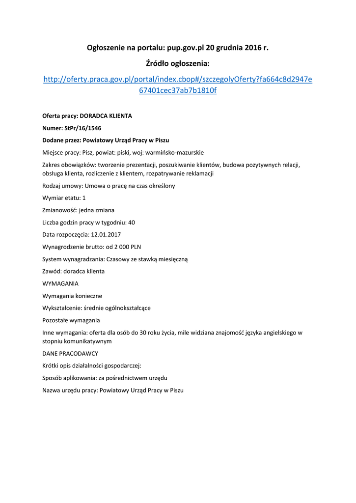 Ogłoszenie na portalu: pup.gov.pl 20 grudnia 2016 r. Źródło ogłoszenia: http://oferty.praca.gov.pl/portal/index.cbop#/szczegolyOferty?fa664c8d2947e 67401cec37ab7b1810f Oferta pracy: DORADCA KLIENTA Numer: StPr/16/1546 Dodane przez: Powiatowy Urząd Pracy w Piszu Miejsce pracy: Pisz, powiat: piski, woj: warmińsko-mazurskie Zakres obowiązków: tworzenie prezentacji, poszukiwanie klientów, budowa pozytywnych relacji, obsługa klienta, rozliczenie z klientem, rozpatrywanie reklamacji Rodzaj umowy: Umowa o pracę na czas określony Wymiar etatu: 1 Zmianowość: jedna zmiana Liczba godzin pracy w tygodniu: 40 Data rozpoczęcia: 12.01.2017 Wynagrodzenie brutto: od 2 000 PLN System wynagradzania: Czasowy ze stawką miesięczną Zawód: doradca klienta WYMAGANIA Wymagania konieczne Wykształcenie: średnie ogólnokształcące Pozostałe wymagania Inne wymagania: oferta dla osób do 30 roku życia, mile widziana znajomość języka angielskiego w stopniu komunikatywnym DANE PRACODAWCY Krótki opis działalności gospodarczej: Sposób aplikowania: za pośrednictwem urzędu Nazwa urzędu pracy: Powiatowy Urząd Pracy w Piszu