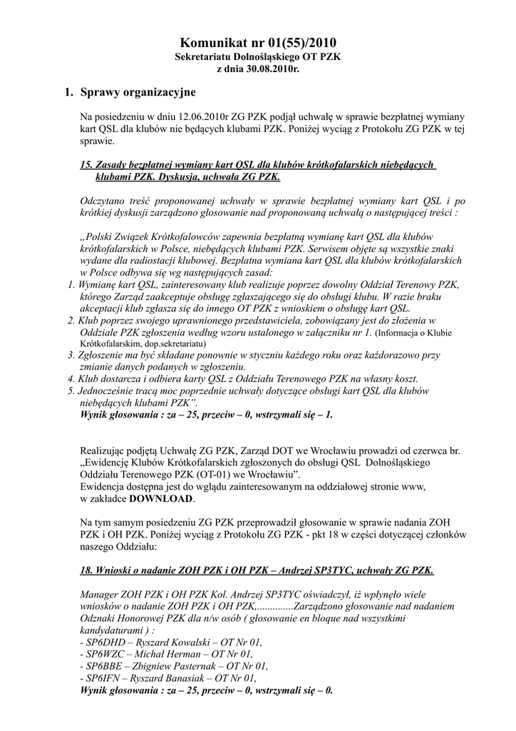 Komunikat nr 01(55)/2010 Sekretariatu Dolnośląskiego OT PZK z dnia 30.08.2010r. 1. Sprawy organizacyjne Na posiedzeniu w dniu 12.06.2010r ZG PZK podjął uchwałę w sprawie bezpłatnej wymiany kart QSL dla klubów nie będących klubami PZK. Poniżej wyciąg z Protokołu ZG PZK w tej sprawie. 15. Zasady bezpłatnej wymiany kart QSL dla klubów krótkofalarskich niebędących klubami PZK. Dyskusja, uchwała ZG PZK. Odczytano treść proponowanej uchwały w sprawie bezpłatnej wymiany kart QSL i po krótkiej dyskusji zarządzono głosowanie nad proponowaną uchwałą o następującej treści : „Polski Związek Krótkofalowców zapewnia bezpłatną wymianę kart QSL dla klubów krótkofalarskich w Polsce, niebędących klubami PZK. Serwisem objęte są wszystkie znaki wydane dla radiostacji klubowej. Bezpłatna wymiana kart QSL dla klubów krótkofalarskich w Polsce odbywa się wg następujących zasad: 1. Wymianę kart QSL, zainteresowany klub realizuje poprzez dowolny Oddział Terenowy PZK, którego Zarząd zaakceptuje obsługę zgłaszającego się do obsługi klubu. W razie braku akceptacji klub zgłasza się do innego OT PZK z wnioskiem o obsługę kart QSL. 2. Klub poprzez swojego uprawnionego przedstawiciela, zobowiązany jest do złożenia w Oddziale PZK zgłoszenia według wzoru ustalonego w załączniku nr 1. (Informacja o Klubie Krótkofalarskim, dop.sekretariatu) 3. Zgłoszenie ma być składane ponownie w styczniu każdego roku oraz każdorazowo przy zmianie danych podanych w zgłoszeniu. 4. Klub dostarcza i odbiera karty QSL z Oddziału Terenowego PZK na własny koszt. 5. Jednocześnie tracą moc poprzednie uchwały dotyczące obsługi kart QSL dla klubów niebędących klubami PZK”. Wynik głosowania : za – 25, przeciw – 0, wstrzymali się – 1. Realizując podjętą Uchwałę ZG PZK, Zarząd DOT we Wrocławiu prowadzi od czerwca br. „Ewidencję Klubów Krótkofalarskich zgłoszonych do obsługi QSL Dolnośląskiego Oddziału Terenowego PZK (OT-01) we Wrocławiu”. Ewidencja dostępna jest do wglądu zainteresowanym na oddziałowej stronie www, w zakładce DOWNLOAD. Na tym samym posiedzeniu ZG PZK przeprowadził głosowanie w sprawie nadania ZOH PZK i OH PZK. Poniżej wyciąg z Protokołu ZG PZK - pkt 18 w części dotyczącej członków naszego Oddziału: 18. Wnioski o nadanie ZOH PZK i OH PZK – Andrzej SP3TYC, uchwały ZG PZK. Manager ZOH PZK i OH PZK Kol. Andrzej SP3TYC oświadczył, iż wpłynęło wiele wniosków o nadanie ZOH PZK i OH PZK,..............Zarządzono głosowanie nad nadaniem Odznaki Honorowej PZK dla n/w osób ( głosowanie en bloque nad wszystkimi kandydaturami ) : - SP6DHD – Ryszard Kowalski – OT Nr 01, - SP6WZC – Michał Herman – OT Nr 01, - SP6BBE – Zbigniew Pasternak – OT Nr 01, - SP6IFN – Ryszard Banasiak – OT Nr 01, Wynik głosowania : za – 25, przeciw – 0, wstrzymali się – 0. Wyróżnionym Kolegom z naszego OT składamy serdeczne Gratulacje, życząc dalszych sukcesów i zaangażowania w pracy na rzecz PZK. 2. Sprawy bieżące – z posiedzenia Zarządu OT PZK. Na posiedzeniu w dniu 25.08.2010r ZOT PZK zajął się następującymi sprawami (cytat z protokołu nr. 17/2010 r.): – Zarząd upoważnia Prezesa do głosowania „ZA” utworzeniem Wirtualnego Oddziału Terenowego (VOT) w Warszawie – Omówiono projekt nowego Statutu PZK. Po dyskusji przyjęto „Uwagi i poprawki do projektu Statutu PZK na XIX NKZD”, który stanowi załącznik Nr.1 niniejszego protokołu, z zaleceniem przekazania ich przez Delegatów OT-01 Nadzwyczajnemu Krajowemu Zjazdowi Delegatów do rozpatrzenia – Realizując postanowienie zawarte w protokole Nr. 15/2010r V-ce Prezes d/s tech. SQ6ILS zapoznał zebranych z problemem niewłaściwie działającego od dłuższego czasu przemiennika amatorskiego SR6MA na Górze Ślęża. Podjęto decyzję o modernizacji przemiennika SR6MA. Zobowiązano V-ce Prezesa d/s tech. SQ6ILS do rozpatrzenia ofert cenowych krajowych oferentów i przedstawienia ich na kolejnym zebraniu pod dalszą dyskusję – Postanowiono podjąć działania umożliwiające umieszczenie w okolicach Trzebnicy kontenera pozyskanego z Wojewódzkiego Inspektoratu Ochrony Środowiska, z przeznaczeniem na instalację przemiennika w tamtej okolicy. Odpowiedzialny za realizację zadania jest V-ce Prezes d/s organizacyjnych SQ6VY. – Podjęto Uchwałę Nr.27/2010r o doposażeniu ze środków OPP przemienników SR6S, SR6R, SR6G w anteny typu X-30N (łącznie 6 szt) wraz z niezbędnymi akcesoriami montażowymi do kwoty nie przekraczającej 2000 zł za całość – Ustalono termin najbliższego spotkania giełdowego w „Trzech Kolorach” na dzień 05.09.2010r. – Zaakceptowano propozycję Prezesa DOT 3Z6AEF o wydawaniu Dyplomów: 1. „WROCŁAW – Miasto Spotkań” 2. „Dolny Śląsk” Regulaminy dyplomów i szatę graficzną przygotuje wnioskodawca i przedstawi zarządowi DOT pod dalszą dyskusję. – Zapoznano się z uchwałą Zarządu Klubu SP6KGJ w Głogowie o wyborze nowych władz klubowych. Podjęto decyzję o wpisaniu Klubu SP6KGJ do Ewidencji Klubów obsługiwanych przez oddziałowe biuro QSL. Odpowiedzialny za realizację jest Sekretarz OT. 3. Ponawiamy prośbę QSL Managera ! W imieniu QSL Managera naszego OT zwracam się z prośbą do wszystkich klubów i nadawców z naszego oddziału, którzy używali, używają lub będą używali tymczasowych (okolicznościowych, specjalnych, kontestowych) znaków wywoławczych, aby informowali o tym sekretariat DOT. Do naszego oddziału (QSL Biuro nr 01) kierowane są karty QSL, których ostateczny odbiorca jest trudny do zidentyfikowania. Tak samo wysyłając karty QSL do stacji okolicznościowych prosimy o podawanie QSL managera lub numer biura QSL. Komunikat opracował Sekretarz OT-01 – Ryszard SP6IFN