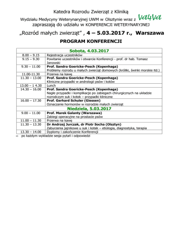 Katedra Rozrodu Zwierząt z Kliniką Wydziału Medycyny Weterynaryjnej UWM w Olsztynie wraz z zapraszają do udziału w KONFERENCJI WETERYNARYJNEJ „Rozród małych zwierząt” , 4 – 5.03.2017 r., Warszawa PROGRAM KONFERENCJI Sobota, 4.03.2017 8.00 – 9.15 9.15 – 9.30 9.30 – 11.00 11.00-11.30 11.30 – 13.00 13.00 – 1 4.30 14.30 – 16.00 16.00 – 17.30 Rejestracja uczestników Powitanie uczestników i otwarcie Konferencji - prof. dr hab. Tomasz Janowski Prof. Sandra Goericke-Pesch (Kopenhaga) Problemy rozrodu u małych zwierząt domowych (króliki, świnki morskie itd.) Przerwa na kawę Prof. Sandra Goericke-Pesch (Kopenhaga) Kliniczne przypadki w andrologii psów i kotów Lunch Prof. Sandra Goericke-Pesch (Kopenhaga) Nagłe przypadki i komplikacje po zabiegach chirurgicznych na układzie rozrodczym suk i kotek – przypadki kliniczne Prof. Gerhard Schuler (Giessen) Oznaczanie hormonów w rozrodzie małych zwierząt Niedziela, 5.03.2017 9.00 – 11.00 Prof. Marek Galanty (Warszawa) Zabiegi operacyjne na prostacie psów 11.00 – 11.30 Przerwa na kawę 11.30 – 13.30 Dr Andrzej Jurczak, dr Piotr Socha (Olsztyn) Zaburzenia jajnikowe u suk i kotek – etiologia, diagnostyka, terapia 13.30 – 14.00 Dyplomy i zakończenie Konferencji • po każdym wykładzie sesja pytań i odpowiedzi