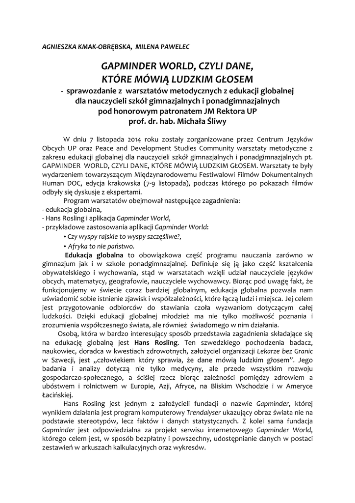 AGNIESZKA KMAK-OBRĘBSKA, MILENA PAWELEC GAPMINDER WORLD, CZYLI DANE, KTÓRE MÓWIĄ LUDZKIM GŁOSEM - sprawozdanie z warsztatów metodycznych z edukacji globalnej dla nauczycieli szkół gimnazjalnych i ponadgimnazjalnych pod honorowym patronatem JM Rektora UP prof. dr. hab. Michała Śliwy W dniu 7 listopada 2014 roku zostały zorganizowane przez Centrum Języków Obcych UP oraz Peace and Development Studies Community warsztaty metodyczne z zakresu edukacji globalnej dla nauczycieli szkół gimnazjalnych i ponadgimnazjalnych pt. GAPMINDER WORLD, CZYLI DANE, KTÓRE MÓWIĄ LUDZKIM GŁOSEM. Warsztaty te były wydarzeniem towarzyszącym Międzynarodowemu Festiwalowi Filmów Dokumentalnych Human DOC, edycja krakowska (7-9 listopada), podczas którego po pokazach filmów odbyły się dyskusje z ekspertami. Program warsztatów obejmował następujące zagadnienia: - edukacja globalna, - Hans Rosling i aplikacja Gapminder World, - przykładowe zastosowania aplikacji Gapminder World: • Czy wyspy rajskie to wyspy szczęśliwe?, • Afryka to nie państwo. Edukacja globalna to obowiązkowa część programu nauczania zarówno w gimnazjum jak i w szkole ponadgimnazjalnej. Definiuje się ją jako część kształcenia obywatelskiego i wychowania, stąd w warsztatach wzięli udział nauczyciele języków obcych, matematycy, geografowie, nauczyciele wychowawcy. Biorąc pod uwagę fakt, że funkcjonujemy w świecie coraz bardziej globalnym, edukacja globalna pozwala nam uświadomić sobie istnienie zjawisk i współzależności, które łączą ludzi i miejsca. Jej celem jest przygotowanie odbiorców do stawiania czoła wyzwaniom dotyczącym całej ludzkości. Dzięki edukacji globalnej młodzież ma nie tylko możliwość poznania i zrozumienia współczesnego świata, ale również świadomego w nim działania. Osobą, która w bardzo interesujący sposób przedstawia zagadnienia składające się na edukację globalną jest Hans Rosling. Ten szwedzkiego pochodzenia badacz, naukowiec, doradca w kwestiach zdrowotnych, założyciel organizacji Lekarze bez Granic w Szwecji, jest „człowiekiem który sprawia, że dane mówią ludzkim głosem”. Jego badania i analizy dotyczą nie tylko medycyny, ale przede wszystkim rozwoju gospodarczo-społecznego, a ściślej rzecz biorąc zależności pomiędzy zdrowiem a ubóstwem i rolnictwem w Europie, Azji, Afryce, na Bliskim Wschodzie i w Ameryce Łacińskiej. Hans Rosling jest jednym z założycieli fundacji o nazwie Gapminder, której wynikiem działania jest program komputerowy Trendalyser ukazujący obraz świata nie na podstawie stereotypów, lecz faktów i danych statystycznych. Z kolei sama fundacja Gapminder jest odpowiedzialna za projekt serwisu internetowego Gapminder World, którego celem jest, w sposób bezpłatny i powszechny, udostępnianie danych w postaci zestawień w arkuszach kalkulacyjnych oraz wykresów. Podczas warsztatów uczestnicy mieli możliwość zapoznania się z zastosowaniem aplikacji Gapminder World na przykładach wysp rajskich i kontynentu afrykańskiego. W pierwszej części Czy wyspy rajskie to wyspy szczęśliwe zadaniem uczestników było wyobrażenie sobie i krótkie opisanie jak wyglądałoby ich życie gdyby urodzili się na wyspie na Pacyfiku. Stymulacją do wykonania zadania było przedstawienie bajecznych zdjęć archipelagu wysp Seszeli i Malediwów, które celowo przedstawiały jedynie rajską stronę życia w państwach wyspiarskich. Następnie poprzez wykorzystanie aplikacji Gapminder World nastąpiła konfrontacja skojarzeń z rzeczywistością. Okazało się, że ludzie mieszkający na wyspach, które na pierwszy rzut oka przypominają biblijny Eden lub mityczną Arkadię, borykają się w wieloma problemami, a ich życie wcale nie jest takie sielskie. Część ta miała na celu ukazać jak błędne jest nasze stereotypowe myślenie. Część Afryka to nie państwo miała zwrócić uwagę uczestników na fakt, że kontynent afrykański stanowi rzeczywistość bardzo różnorodną i dynamicznie zmieniającą się. W tym celu wykorzystano wykres przedstawiający długość życia w wybranych krajach afrykańskich oraz dochód na jednego mieszkańca. Kolejną aplikacją, którą wykorzystano na warsztatach było wybranie dla osi pionowej w Gapminderze telefonów komórkowych na 100 mieszkańców, co z kolei kładło nacisk na odpowiedzialną konsumpcję. Wnioskami podsumowującymi było to, że państwa afrykańskie borykają się nie tylko z biedą, chorobami, katastrofami naturalnymi czy wojnami, ale można w nich również odnaleźć pozytywne aspekty, takie jak różnorodność kultur i języków, surowce naturalne, bogactwo. Założeniem organizatorów i prowadzących było zapoznanie nauczycieli ze szkół gimnazjalnych i ponadgimnazjalnych z narzędziem jakim jest Gapminder w celu jego wykorzystania na lekcjach czy też języka obcego czy np. wychowawczych. Warsztaty cieszyły się dużym zainteresowaniem i pokazały, że warto wiedzieć coś o świecie i posługiwać się zastosowaniami Gapminder World. Zakładany cel został w dużym stopniu osiągnięty. Na koniec wszyscy nauczyciele otrzymali certyfikaty uczestnictwa. Ponadto otrzymali również zestaw materiałów przed i po-warsztatowych, aby móc dzielić się zdobytą wiedzą ze swoimi uczniami i wykorzystywać aplikację Gapminder World w praktyce. W przygotowaniu artykułu korzystano z informacji zawartych na stronach: http://www.ceo.org.pl/pl/globalna http://www.pdsc.pl/pl/baza-publikacji/artykuy/147-hans-rosling-czyli-czowiek-ktorysprawia-e-dane-mowi-ludzkim-gosem