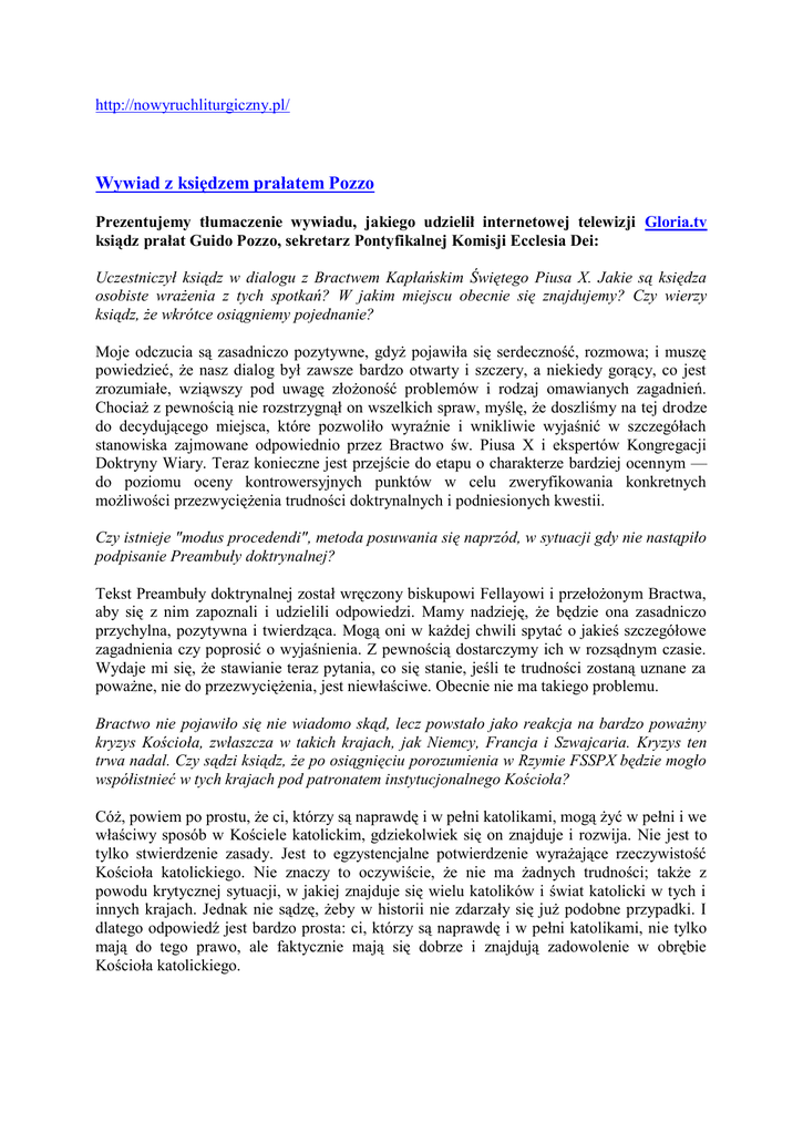 http://nowyruchliturgiczny.pl/ Wywiad z księdzem prałatem Pozzo Prezentujemy tłumaczenie wywiadu, jakiego udzielił internetowej telewizji Gloria.tv ksiądz prałat Guido Pozzo, sekretarz Pontyfikalnej Komisji Ecclesia Dei: Uczestniczył ksiądz w dialogu z Bractwem Kapłańskim Świętego Piusa X. Jakie są księdza osobiste wrażenia z tych spotkań? W jakim miejscu obecnie się znajdujemy? Czy wierzy ksiądz, że wkrótce osiągniemy pojednanie? Moje odczucia są zasadniczo pozytywne, gdyż pojawiła się serdeczność, rozmowa; i muszę powiedzieć, że nasz dialog był zawsze bardzo otwarty i szczery, a niekiedy gorący, co jest zrozumiałe, wziąwszy pod uwagę złożoność problemów i rodzaj omawianych zagadnień. Chociaż z pewnością nie rozstrzygnął on wszelkich spraw, myślę, że doszliśmy na tej drodze do decydującego miejsca, które pozwoliło wyraźnie i wnikliwie wyjaśnić w szczegółach stanowiska zajmowane odpowiednio przez Bractwo św. Piusa X i ekspertów Kongregacji Doktryny Wiary. Teraz konieczne jest przejście do etapu o charakterze bardziej ocennym — do poziomu oceny kontrowersyjnych punktów w celu zweryfikowania konkretnych możliwości przezwyciężenia trudności doktrynalnych i podniesionych kwestii. Czy istnieje "modus procedendi", metoda posuwania się naprzód, w sytuacji gdy nie nastąpiło podpisanie Preambuły doktrynalnej? Tekst Preambuły doktrynalnej został wręczony biskupowi Fellayowi i przełożonym Bractwa, aby się z nim zapoznali i udzielili odpowiedzi. Mamy nadzieję, że będzie ona zasadniczo przychylna, pozytywna i twierdząca. Mogą oni w każdej chwili spytać o jakieś szczegółowe zagadnienia czy poprosić o wyjaśnienia. Z pewnością dostarczymy ich w rozsądnym czasie. Wydaje mi się, że stawianie teraz pytania, co się stanie, jeśli te trudności zostaną uznane za poważne, nie do przezwyciężenia, jest niewłaściwe. Obecnie nie ma takiego problemu. Bractwo nie pojawiło się nie wiadomo skąd, lecz powstało jako reakcja na bardzo poważny kryzys Kościoła, zwłaszcza w takich krajach, jak Niemcy, Francja i Szwajcaria. Kryzys ten trwa nadal. Czy sądzi ksiądz, że po osiągnięciu porozumienia w Rzymie FSSPX będzie mogło współistnieć w tych krajach pod patronatem instytucjonalnego Kościoła? Cóż, powiem po prostu, że ci, którzy są naprawdę i w pełni katolikami, mogą żyć w pełni i we właściwy sposób w Kościele katolickim, gdziekolwiek się on znajduje i rozwija. Nie jest to tylko stwierdzenie zasady. Jest to egzystencjalne potwierdzenie wyrażające rzeczywistość Kościoła katolickiego. Nie znaczy to oczywiście, że nie ma żadnych trudności; także z powodu krytycznej sytuacji, w jakiej znajduje się wielu katolików i świat katolicki w tych i innych krajach. Jednak nie sądzę, żeby w historii nie zdarzały się już podobne przypadki. I dlatego odpowiedź jest bardzo prosta: ci, którzy są naprawdę i w pełni katolikami, nie tylko mają do tego prawo, ale faktycznie mają się dobrze i znajdują zadowolenie w obrębie Kościoła katolickiego. Jakie są przyczyny obserwowanej w wielu kręgach kościelnych wrogości wobec liturgii, którą Kościół i tak wielu świętych celebrowało przez długi czas i która walnie przyczyniła się do spektakularnego rozwoju Kościoła? Jest to złożone pytanie; sądzę bowiem, że zrozumienie, dlaczego to uprzedzenie przeciwko nadzwyczajnej formie liturgii Starego Rytu wciąż się szerzy, wiąże się z wieloma czynnikami. Należy pamiętać, że już od wielu lat w Kościele katolickim brakuje prawdziwie odpowiedniej i wyczerpującej formacji liturgicznej. Niektórzy próbowali wprowadzić zasadę zerwania, oddzielenia, radykalnego pęknięcia między reformą liturgiczną zaproponowaną, wprowadzoną i promulgowaną przez papieża Pawła VI a tradycyjną liturgią. Rzeczywistość była inna, ponieważ jasne jest, że w liturgii i jej historii istnieje istotowa ciągłość. Odkrywamy wzrost, postęp, odnowę, a nie przerwanie czy nieciągłość. I stąd te uprzedzenia mają zdecydowany wpływ na sposób myślenia różnych ludzi, w tym duchownych i wiernych. Musimy przezwyciężyć to uprzedzenie. Musimy zapewnić pełną i autentyczną formację liturgiczną i dostrzec, że w rzeczywistości księgi liturgiczne i reforma liturgiczna, której pragnął papież Paweł VI, to jedna rzecz. Czymś innym są natomiast inne formy wprowadzania jej w życie, które pojawiły się w praktyce w wielu częściach katolickiego świata, a które są faktycznie nadużyciami reformy liturgicznej Pawła VI. Zawierają one również błędy doktrynalne, które należy naprawić i odrzucić. To właśnie próbował stwierdzić ojciec święty Benedykt XVI w niedawnym przemówieniu w Papieskim Instytucie Liturgicznym Anselmianum wiosną bieżącego roku. Księgi reformy liturgicznej to jedno, a czym innym są konkretne formy realizacji, które na nieszczęście rozpowszechniły się w wielu miejscach i nie są zgodne z zasadami określonymi i wyraźnie sformułowanymi przez Konstytucję Soboru Watykańskiego II o liturgii Sacrosanctum Concilium. Biskup Fellay otrzymał poufną preambułę w dniu 14 września. Następnego dnia wiedział już o niej Andrea Tornielli. Jak to się stało, że poufne informacje watykańskie przedostały się tak szybko do prasy? Dziennikarze mają duże umiejętności przechwytywania wiadomości i z pewnego punktu widzenia budzi to podziw. Jednak w tym wypadku dziennikarze, nie tylko Tornielli, lecz także inni, powtórzyli w zasadzie informację prasową z następnego dnia, relacjonującą niektóre najważniejsze elementy Preambuły doktrynalnej. Dlatego uważam, że zasadnicza, szczegółowa zawartość Preambuły nadal nie są znana, a przynajmniej nie została jeszcze opublikowana. Dziennikarze nie mówili o niej ani nie opisywali w szczegółach procesu powstawania i opracowywania Preambuły doktrynalnej. W tym znacze