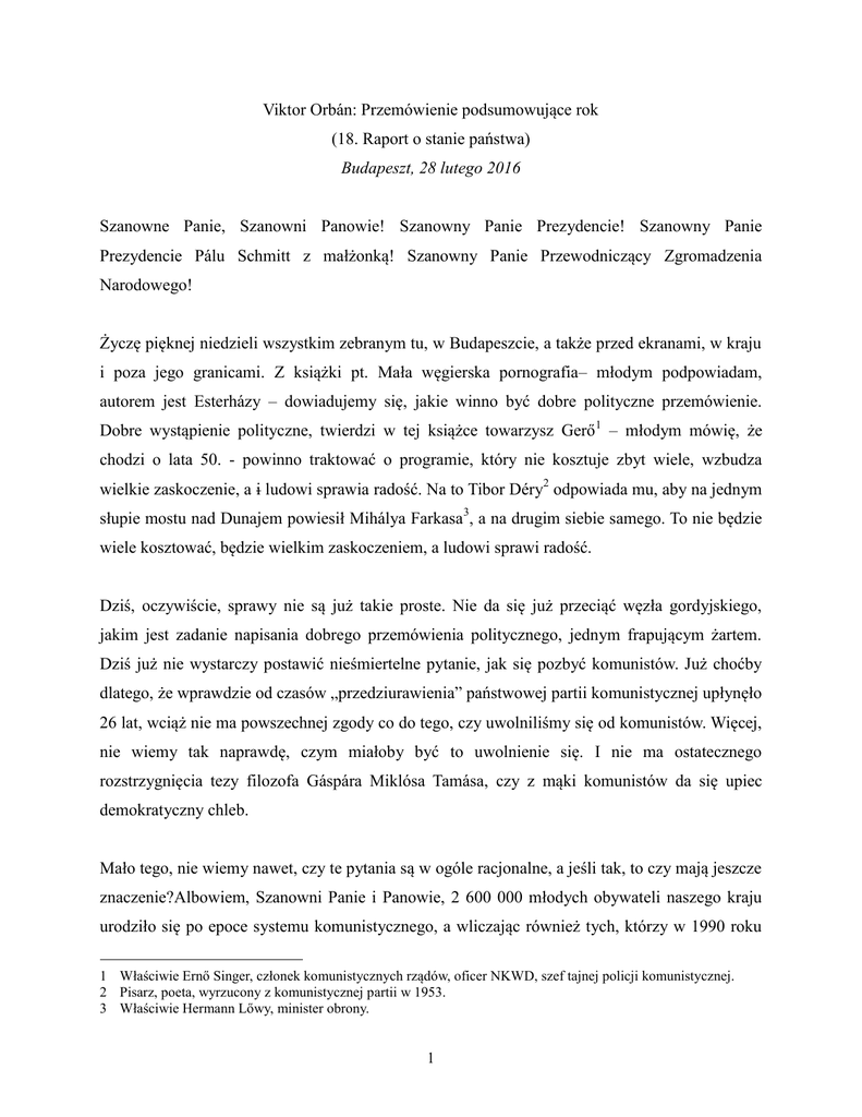Viktor Orbán: Przemówienie podsumowujące rok (18. Raport o stanie państwa) Budapeszt, 28 lutego 2016 Szanowne Panie, Szanowni Panowie! Szanowny Panie Prezydencie! Szanowny Panie Prezydencie Pálu Schmitt z małżonką! Szanowny Panie Przewodniczący Zgromadzenia Narodowego! Życzę pięknej niedzieli wszystkim zebranym tu, w Budapeszcie, a także przed ekranami, w kraju i poza jego granicami. Z książki pt. Mała węgierska pornografia– młodym podpowiadam, autorem jest Esterházy – dowiadujemy się, jakie winno być dobre polityczne przemówienie. Dobre wystąpienie polityczne, twierdzi w tej książce towarzysz Gerő1 – młodym mówię, że chodzi o lata 50. - powinno traktować o programie, który nie kosztuje zbyt wiele, wzbudza wielkie zaskoczenie, a i ludowi sprawia radość. Na to Tibor Déry2 odpowiada mu, aby na jednym słupie mostu nad Dunajem powiesił Mihálya Farkasa3, a na drugim siebie samego. To nie będzie wiele kosztować, będzie wielkim zaskoczeniem, a ludowi sprawi radość. Dziś, oczywiście, sprawy nie są już takie proste. Nie da się już przeciąć węzła gordyjskiego, jakim jest zadanie napisania dobrego przemówienia politycznego, jednym frapującym żartem. Dziś już nie wystarczy postawić nieśmiertelne pytanie, jak się pozbyć komunistów. Już choćby dlatego, że wprawdzie od czasów „przedziurawienia” państwowej partii komunistycznej upłynęło 26 lat, wciąż nie ma powszechnej zgody co do tego, czy uwolniliśmy się od komunistów. Więcej, nie wiemy tak naprawdę, czym miałoby być to uwolnienie się. I nie ma ostatecznego rozstrzygnięcia tezy filozofa Gáspára Miklósa Tamása, czy z mąki komunistów da się upiec demokratyczny chleb. Mało tego, nie wiemy nawet, czy te pytania są w ogóle racjonalne, a jeśli tak, to czy mają jeszcze znaczenie?Albowiem, Szanowni Panie i Panowie, 2 600 000 młodych obywateli naszego kraju urodziło się po epoce systemu komunistycznego, a wliczając również tych, którzy w 1990 roku 1 Właściwie Ernő Singer, członek komunistycznych rządów, oficer NKWD, szef tajnej policji komunistycznej. 2 Pisarz, poeta, wyrzucony z komunistycznej partii w 1953. 3 Właściwie Hermann Lőwy, minister obrony. 1 mieli najwyżej 15 lat, czyli byli jeszcze dziećmi, widzimy, że spośród żyjących dziś na Węgrzech 10 milionów obywateli 4,8 miliona nie posiada własnych wspomnień politycznych o komunizmie. Pomyślmy też o tym, że miejsce męczącego nas kiedyś dylematu „czy uciekać za granicę?” zajął dylemat „czy podjąć pracę za granicą?”. Zamiast pytań o politykę przemysłową kraju żelaza i aluminium, pochłania nas kwestia informatycznej rewolucji. Zamiast trapić się postępami państwowej gospodarki planowej, zastanawiamy się, jak przezwyciężyć neoliberalną politykę gospodarczą. Już nie to nas gnębi, jak tu się wyrwać z RWPG [Rada Wzajemnej Pomocy Gospodarczej], lecz jak obronić nasze narodowe interesy w Unii Europejskiej. Czas przeleciał. Wiele wody upłynęło w Dunaju. A my, posiwiali uczestnicy transformacji systemowej, ciągle stajemy wobec problemów do rozwiązania. Trudno się dziwić, że pojawiają się wciąż dociekania dotyczące zmiany warty i pokoleń. Istnieje już nawet partia opozycyjna domagająca się od nas, którzy obaliliśmy stary system, byśmy ustąpili młodszemu pokoleniu. Déjà vu. Stare piękne, junackie czasy! Nasz słynny winiarz Ferenc Takler – chyba myśląc o sobie – powiedział, czy też zacytował: zanim przekażemy sztandar kolejnemu pokoleniu, potrzymajmy go jeszcze trochę. Dziś, Szanowni Państwo, w pierwszym rzędzie mam mówić o czasie. Dokonujemy oceny minionego roku, zastanawiamy się, co nas czeka w nadchodzących miesiącach, dlatego najpierw musimy znaleźć odpowiedź na pytanie, w jakim punkcie się dziś znajdujemy? W jakim stanie są dziś Węgry, w jakim położeniu Węgrzy, żyjący w Basenie Karpat? Możemy cieszyć się wolnością i niepodległością w stopniu, jaki rzadko bywał nam dany w ciągu minionych stu lat. Nie ciąży nam tyrania czy okupacja, sami wybieramy własne rządy. Ustawa Zasadnicza gwarantuje równowagę naszych jednostkowych i wspólnotowych wolności i obowiązków, określa ich granice. Prawa ustanawiane są przez deputowanych, których naród wybrał w sposób wolny. Nieskrępowanie można korzystać z wolności poglądów i słowa, zaś 2 gromadzić się i stowarzyszać nie tylko można, ale jest to korzystne, a nawet pożyteczne. Trudniejszym pytaniem jest, gdzie dziś znajdują się Węgry na historycznej osi czasu? My, którzy połowę swego życia przeżyliśmy w komunizmie, a połowę w wolnej Ojczyźnie – osobiście 26 lat przeżyłem tam, a 26 tu – skłonni jesteśmy ulegać pewnemu złudzeniu. Czasem łapiemy się na tym, że przeżywamy dni tak, jak byśmy jeszcze ciągle żyli w XX wieku lub w jakimś jego przedłużeniu, a przecież przekroczyliśmy już jedną siódmą XXI wieku. Jeśli XXI wiek wyobrazimy sobie jako tydzień, to jesteśmy przy wtorku. Przed nami jeszcze długi tydzień, ale on już na dobre się rozpoczął. Albo czy uświadamiamy sobie, że od pierwszych wolnych wyborów, od końca komunizmu i obcej okupacji, czyli od roku 1990 upłynęło już więcej czasu, niż wynosił okres pomiędzy dwoma wojnami światowymi? Czy uświadamiali sobie Państwo, że okres od zmiany ustroju już jest dłuższy od okresu rządów Horthyego, a jeszcze tylko 7 lat, i przekroczy długość rządów Kádára. Duża liczba przeżytych lat żąda, byśmy powiedzieli sobie coś o dzisiejszej sytuacji Węgier w wymiarze historycznym. Jestem jednym z czterech deputowanych, którzy biorą udział w życiu publicznym Węgier od roku 1990, czyli ponad trzydzieści lat „wiosłuję na galerach” krajowej i międzynarodowej polityki. Daje to już pewien dystans i chyba uprawnia oraz wystarcza do tego, bym mówił o historycznych wymiarach. Występuje tu jednak pe