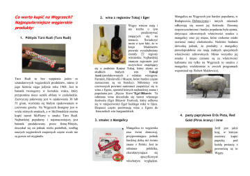Co warto kupić na Węgrzech? Najpopularniejsze węgierskie produkty: 1. Pöttyös Túró Rudi (Turo Rudi) Turo Rudi to bez wątpienia jeden ze sztandarowych węgierskich produktów, mimo iż jego historia sięga jedynie roku 1968. Jest to batonik twarogowy w kształcie walca, który przypomina nieco sernik oblany w czekoladzie. Zazwyczaj pakowany jest w opakowania 30 lub 51 gram, wyróżnia się białym opakowaniem w czerwone grochy. Na Węgrzech dostępny jest w wielu różnych smakach, a w McDonaldzie można kupić nawet McFlurry o smaku Turo Rudi. Najbardziej popularny i najsmaczniejszy jest batonik produkowany przez firmę Pöttyös, doczekał się on jednak wielu podróbek, według naszych węgierskich znajomych często wcale nie są gorsze od oryginału. 2. wina z regionów Tokaj i Eger Węgry winem stoją i nie trzeba o tym przekonywać znających się na temacie. Świadczyć może o tym fakt, że w kraju Madziarów prawnie wyodrębnione zostały 22 regiony winiarskie. Najbardziej znanym regionem jest oczywiście znajdujący się u podnóża Karpat Tokaj, który słynie ze słodkich białych win Tokaji Aszú (produkowanych z odmian winogron: Furmint, Hárslevelű i Muscat, które bardzo często zaznaczone są na butelce). Miłośnicy win czerwonych powinni natomiast zaopatrzyć się w wina z Egeru, spośród których najbardziej znana i popularna jest „Bycza Krew”Egri Bikavér. Ta odmiana wina doczekała się nawet własnego festiwalu (Egri Bikavér Festival), który odbywa się w miejscowości Eger każdego roku w lipcu. Eksperci często porównują wina z Egeru do francuskich win burgundzkich. Mangalica na Węgrzech jest bardzo popularna, w Budapeszcie, Debreczynie i innych miastach odbywają się nawet jej festiwale. Dawniej rozpowszechniona i bardzo popularna była opinia, dotycząca zdrowotnych właściwości smalcu z mangalicy oraz jej mięsa, które rzekomo miało zawierać mniej cholesterolu. Niektóre badania dowodzą jednak, że produkty z mangalicy prawdopodobnie nie mają żadnych specjalnych właściwości zdrowotnych. Mimo wszystko jej smalec i mięso cenione są za właściwości kulinarne nie tylko na Węgrzech (o smalcu z mangalicy wielokrotnie w swoich programach wspominał np. Robert Makłowicz). 4. pasty paprykowe Erős Pista, Red 3. smalec z Mangalicy Mangalica to węgierska rasa świni domowej, przypominająca jednak bardziej dziką niż świnie znane z Polski. Jest to odmiana półdzika, charakteryzująca się specyficznym włochatym wyglądem. Gold (Piros Arany) i inne Jeśli jest jakiś kraj, w którym możemy kupić paprykę pod każdą postacią z pewnością są to Węgry. Jedną z najbardziej popularnych form papryki sprzedawanych w tym kraju są pasty. Najbardziej popularne i na największą uwagę zasługują produkty firmy Univer – kultowa pasta paprykowa w tubce Red Gold (Piros Arany) sprzedawana w wariancie ostrym i łagodnym (opakowania są identyczne, na paście ostrej pisze jednak Csipos, a na łagodnej Csmage) oraz ostra pasta sprzedawana w 200 gramowych słoiczkach Erős Pista (Ostry Stefek) i jej słodki odpowiednik Édes Anna (Słodka Anna). Palinka to owocowa wódka zbliżona nieco w smaku do znanej u nas śliwowicy (produkowana jest jednak również z gruszek, jabłek, moreli, morwy i czereśni). Palinka może mieć od 35 do 85% zawartości alkoholu, w zależności od tego czy była poddawana procesowi destylacji raz czy dwa razy. 7. Kiełbasa czabajska – Csabai kolbász 5. wędzona papryka w proszku marketach stanowi węgierskiej kuchni. 6. Pálinka (Palinka) Pozostając w temacie papryki, kolejnym produktem który warto kupić będąc na Węgrzech bez wątpienia jest wędzona papryka, dostępna zarówno w wariancie słodkim jak i ostrym. Sprzedawana jest zarówno na targach i nieodłączny element 8. Zimowe salami – Téliszalámi Pick salami Zimowe salami (Téliszalámi) produkowane jest w miejscowości Szeged przez węgierskie przedsiębiorstwo Pick (to właśnie stąd nazwa węgierskiego klubu piłki ręcznej Pick Szeged). Wytwarzane jest z mięsa mangalicy oraz przypraw. Charakteryzuje się białym nalotem, jest utwardzane i długo wędzone w zimnym powietrzu. 9. Marynowane warzywa Wędzona kiełbasa czabajska produkowana jest z wieprzowiny i przyprawiana jest oczywiście, jak przystało na Węgry papryką. Kiełbasa ta wyróżnia się czerwono-brązowym kolorem oraz dobrze widocznymi kawałkami słoniny oraz mięsa, doskonale smakuje z odrobiną Erős Pista. Produkowana jest zarówno przemysłowo jak i w warunkach domowych w miastach i wioskach komitetu Békés w południowo-wschodniej części Węgier. Marynowane warzywa często goszczą na polskich stołach. Sposób marynowania i smak naszych warzyw jest jednak inny niż tych, które możemy spotkać na Węgrzech. Bardzo popularna jest tu marynowana papryka nadziewana serem, warto również spróbować małych marynowanych cebulek, które ciężko znaleźć w Polsce. Bardzo popularne są również marynowane ogórki.