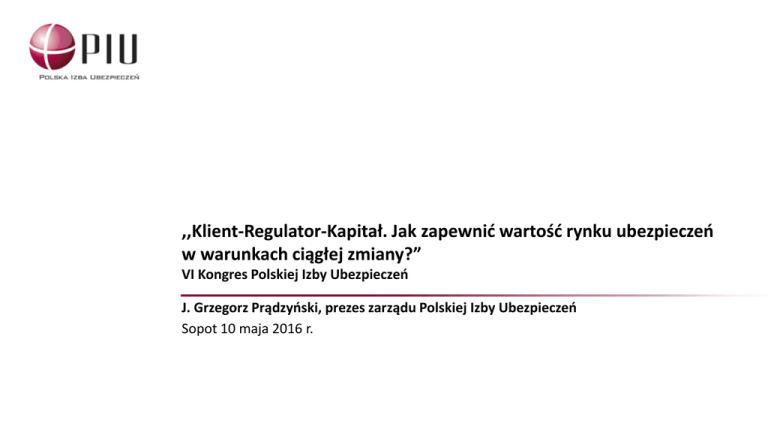 ,,Klient-Regulator-Kapitał. Jak zapewnić wartość rynku ubezpieczeń w warunkach ciągłej zmiany?” VI Kongres Polskiej Izby Ubezpieczeń J. Grzegorz Prądzyński, prezes zarządu Polskiej Izby Ubezpieczeń Sopot 10 maja 2016 r. Wzrost przypisu składki ubezpieczeniowej w Polsce Wykres 1. Składka przypisana brutto w roku 2000 i 2015 kwotowo i jako % PKB 4% 60 jako % PKB 50 3% 40 27,3 w mld zł 1,5% 30 2% 1,7% 20 12,5 27,5 1% 10 1,5% 1,1% 8,3 0 2000 Dział I 2015 Dział II 0% 2000 2015 Dział I Dział II Źródło: Opracowanie własne na podstawie danych KNF i GUS 2 Ubezpieczenia zwiększają bezpieczeństwo i stabilność dla klientów i całej gospodarki (1) Wykres 2. Wypłacone odszkodowania i świadczenia 40 Wykres 3. Dynamika wzrostu w latach 2000 - 2015 2% jako % PKB 30 Odszkodowania 20 1% w mld zł 341% 1,9% 34,8 1,4% 10 10,2 0 0% 2000 2015 2000 2015 Składka 263% Źródło: Opracowanie własne na podstawie danych KNF i GUS 0% 100% 200% 300% 400% 3 Ubezpieczenia zwiększają bezpieczeństwo i stabilność dla klientów i całej gospodarki (2) Wykres 4. Lokaty zakładów ubezpieczeń w mld zł Wykres 5. Lokaty zakładów ubezpieczeń w relacji do PKB 200 8,9% 9% 160 120 6% 80 158,8 4,4% 3% 40 32,7 0 2000 0% 2015 2000 2015 Wykres 6. Struktura lokat zakładów ubezpieczeń w roku 2000 i 2015 Lokaty w jednostkach podporządkowanych Na ryzyko ubezpieczającego Papiery wartościowe emitowane przez Skarb Państwa Inne lokaty 2,3 mld zł 11,3 mld zł 2,0 mld zł 42,1 mld zł 8,5 mld zł 2000 2015 19,9 mld zł 55,4 mld zł 50,0 mld zł 4 Pod względem rozwoju rynku ubezpieczeniowego Polska wyróżnia się pozytywnie spośród krajów Europy Środkowo-Wschodniej, ale … Wykres 7. PKB per capita i składka przypisana brutto w relacji do PKB w 2014 r. w wybranych krajach Źródło: Opracowanie własne na podstawie danych Insurance Europe i Eurostat 5 Dodatkowe ubezpieczenia emerytalne mogą być wsparciem dla przyszłych emerytów i dla gospodarki Wykres 8. III filar w Polsce – zgromadzone aktywa na koniec 2015 r. w relacji do PKB 0,80% 0,60% 0,59% 500 400 Wykres 9. Liczba aktywnych uczestników w 2015 r. (t ys. os.) 392,6 269,5 300 0,32% 0,40% 200 142,8 100 0,20% 0,03% 0,00% PPE IKE IKZE Źródło: Opracowanie własne na podstawie danych Ministerstwa Pracy i Polityki Społecznej, KNF oraz GUS 0 PPE* IKE IKZE *Dla PPE liczba osób objętych programami. Dane historyczne pokazują, że liczba ta nie jest znacząco większa od liczby czynnych uczestników. Dla IKE i IKZE liczba kont zasilonych w okresie sprawozdawczym Prywatne ubezpieczenia zdrowotne mogą wesprzeć powszechny system ochrony zdrowia Wykres 10. Prywatne ubezpieczenia zdrowotne składka (mln zł) 600 Dynamika 21% 500 400 300 200 100 0 Wykres 11. Prywatne ubezpieczenia zdrowotne liczba ubezpieczonych (mln os.) Dynamika 19% 1,5 1,2 399 483 0,9 0,6 1,2 1,43 0,3 2014 2015 0,0 2014 2015 6 Ubezpieczenia są biznesem długoterminowym Technologie Długoterminowość i cykliczność były zawsze nieodłączną cechą ubezpieczeń Otoczenie makroekono -miczne Demografia a zmiany są coraz szybsze Relacje z pośrednikami Model rodziny Relacje z klientami 7 Na tegorocznym Kongresie PIU na pierwszy plan wysuwamy inną kwestię: Nie zmiany technologiczne. Nie zmiany społeczne i modelu rodziny. Nie zmianę relacji z klientami i pośrednikami. Nie zmiany demograficzne. Nie zmiany otoczenia makroekonomicznego. Regulacje 8 Żywioł regulacyjny, z którym ubezpieczycielom jest często bardzo trudno sobie poradzić Zjawiska i żywioły naturalne są ubezpieczycielom niestraszne: Żywioł regulacyjny jest inny: Wieki doświadczeń Nasila się w ostatnich latach Statystyka Nie poddaje się statystyce Matematyka aktuarialna Nie da się go prawidłowo prognozować A może mieć decydujący wpływ na: Relacje ubezpieczycieli z ich klientami Wysokość wypłacanych odszkodowań i świadczeń Ceny produktów ubezpieczeniowych Sytuację finansową, zdolność do rozwoju i wypłacalność firm ubezpieczeniowych 9 Kwestie regulacyjne są kluczowym obszarem działania PIU Bezpieczeństwo rynku Kwestie regulacyjne Regulacje prokonsumenckie Samoregulacja Ochrona praw cywilnych Technologie • Bezpośrednia Likwidacja Szkód, • Kodeks Dobrych Praktyk w zakresie ochrony danych osobowych w ubezpieczeniach. Projekty legislacyjne, nad którymi PIU pracowała w 2015 r.: 109 8 krajowych europejskich 10 Kwestiom prawno-regulacyjnym poświęcamy trzy z czterech paneli na tegorocznym Kongresie Panele I: II: III: IV: 11 Owocnych obrad Warto mieć w pamięci memento zawarte w jednej z tez ostatniego panelu nt. nieprzewidywalności wypłat: „Wprawdzie prawo nie działa wstecz, ale roszczenia… tak”. Dziękuję za uwagę i życzę udanych obrad J. Grzegorz Prądzyński Prezes Zarządu Polskiej Izby Ubezpieczeń