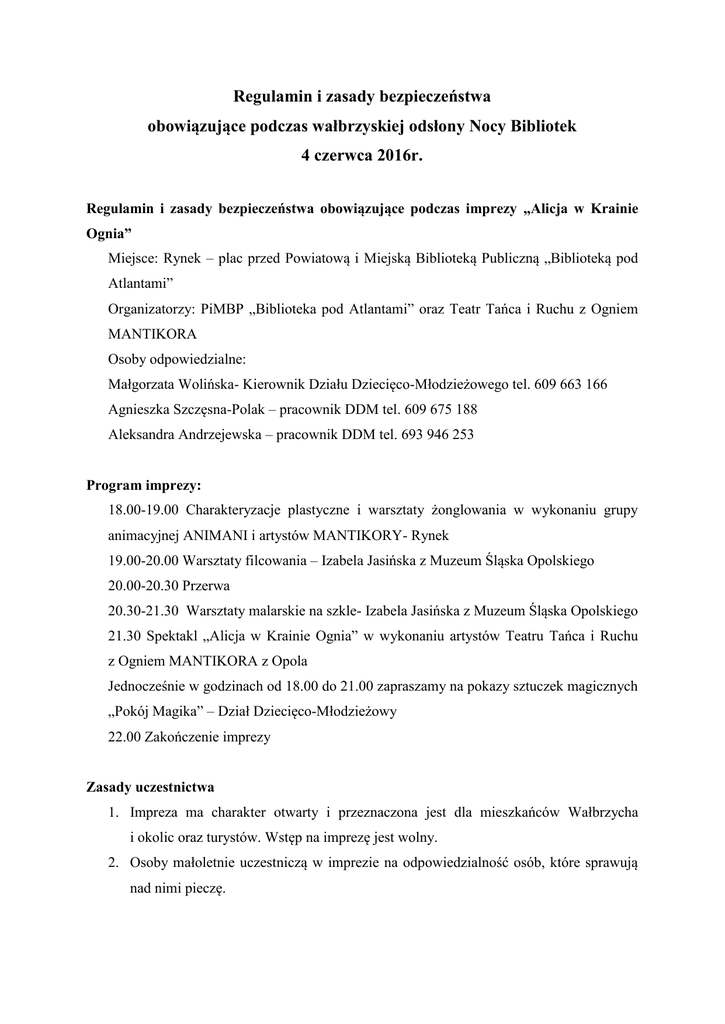 Regulamin i zasady bezpieczeństwa obowiązujące podczas wałbrzyskiej odsłony Nocy Bibliotek 4 czerwca 2016r. Regulamin i zasady bezpieczeństwa obowiązujące podczas imprezy „Alicja w Krainie Ognia” Miejsce: Rynek – plac przed Powiatową i Miejską Biblioteką Publiczną „Biblioteką pod Atlantami” Organizatorzy: PiMBP „Biblioteka pod Atlantami” oraz Teatr Tańca i Ruchu z Ogniem MANTIKORA Osoby odpowiedzialne: Małgorzata Wolińska- Kierownik Działu Dziecięco-Młodzieżowego tel. 609 663 166 Agnieszka Szczęsna-Polak – pracownik DDM tel. 609 675 188 Aleksandra Andrzejewska – pracownik DDM tel. 693 946 253 Program imprezy: 18.00-19.00 Charakteryzacje plastyczne i warsztaty żonglowania w wykonaniu grupy animacyjnej ANIMANI i artystów MANTIKORY- Rynek 19.00-20.00 Warsztaty filcowania – Izabela Jasińska z Muzeum Śląska Opolskiego 20.00-20.30 Przerwa 20.30-21.30 Warsztaty malarskie na szkle- Izabela Jasińska z Muzeum Śląska Opolskiego 21.30 Spektakl „Alicja w Krainie Ognia” w wykonaniu artystów Teatru Tańca i Ruchu z Ogniem MANTIKORA z Opola Jednocześnie w godzinach od 18.00 do 21.00 zapraszamy na pokazy sztuczek magicznych „Pokój Magika” – Dział Dziecięco-Młodzieżowy 22.00 Zakończenie imprezy Zasady uczestnictwa 1. Impreza ma charakter otwarty i przeznaczona jest dla mieszkańców Wałbrzycha i okolic oraz turystów. Wstęp na imprezę jest wolny. 2. Osoby małoletnie uczestniczą w imprezie na odpowiedzialność osób, które sprawują nad nimi pieczę. 3. Uczestnicy imprezy obowiązani są zachowywać się w sposób niezagrażający bezpieczeństwu innych osób. 4. Uczestnicy imprezy zobowiązani są korzystać z pomieszczeń sanitarnych wyłącznie z ich przeznaczeniem. 5. Służby porządkowe organizatora i pracownicy legitymujący się identyfikatorami są uprawnione do wydawania poleceń porządkowych osobom zakłócającym porządek publiczny lub zachowującym się niezgodnie z regulaminem. 6. W przypadku zauważenia pożaru lub innego miejscowego zagrożenia należy niezwłocznie powiadomić organizatora (w/w osoby odpowiedzialne). 7. Organizator imprezy zobowiązany jest do niezwłocznego powiadomienia służb ratowniczych. 8. Organizator utrwala przebieg imprezy dla celów dokumentacji i promocji. Wizerunek osób przebywających na terenie imprezy może zostać utrwalony, a następnie rozpowszechniony dla celów dokumentacyjnych, sprawozdawczych, promocyjnych. 9. Organizator nie ponosi odpowiedzialności za skutki działania Siły Wyższej. Za Siłę Wyższą uznaje się zdarzenie będące poza kontrolą organizatora (warunki atmosferyczne, awarie, zakłócenia pracy urządzeń dostarczających energię elektryczną, działania wojenne lub działania władz państwowych lub samorządowych). 10. Niniejszy Regulamin dostępny jest na stronie internetowej organizatora www.atlanty.pl i w punkcie informacyjnym na terenie imprezy. 11. Służby porządkowe mogą wydawać własne instrukcje bezpieczeństwa oraz p. poż. zgodnie z obowiązującymi przepisami. 12. Regulamin wchodzi w życie z dniem 25 kwietnia 2016 r. Regulamin i zasady bezpieczeństwa obowiązujące podczas nocnego zwiedzania Biblioteki pod Atlantami – „Ciemno, prawie noc bibliotek” Miejsce: Biblioteka pod Atlantami Organizatorzy: Stowarzyszenie Przyjaciół „Biblioteki pod Atlantami” w Wałbrzychu oraz PiMBP „Biblioteka pod Atlantami”. Program imprezy: 1. Nocne zwiedzanie to atrakcja, organizowana poza godzinami funkcjonowania Biblioteki, polegająca na oprowadzaniu grup uczestników po budynku kamienicy pod Atlantami, który jest siedzibą PiMBP „Biblioteki pod Atlantami” w Wałbrzychu. Zwiedzanie odbywa się w ramach ogólnopolskiej akcji „Noc Bibliotek. Wydanie II krajowe”. 2. Pierwsze wejście odbędzie się około 22.00, kolejne wejścia w odstępach ok. 20 minut. 3. Nocne zwiedzanie obejmuje przejście niedostępnymi na co dzień dla osób postronnych pomieszczeniami kamienicy, w tym: piwnice, korytarze, służbowe przejścia. 4. Na nocne zwiedzanie Biblioteki obowiązuje rezerwacja wejściówek - telefonicznie pod numerem 74 648 37 03 oraz mailowo na adres [email protected]. 5. Osoby bez wcześniejszej rejestracji mogą dołączyć do grupy jedynie za zgodą przewodnika. Zasady uczestnictwa 1. Impreza ma charakter otwarty i przeznaczona jest dla mieszkańców Wałbrzycha i okolic oraz turystów. Udział w zwiedzaniu jest bezpłatny. 2. Każdy uczestnik nocnego zwiedzania akceptuje formę zwiedzania, która polega na wywołaniu skrajnych emocji, w tym strachu, przerażenia i niepokoju. Z tego względu nocne zwiedzanie nie jest wskazane osobom o słabej odporności na silne przeżycia oraz osobom z zaburzeniami krążenia. 3. W nocnym zwiedzaniu biorą udział osoby dorosłe. Osoby niepełnoletnie mogą wziąć udział jedynie pod opieką i odpowiedzialnością osoby dorosłej. 4. Grupa nie powinna przekraczać 12 osób zwiedzających. 5. Należy poruszać się po wyznaczonej przez przewodnika trasie. Zakazuje się odłączania od grupy zwiedzających. 6. Wymagana jest ostrożność w trakcie poruszania się po trasie. Uczestnicy zobowiązani są do założenia wygodnego stroju oraz obuwia. 7. Podczas nocy bibliotek obowiązuje zakaz wnoszenia niebezpiecznych przedmiotów, palenia papierosów oraz spożywania alkoholu. 8. W przypadku zauważenia pożaru lub innego miejscowego zagrożenia należy niezwłocznie powiadomić organizatora (w/w osoby odpowiedzialne). 9. Organizator utrwala przebieg imprezy dla celów dokumentacji i promocji. Wizerunek osób przebywających na terenie imprezy może zostać utrwalony, a następnie rozpowszechniony dla celów dokumentacyjnych, sprawozdawczych, promocyjnych. 10. Organizator nie ponosi odpowiedzialności za skutki działania Siły Wyższej. Za Siłę Wyższą uznaje się zdarzenie będące poza kontrolą organizatora (warunki atmosferyczne, awarie, zakłócenia pracy urządzeń dostarczających energię