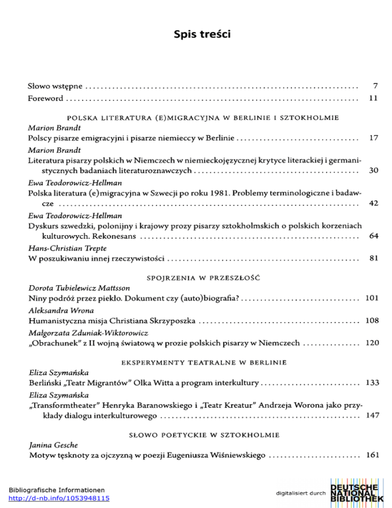 Spis treści Słowo wstępne 7 Foreword 11 POLSKA LITERATURA (E)MIGRACYJNA W BERLINIE I SZTOKHOLMIE Marion Brandt Polscy pisarze emigracyjni i pisarze niemieccy w Berlinie 17 Marion Brandt Literatura pisarzy polskich w Niemczech w niemieckojęzycznej krytyce literackiej i germanistycznych badaniach literaturoznawczych 30 Ewa Teodorowicz-Hellman Polska literatura (e)migracyjna w Szwecji po roku 1981. Problemy terminologiczne i badaw cze 42 Ewa Teodorowicz-Hellman Dyskurs szwedzki, polonijny i krajowy prozy pisarzy sztokholmskich o polskich korzeniach kulturowych. Rekonesans 64 Hans-Christian Trepte W poszukiwaniu innej rzeczywistości 81 SPOJRZENIA W PRZESZŁOŚĆ Dorota Tubielewicz Mattsson Niny podróż przez piekło. Dokument czy (auto)biografia? 101 Aleksandra Wrona Humanistyczna misja Christiana Skrzyposzka 108 Małgorzata Zduniak-Wiktorowicz „Obrachunek" z II wojną światową w prozie polskich pisarzy w Niemczech 120 EKSPERYMENTY TEATRALNE W BERLINIE Eliza Szymańska Berliński „Teatr Migrantów" Olka Witta a program interkultury 133 Eliza Szymańska „Transformtheater" Henryka Baranowskiego i „Teatr Kreatur" Andrzeja Worona jako przy kłady dialogu interkulturowego 147 SŁOWO POETYCKIE W SZTOKHOLMIE Janina Gesche Motyw tęsknoty za ojczyzną w poezji Eugeniusza Wiśniewskiego http://d-nb.info/1053948115 161 6 Spis treści Ewa Sławkowa Stąpać po dwóch śladach. Kilka uwag o wierszu Agnes Franzen Bałtyk 170 Ewa Teodorowicz-Hełlman Tematy egzystencjalne, duchowość i język czyli o poezji Andrzeja Szmilichowskiego 175 WOKÓŁ TEMATU TOŻSAMOŚCI. BERLIN Maria Gierłak Polak wybiera Berlin. Obraz miasta w Czasie przeprowadzki Krzysztofa Niewrzędy 185 Brigitta Hełbig-Mischewski Migrant mesjaszem. Fobie, obsesje, fantazmaty i kreacje autobiograficzne Leszka Oświęcim skiego 198 PYTANIA O TOŻSAMOŚĆ. SZTOKHOLM Janina Gesche Dwa pokolenia - dwa spojrzenia. Obrazy polskiej emigracji w Szwecji 211 Renata Ingbrant Manuela Gretkowska i Grażyna Plebanek-syndrom sztokholmski? 225 Janusz Korek Tajemnice tożsamości - o prozie Michała Moszkowicza 237 Mateusz Szubert Problem tożsamości (i)migracyjnej w perspektywie kulturowej 245 Małgorzata Zduniak-Wiktorowicz Proza między Polską a Szwecją. O tożsamości w doświadczeniu 254 NA OBRZEŻACH LITERATURY Hieronim Chojnacki Szwedzki smak imigracji Zbigniewa Kruszyńskiego. Spojrzenie skandynawisty 273 Grażyna Barbara Szewczyk Polacy w Berlinie. Berlińskie szkice Basila Kerskiego 288 Dorota Tubielewicz Mattsson Maciej Zaremba - wyjście z labiryntu kultur? 296 Aleksandra Wrona Życie literackie berlińskiej Polonii w latach 70. i 80. XX wieku 303 W POSZUKIWANIU JĘZYKOWYCH ŚRODKÓW WYRAZU Hieronim Chojnacki Ku terapii imigranta-outsidera. Psychologiczno-społeczny „niezbędnik" Andrzeja Olkiewicza 317 Renata Makarska Między Polską a Niemcami, między językami. Skrzyposzek, Niewrzęda, Muszer 330 Małgorzata Płomińska Język i styl prozy Michała Moszkowicza 342 Nota o autorach 353