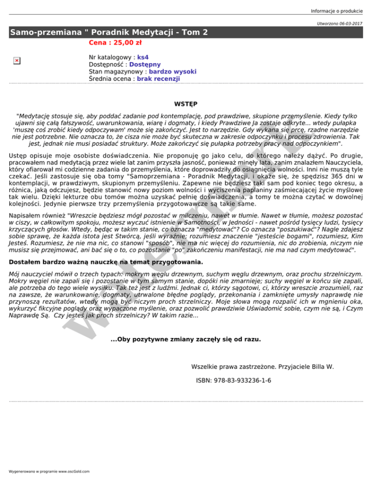 Informacje o produkcie Utworzono 06-03-2017 Samo-przemiana " Poradnik Medytacji - Tom 2 Cena : 25,00 zł Nr katalogowy : ks4 Dostępność : Dostępny Stan magazynowy : bardzo wysoki Średnia ocena : brak recenzji WSTĘP er m ar k "Medytację stosuje się, aby poddać zadanie pod kontemplację, pod prawdziwe, skupione przemyślenie. Kiedy tylko ujawni się całą fałszywość, uwarunkowania, wiarę i dogmaty, i kiedy Prawdziwe Ja zostaje odkryte... wtedy pułapka 'muszę coś zrobić kiedy odpoczywam' może się zakończyć. Jest to narzędzie. Gdy wykana się prcę, rzadne narzędzie nie jest potrzebne. Nie oznacza to, że cisza nie może być skuteczna w zakresie odpoczynku i procesu zdrowienia. Tak jest, jednak nie musi posiadać struktury. Może zakończyć się pułapka potrzeby pracy nad odpoczynkiem". Ustęp opisuje moje osobiste doświadczenia. Nie proponuję go jako celu, do którego należy dążyć. Po drugie, pracowałem nad medytacją przez wiele lat zanim przyszła jasność, ponieważ minęły lata, zanim znalazłem Nauczyciela, który ofiarował mi codzienne zadania do przemyślenia, które doprowadziły do osiągnięcia wolności. Inni nie muszą tyle czekać. Jeśli zastosuje się oba tomy "Samoprzemiana - Poradnik Medytacji, i okaże się, że spędzisz 365 dni w kontemplacji, w prawdziwym, skupionym przemyśleniu. Zapewne nie będziesz taki sam pod koniec tego okresu, a różnica, jaką odczujesz, będzie stanowić nowy poziom wolności i wyciszenia paplaniny zaśmiecającej życie myślowe tak wielu. Dzięki lekturze obu tomów można uzyskać pełnię doświadczenia, a tomy te można czytać w dowolnej kolejności. Jedynie pierwsze trzy przemyślenia przygotowawcze są takie same. Napisałem również "Wreszcie będziesz mógł pozostać w milczeniu, nawet w tłumie. Nawet w tłumie, możesz pozostać w ciszy, w całkowitym spokoju, możesz wyczuć istnienie w Samotności, w Jedności - nawet pośród tysięcy ludzi, tysięcy krzyczących głosów. Wtedy, będąc w takim stanie, co oznacza "medytować"? Co oznacza "poszukiwać"? Nagle zdajesz sobie sprawę, że każda istota jest Stwórcą, jeśli wyraźnie; rozumiesz znaczenie "jesteście bogami", rozumiesz, Kim Jesteś. Rozumiesz, że nie ma nic, co stanowi "sposób", nie ma nic więcej do rozumienia, nic do zrobienia, niczym nie musisz się przejmować, ani bać się o to, co pozostanie "po" zakończeniu manifestacji, nie ma nad czym medytować". Dostałem bardzo ważną nauczkę na temat przygotowania. w at Mój nauczyciel mówił o trzech typach: mokrym węglu drzewnym, suchym węglu drzewnym, oraz prochu strzelniczym. Mokry węgiel nie zapali się i pozostanie w tym samym stanie, dopóki nie zmarnieje; suchy węgiel w końcu się zapali, ale potrzeba do tego wiele wysiłku. Tak też jest z ludźmi. Jednak ci, którzy sągotowi, ci, którzy wreszcie zrozumieli, raz na zawsze, że warunkowanie, dogmaty, utrwalone błędne poglądy, przekonania i zamknięte umysły naprawdę nie przynoszą rezultatów, wtedy mogą być niczym proch strzelniczy. Moje słowa mogą rozpalić ich w mgnieniu oka, wykurzyć fikcyjne poglądy oraz wypaczone myślenie, oraz pozwolić prawdziwie Uświadomić sobie, czym nie są, i Czym Naprawdę Są. Czy jesteś jak proch strzelniczy? W takim razie... ...Oby pozytywne zmiany zaczęły się od razu. Wszelkie prawa zastrzeżone. Przyjaciele Billa W. ISBN: 978-83-933236-1-6 Wygenerowano w programie www.oscGold.com