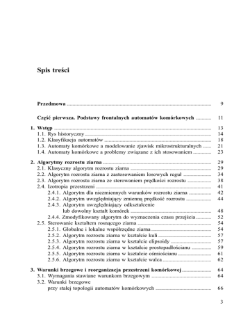 Spis treci Przedmowa ........................................................................................................ 9 Czêæ pierwsza. Podstawy frontalnych automatów komórkowych ........... 11 1. Wstêp ................................................................................................................. 1.1. Rys historyczny ........................................................................................... 1.2. Klasyfikacja automatów ............................................................................. 1.3. Automaty komórkowe a modelowanie zjawisk mikrostrukturalnych ...... 1.4. Automaty komórkowe a problemy zwi¹zane z ich stosowaniem ............. 13 14 18 21 23 2. Algorytmy rozrostu ziarna .............................................................................. 2.1. Klasyczny algorytm rozrostu ziarna .......................................................... 2.2. Algorytm rozrostu ziarna z zastosowaniem losowych regu³ .................... 2.3. Algorytm rozrostu ziarna ze sterowaniem prêdkoci rozrostu ................. 2.4. Izotropia przestrzeni ................................................................................... 2.4.1. Algorytm dla niezmiennych warunków rozrostu ziarna ................ 2.4.2. Algorytm uwzglêdniaj¹cy zmienn¹ prêdkoæ rozrostu .................. 2.4.3. Algorytm uwzglêdniaj¹cy odkszta³cenie lub dowolny kszta³t komórek .......................................................... 2.4.4. Zmodyfikowany algorytm do wyznaczenia czasu przejcia ........... 2.5. Sterowanie kszta³tem rosn¹cego ziarna ..................................................... 2.5.1. Globalne i lokalne wspó³rzêdne ziarna ........................................... 2.5.2. Algorytm rozrostu ziarna w kszta³cie kuli ...................................... 2.5.3. Algorytm rozrostu ziarna w kszta³cie elipsoidy ............................. 2.5.4. Algorytm rozrostu ziarna w kszta³cie prostopad³ocianu .............. 2.5.5. Algorytm rozrostu ziarna w kszta³cie omiocianu ........................ 2.5.6. Algorytm rozrostu ziarna w kszta³cie walca ................................... 29 29 34 38 41 42 44 3. Warunki brzegowe i reorganizacja przestrzeni komórkowej ..................... 3.1. Wymagania stawiane warunkom brzegowym ........................................... 3.2. Warunki brzegowe przy sta³ej topologii automatów komórkowych ........................................ 64 64 48 52 54 54 57 57 59 61 62 66 3 3.3. Warunki brzegowe przy zmiennej topologii automatów komórkowych .................................. 3.3.1. Odrzucenie po³owy modelowej przestrzeni (halving) ................... 3.3.2. Przecinanie i sk³adanie przestrzeni (cutting and bonding) ............ 3.3.3. Podwojenie przestrzeni .................................................................... 3.3.4. Wyprostowanie przestrzeni automatów komórkowych ................. 3.4. Wskazówki do wyboru warunków brzegowych ........................................ 75 76 80 83 84 85 4. Opracowanie i zastosowanie frontalnych automatów komórkowych ....... 4.1. Konwencjonalne automaty komórkowe .................................................... 4.2. Frontalne automaty komórkowe ................................................................ 4.3. Przyk³ady oszacowañ nak³adów obliczeniowych ..................................... 4.4. Uniwersalny frontalny automat komórkowy ............................................. 87 87 89 94 95 5. Przygotowanie danych do tworzenia siatki metody elementów skoñczonych ..................................................................... 5.1. Zasady przygotowania danych ................................................................... 5.1.1. Wczytywanie informacji o mikrostrukturze ................................... 5.1.2. Sprawdzenie ci¹g³oci ziaren .......................................................... 5.1.3. Eliminacja zbyt drobnych ziaren ..................................................... 5.1.4. Stworzenie listy komórek le¿¹cych na granicach ziaren ................ 5.1.5. Lista p³aszczyzn styku ziaren .......................................................... 5.1.6. Uporz¹dkowanie cianek komórek na powierzchni styku dwóch ziaren, sprawdzenie ich ci¹g³oci i wyznaczenie konturu ka¿dej p³aszczyzny .................................... 5.1.7. Stworzenie listy linii dla ka¿dej p³aszczyzny ................................. 5.1.8. Stworzenie listy wszystkich linii ..................................................... 5.1.9. Algorytm sprawdzania linii ............................................................. 5.1.10. Stworzenie i wype³nienie listy linii dla ka¿dego ziarna .............. 5.1.11. Stworzenie i wype³nienie listy wierzcho³ków .............................. 5.1.12. Stworzenie i wype³nienie listy wierzcho³ków dla ka¿dej p³aszczyzny i ziarna oraz list p³aszczyzn i ziaren dla ka¿dego wierzcho³ka ................ 5.1.13. Zapisywanie wyników do plików ................................................. 5.2. Przyk³ady siatek MES ................................................................................ 101 101 103 103 106 106 106 107 108 109 109 111 111 112 112 114 Czêæ druga. Modelowanie zjawisk mikrostrukturalnych .......................... 115 6. Modelowanie pocz¹tkowej mikrostruktury o zadanych parametrach ...... 117 6.1. Zasady i struktura modelu kszta³towania pocz¹tkowej mikrostruktury ....................................................................... 117 6.2. Wybór, okrelenie warunków symulacji i symulacja ................................ 118 4 6.3. Uzyskanie mikrostruktury o zadanym rozk³adzie wielkoci ziaren ......... 6.3.1. Przedstawienie rozk³adu teoretycznego w postaci szeregu rozdzielczego ..................................................... 6.3.2. Wyznaczenie liczby ziaren, reprezentatywnej objêtoci modelowej, sprawdzenie rozmiarów przestrzeni komórk
