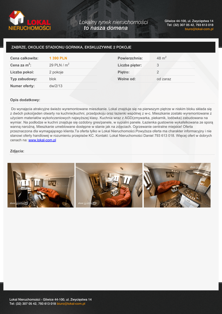 Lokalny rynek nieruchomości to nasza domena Gliwice 44-100, ul. Zwycięstwa 14 Tel: (32) 307 05 42, 793 613 018 [email protected] ZABRZE, OKOLICE STADIONU GORNIKA, EKSKLUZYWNE 2 POKOJE Cena całkowita: 1 390 PLN Powierzchnia: 48 m2 Cena za m2: 29 PLN / m2 Liczba pięter: 3 Liczba pokoi: 2 pokoje Piętro: 2 Typ zabudowy: blok Wolne od: od zaraz Numer oferty: dw/2/13 Opis dodatkowy: Do wynajęcia atrakcyjne świeżo wyremontowane mieszkanie. Lokal znajduje się na pierwszym piętrze w niskim bloku składa się z dwóch pokoi(jeden otwarty na kuchnie)kuchni, przedpokoju oraz łazienki wspólnej z w-c. Mieszkanie zostało wyremontowane z użyciem materiałów wykończeniowych najwyższej klasy. Kuchnia wraz z AGD(zmywarka, piekarnik, lodówka) zabudowana na wymiar. Na podłodze w kuchni znajduje się ozdobny gres/panele, w sypialni panele. Łazienka gustownie wykafelkowana ze sporą wanną narożną. Mieszkanie umeblowane dostępne w stanie jak na zdjęciach. Ogrzewanie centralne miejskie! Oferta przeznaczona dla wymagającego klienta.Ta oferta tylko w Lokal Nieruchomości.Powyższa oferta ma charakter informacyjny i nie stanowi oferty handlowej w rozumieniu przepisów KC. Kontakt: Lokal Nieruchomości Daniel 793 613 018. Więcej ofert w dobrych cenach na: www.lokal-com.pl Zdjęcia: Lokal Nieruchomości - Gliwice 44-100, ul. Zwycięstwa 14 Tel: (32) 307 05 42, 793 613 018 [email protected] Powered by TCPDF (www.tcpdf.org)