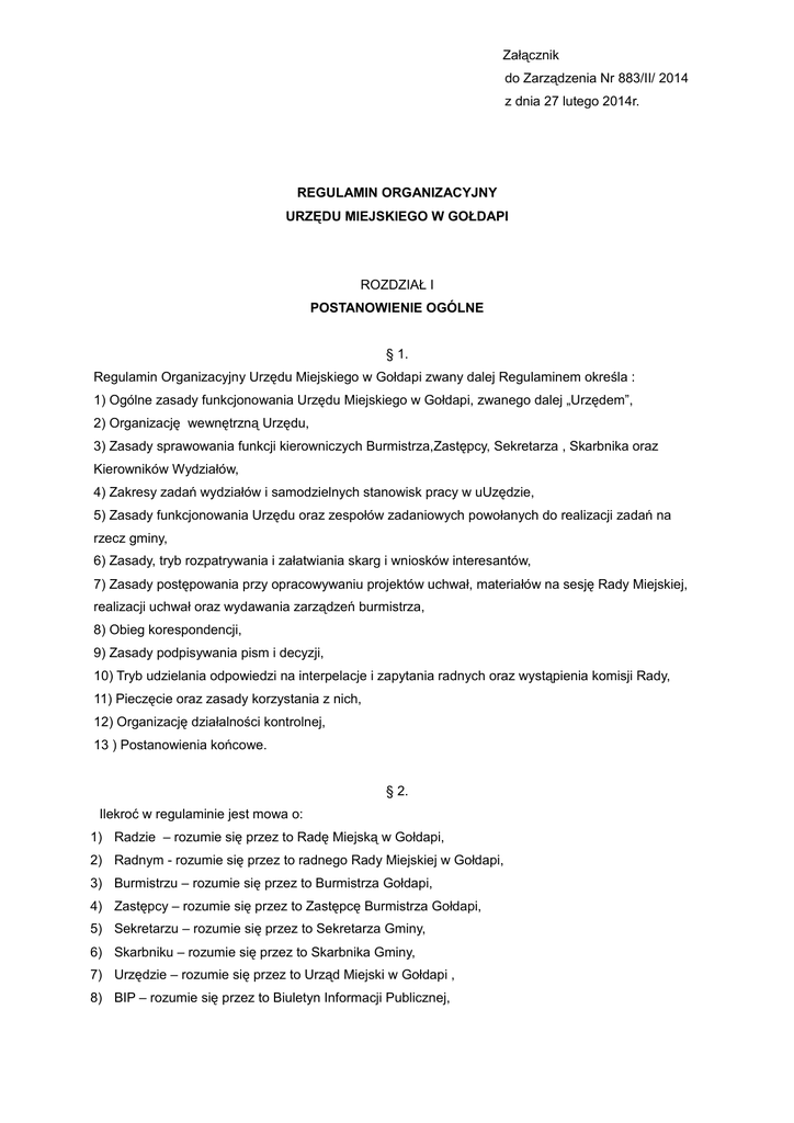 Załącznik do Zarządzenia Nr 883/II/ 2014 z dnia 27 lutego 2014r. REGULAMIN ORGANIZACYJNY URZĘDU MIEJSKIEGO W GOŁDAPI ROZDZIAŁ I POSTANOWIENIE OGÓLNE § 1. Regulamin Organizacyjny Urzędu Miejskiego w Gołdapi zwany dalej Regulaminem określa : 1) Ogólne zasady funkcjonowania Urzędu Miejskiego w Gołdapi, zwanego dalej „Urzędem”, 2) Organizację wewnętrzną Urzędu, 3) Zasady sprawowania funkcji kierowniczych Burmistrza,Zastępcy, Sekretarza , Skarbnika oraz Kierowników Wydziałów, 4) Zakresy zadań wydziałów i samodzielnych stanowisk pracy w uUzędzie, 5) Zasady funkcjonowania Urzędu oraz zespołów zadaniowych powołanych do realizacji zadań na rzecz gminy, 6) Zasady, tryb rozpatrywania i załatwiania skarg i wniosków interesantów, 7) Zasady postępowania przy opracowywaniu projektów uchwał, materiałów na sesję Rady Miejskiej, realizacji uchwał oraz wydawania zarządzeń burmistrza, 8) Obieg korespondencji, 9) Zasady podpisywania pism i decyzji, 10) Tryb udzielania odpowiedzi na interpelacje i zapytania radnych oraz wystąpienia komisji Rady, 11) Pieczęcie oraz zasady korzystania z nich, 12) Organizację działalności kontrolnej, 13 ) Postanowienia końcowe. § 2. Ilekroć w regulaminie jest mowa o: 1) Radzie – rozumie się przez to Radę Miejską w Gołdapi, 2) Radnym - rozumie się przez to radnego Rady Miejskiej w Gołdapi, 3) Burmistrzu – rozumie się przez to Burmistrza Gołdapi, 4) Zastępcy – rozumie się przez to Zastępcę Burmistrza Gołdapi, 5) Sekretarzu – rozumie się przez to Sekretarza Gminy, 6) Skarbniku – rozumie się przez to Skarbnika Gminy, 7) Urzędzie – rozumie się przez to Urząd Miejski w Gołdapi , 8) BIP – rozumie się przez to Biuletyn Informacji Publicznej, 9) ustawie samorządowej – rozumie się przez to ustawę z dnia 8 marca 1990r. o samorządzie gminnym (Dz. U. z 2013 r. poz.594), 10) pracownikach samorządowych – rozumie się przez to pracowników zatrudnionych w Urzędzie Miejskim, których status określa ustawa z 21 listopada 2008 r. o pracownikach samorządowych (Dz.U. 2008 nr.223 poz. 1458 z późniejszymi zmianami), 11) Statucie – rozumie się przez to Statut Gminy Gołdap, 12) Kierowniku, zastępcy kierownika – rozumie się przez to kierownika lub zastępcę kierownika wydziału Urzędu Miejskiego, Kierownika USC, Komendanta Straży Miejskiej. 13) Wydziale – rozumie się przez to wydziały Urzędu Miejskiego. § 3. 1. Siedziba Urzędu Miejskiego mieści się w Gołdapi przy Placu Zwycięstwa 14. 2. Urząd jest czynny w dniach roboczych w godzinach od 7 15 do 1515, przy czym w każdy poniedziałek od 800 do 1600. § 4. 1. Urząd Miejski w Gołdapi jest jednostką organizacyjną, przy pomocy której Burmistrz, jako organ wykonawczy, wykonuje swoje zadania. 2. Urząd zapewnia każdemu dostęp do informacji publicznej związanej z jego działalnością i działalnością organów gminy. 3. Udostępnianie informacji publicznej i dokumentów urzędowych odbywa się w oparciu o ustawę z dnia 6 września 2001 r. o dostępie do informacji publicznej (Dz.U. Nr 112, poz.1198 ze zm.) 4. Podstawą informacji o działalności Urzędu i organów gminy jest Biuletyn Informacji Publicznej oraz tablica ogłoszeń. 5. Urząd przestrzega zasad i trybów określonych w przepisach prawa powszechnie obowiązujących w zakresie danych osobowych prawa do prywatności i tajemnic prawnie chronionych. § 5. Urząd realizuje zadania: 1) Własne gminy wynikające z przepisów prawa, 2) Z zakresu administracji rządowej, których wykonanie zlecono gminie na mocy obowiązujących ustaw, 3) Z zakresu administracji rządowej, powierzone gminie na podstawie porozumienia, 4) Publiczne, powierzone gminie w drodze porozumienia komunalnego. ROZDZIAŁ II OGÓLNE ZASADY FUNKCJONOWANIA URZĘDU § 6. Podział zadań pomiędzy członków Kierownictwa Urzędu: 1. Za sprawy polityki gminy oraz kierowanie Urzędem odpowiada Burmistrz. 2. Za realizację zadań w poszczególnych obszarach funkcjonowania gminy odpowiadają Zastępca , Sekretarz i Skarbnik. 2 3. Za zapewnienie sprawnego funkcjonowania Urzędu i należytego załatwiania spraw odpowiada Sekretarz. § 7. 1. Kierownikiem Urzędu jest Burmistrz. 2. Burmistrz jest zwierzchnikiem służbowym wszystkich pracowników Urzędu oraz kierowników gminnych jednostek organizacyjnych. 3. Czynności w sprawach z zakresu prawa pracy w stosunku do pracowników Urzędu, kierowników gminnych jednostek organizacyjnych, z zastrzeżeniem przepisów szczególnych, wykonuje Burmistrz. 4. Do realizacji zadań, o których mowa w ust. 3, Burmistrz może upoważnić innych pracowników Urzędu. 5. Burmistrz kieruje pracą Urzędu przy pomocy Zastępcy , Skarbnika, Sekretarza i Kierowników Wydziałów. 6. Burmistrz może upoważnić wskazanych imiennie pracowników Urzędu do wydawania decyzji administracyjnych i wykonywania określonych zadań. 7. W czasie nieobecności Burmistrza jego zadania wykonuje Zastępca z wyłączeniem spraw z zakresu: 1) Zatrudniania i zwalniania pracowników Urzędu i dyrektorów gminnych jednostek organizacyjnych, 2) Awansowania i zmiany składników wynagradzania pracowników Urzędu, 3) Przyznawania nagród i wyróżnień pracownikom Urzędu i kierownikom gminnych jednostek organizacyjnych. 8. Kierownicy poszczególnych Wydziałów kierują i zarządzają nimi w sposób zapewniający optymalną realizację zadań Wydziałów i ponoszą za to odpowiedzialność przed Burmistrzem. 9. Kierownicy poszczególnych Wydziałów są bezpośrednimi przełożonymi podległych im pracowników i sprawują nadzór nad nimi. 10.Wykaz upoważnień, o których mowa w ust.6 prowadzony jest na stanowisku d.s. kadr i płac. § 8. Pracownicy Urzędu w wykonywaniu swoich obowiązków i zadań działają w zgodzie z zapisami Kodeksu Etycznego Pracownika Urzędu Miejskiego w Gołdapi oraz na podstawie i w granicach obowiązujących przepisów prawa. ROZDZIAŁ III ORGANIZACJA WEWNĘTRZNA URZĘDU 