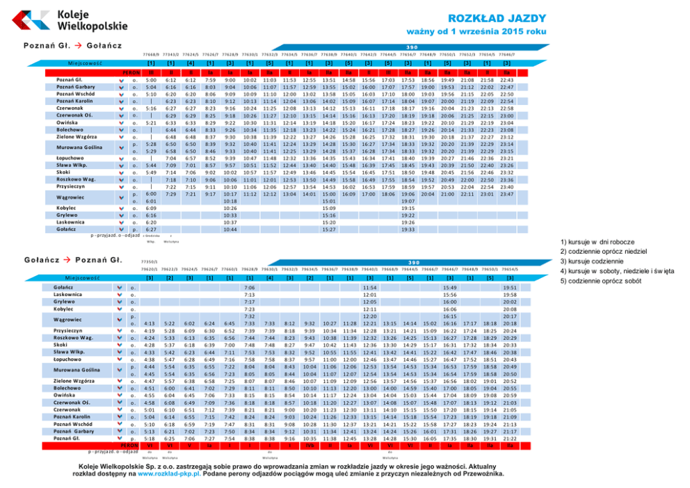 ROZKŁAD JAZDY ważny od 1 września 2015 roku 7 7 6 6 8 /9 7 7 3 4 3 /2 7 7 6 2 4 /5 7 7 6 2 6 /7 7 7 6 2 8 /9 7 7 6 3 0 /1 7 7 6 3 2 /3 7 7 6 3 4 /5 7 7 6 3 6 /7 7 7 6 3 8 /9 7 7 6 4 0 /1 7 7 6 4 2 /3 7 7 6 4 4 /5 7 7 6 5 6 /7 7 7 6 4 8 /9 7 7 6 5 0 /1 7 7 6 5 2 /3 7 7 6 5 4 /5 7 7 6 4 6 /7 Mi e js co w o ś ć Poznań G ł. Poznań G arbary Poznań W schód Poznań K arolin Czerwonak Czerwonak Oś. Owińska Bolechowo Zielone W zgórza Murowana G oślina Łopuchowo Sława W lkp. Skoki Roszkowo W ag. Przysieczyn W ągrowiec K obylec G rylewo Laskownica G ołańcz PERON o. o. o. o. o. o. o. o. o. p. o. o. o. o. o. o. p. o. o. o. o. p. p - przyja zd. o - odja zd [1] [1] [4] [1] [3] [1] [5] [1] [1] [3] [5] [3] [5] [3] [1] [5] [3] [1] [3] III 5:00 5:04 5:10 | 5:16 | 5:21 | | 5:28 5:29 | 5:44 5:49 | | 6:00 6:01 6:09 6:16 6:20 6:27 II 6:12 6:16 6:20 6:23 6:27 6:29 6:33 6:44 6:48 6:50 6:58 7:04 7:09 7:14 7:18 7:22 7:29 II 6:12 6:16 6:20 6:23 6:27 6:29 6:33 6:44 6:48 6:50 6:50 6:57 7:01 7:06 7:10 7:15 7:21 Ia 7:59 8:03 8:06 8:10 8:23 8:25 8:29 8:33 8:37 8:39 8:46 8:52 8:57 9:02 9:06 9:11 9:17 Ia 9:00 9:04 9:09 9:12 9:16 9:18 9:22 9:26 9:30 9:32 9:33 9:39 9:57 10:02 10:06 10:10 10:17 10:18 10:26 10:33 10:37 10:44 Ia 10:02 10:06 10:09 10:13 10:24 10:26 10:30 10:34 10:38 10:40 10:40 10:47 10:51 10:57 11:01 11:06 11:12 lla 11:03 11:07 11:10 11:14 11:25 11:27 11:31 11:35 11:39 11:41 11:41 11:48 11:52 11:57 12:01 12:06 12:12 II 11:53 11:57 12:00 12:04 12:08 12:10 12:14 12:18 12:22 12:24 12:25 12:32 12:44 12:49 12:53 12:57 13:04 la 12:55 12:59 13:02 13:06 13:13 13:15 13:19 13:23 13:27 13:29 13:29 13:36 13:40 13:46 13:50 13:54 14:01 lla 13:51 13:55 13:58 14:02 14:12 14:14 14:18 14:22 14:26 14:28 14:28 14:35 14:40 14:45 14:49 14:53 15:00 15:01 15:09 15:16 15:20 15:27 lla 14:58 15:02 15:05 15:09 15:13 15:16 15:20 15:24 15:28 15:30 15:37 15:43 15:48 15:54 15:58 16:02 16:09 ll 15:56 16:00 16:03 16:07 16:11 16:13 16:17 16:21 16:25 16:27 16:28 16:34 16:39 16:45 16:49 16:53 17:00 lll 17:03 17:07 17:10 17:14 17:18 17:20 17:24 17:28 17:32 17:34 17:34 17:41 17:45 17:51 17:55 17:59 18:06 lla 17:53 17:57 18:00 18:04 18:17 18:19 18:23 18:27 18:31 18:33 18:33 18:40 18:45 18:50 18:54 18:59 19:06 19:07 19:15 19:22 19:26 19:33 lla 18:56 19:00 19:03 19:07 19:16 19:18 19:22 19:26 19:30 19:32 19:32 19:39 19:43 19:48 19:52 19:57 20:04 lla 19:49 19:53 19:56 20:00 20:04 20:06 20:10 20:14 20:18 20:20 20:20 20:27 20:39 20:45 20:49 20:53 21:00 lla 21:08 21:12 21:15 21:19 21:23 21:25 21:29 21:33 21:37 21:39 21:39 21:46 21:50 21:56 22:00 22:04 22:11 ll 21:58 22:02 22:05 22:09 22:13 22:15 22:19 22:23 22:27 22:29 22:29 22:36 22:40 22:46 22:50 22:54 23:01 lla 22:43 22:47 22:50 22:54 22:58 23:00 23:04 23:08 23:12 23:14 23:15 23:21 23:26 23:32 23:36 23:40 23:47 z Gro d ziska z Wlkp . Wo lsztyn a 7 7 3 5 0 /1 7 9 6 2 0 /1 7 9 6 2 2 /3 7 9 6 2 4 /5 7 9 6 2 6 /7 7 7 6 6 0 /1 7 9 6 2 8 /9 7 9 6 3 0 /1 7 9 6 3 2 /3 7 9 6 3 4 /5 7 9 6 3 6 /7 7 9 6 3 8 /9 7 9 6 4 0 /1 7 9 6 6 8 /9 7 9 6 4 4 /5 7 9 6 6 6 /7 7 9 6 4 6 /7 7 9 6 4 8 /9 7 9 6 5 0 /1 7 9 6 5 4 /5 Mi e js co w o ś ć G ołańcz Laskownica G rylewo K obylec W ągrowiec Przysieczyn Roszkowo W ag. Skoki Sława W lkp. Łopuchowo Murowana G oślina Zielone W zgórza Bolechowo Owińska Czerwonak Oś. Czerwonak Poznań K arolin Poznań W schód Poznań G arbary Poznań G ł. [3] o. o. o. o. p. o. o. o. o. o. o. p. o. o. o. o. o. o. o. o. o. p. PERON p - przyja zd. o - odja zd 4:13 4:19 4:24 4:28 4:33 4:38 4:44 4:45 4:47 4:51 4:55 4:58 5:01 5:04 5:10 5:13 5:18 VI [2] 5:22 5:28 5:33 5:37 5:42 5:47 5:54 5:54 5:57 6:00 6:04 6:08 6:10 6:14 6:18 6:21 6:25 VI [3] 6:02 6:09 6:13 6:18 6:23 6:28 6:35 6:35 6:38 6:41 6:45 6:49 6:51 6:55 6:59 7:02 7:06 V [1] 6:24 6:30 6:35 6:39 6:44 6:49 6:55 6:56 6:58 7:02 7:06 7:09 7:12 7:15 7:19 7:23 7:27 Ia [1] [1] 6:45 6:52 6:56 7:00 7:11 7:16 7:22 7:23 7:25 7:29 7:33 7:36 7:39 7:42 7:47 7:50 7:54 I 7:06 7:13 7:17 7:23 7:32 7:33 7:39 7:44 7:48 7:53 7:58 8:04 8:05 8:07 8:11 8:15 8:18 8:21 8:24 8:31 8:34 8:38 I [4] 7:33 7:39 7:44 7:48 7:53 7:58 8:04 8:05 8:07 8:11 8:15 8:18 8:21 8:24 8:31 8:34 8:38 I [3] 8:12 8:18 8:23 8:27 8:32 8:37 8:43 8:44 8:46 8:50 8:54 8:57 9:00 9:03 9:08 9:12 9:16 I [2] 9:32 9:39 9:43 9:47 9:52 9:57 10:04 10:04 10:07 10:10 10:14 10:18 10:20 10:24 10:28 10:31 10:35 lVb [1] 10:27 10:34 10:38 10:42 10:55 11:00 11:06 11:07 11:09 11:13 11:17 11:20 11:23 11:26 11:30 11:34 11:38 II [1] [3] 11:28 11:34 11:39 11:43 11:55 12:00 12:06 12:07 12:09 12:20 12:24 12:27 12:30 12:33 12:37 12:41 12:45 Ia 11:54 12:01 12:05 12:11 12:20 12:21 12:28 12:32 12:36 12:41 12:46 12:53 12:54 12:56 13:00 13:04 13:07 13:11 13:15 13:21 13:24 13:28 VI [1] 13:15 13:21 13:26 13:30 13:42 13:47 13:54 13:54 13:57 14:00 14:04 14:08 14:10 14:14 14:21 14:24 14:28 VI do do do do Wo lsztyn a Wo lsztyn a Wo lsztyn a Wo lsztyn a [5] 14:14 14:21 14:25 14:29 14:41 14:46 14:53 14:53 14:56 14:59 15:03 15:07 15:15 15:18 15:22 15:26 15:30 VI [1] [3] 15:02 15:09 15:13 15:17 15:22 15:27 15:34 15:34 15:37 15:40 15:44 15:48 15:50 15:54 15:58 16:01 16:05 II 15:49 15:56 16:00 16:06 16:15 16:16 16:22 16:27 16:31 16:42 16:47 16:53 16:54 16:56 17:00 17:04 17:07 17:20 17:23 17:27 17:31 17:35 Ia [1] 17:17 17:24 17:28 17:32 17:47 17:52 17:59 17:59 18:02 18:05 18:09 18:13 18:15 18:19 18:23 18:26 18:30 lla [5] [3] 18:18 18:25 18:29 18:34 18:46 18:51 18:58 18:58 19:01 19:04 19:08 19:12 19:14 19:18 19:24 19:27 19:31 lla 19:51 19:58 20:02 20:08 20:17 20:18 20:24 20:29 20:33 20:38 20:43 20:49 20:50 20:52 20:55 20:59 21:03 21:05 21:09 21:13 21:17 21:22 lla Koleje Wielkopolskie Sp. z o.o. zastrzegają sobie prawo do wprowadzania zmian w rozkładzie jazdy w okresie jego ważności. Aktualny rozkład dostępny na www.rozklad-pkp.pl. Podane perony odjazdów pociągów mogą uleć zmianie z przyczyn niezależnych od Przewoźnika. 1) 2) 3) 4) 5) kursuje w dni robocze codziennie oprócz niedziel kursuje codziennie kursuje w soboty, niedziele i św ięta codziennie oprócz sobót