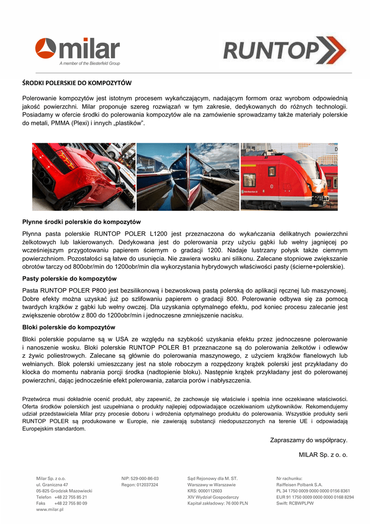 ŚRODKI POLERSKIE DO KOMPOZYTÓW Polerowanie kompozytów jest istotnym procesem wykańczającym, nadającym formom oraz wyrobom odpowiednią jakość powierzchni. Milar proponuje szereg rozwiązań w tym zakresie, dedykowanych do różnych technologii. Posiadamy w ofercie środki do polerowania kompozytów ale na zamówienie sprowadzamy także materiały polerskie do metali, PMMA (Plexi) i innych „plastików”. Płynne środki polerskie do kompozytów Płynna pasta polerskie RUNTOP POLER L1200 jest przeznaczona do wykańczania delikatnych powierzchni żelkotowych lub lakierowanych. Dedykowana jest do polerowania przy użyciu gąbki lub wełny jagnięcej po wcześniejszym przygotowaniu papierem ściernym o gradacji 1200. Nadaje lustrzany połysk także ciemnym powierzchniom. Pozostałości są łatwe do usunięcia. Nie zawiera wosku ani silikonu. Zalecane stopniowe zwiększanie obrotów tarczy od 800obr/min do 1200obr/min dla wykorzystania hybrydowych właściwości pasty (ścierne+polerskie). Pasty polerskie do kompozytów Pasta RUNTOP POLER P800 jest bezsilikonową i bezwoskową pastą polerską do aplikacji ręcznej lub maszynowej. Dobre efekty można uzyskać już po szlifowaniu papierem o gradacji 800. Polerowanie odbywa się za pomocą twardych krążków z gąbki lub wełny owczej. Dla uzyskania optymalnego efektu, pod koniec procesu zalecanie jest zwiększenie obrotów z 800 do 1200obr/min i jednoczesne zmniejszenie nacisku. Bloki polerskie do kompozytów Bloki polerskie popularne są w USA ze względu na szybkość uzyskania efektu przez jednoczesne polerowanie i nanoszenie wosku. Bloki polerskie RUNTOP POLER B1 przeznaczone są do polerowania żelkotów i odlewów z żywic poliestrowych. Zalecane są głównie do polerowania maszynowego, z użyciem krążków flanelowych lub wełnianych. Blok polerski umieszczany jest na stole roboczym a rozpędzony krążek polerski jest przykładany do klocka do momentu nabrania porcji środka (nadtopienie bloku). Następnie krążek przykładany jest do polerowanej powierzchni, dając jednocześnie efekt polerowania, zatarcia porów i nabłyszczenia. Przetwórca musi dokładnie ocenić produkt, aby zapewnić, że zachowuje się właściwie i spełnia inne oczekiwane właściwości. Oferta środków polerskich jest uzupełniana o produkty najlepiej odpowiadające oczekiwaniom użytkowników. Rekomendujemy udział przedstawiciela Milar przy procesie doboru i wdrożenia optymalnego produktu do polerowania. Wszystkie produkty serii RUNTOP POLER są produkowane w Europie, nie zawierają substancji niedopuszczonych na terenie UE i odpowiadają Europejskim standardom. Zapraszamy do współpracy. MILAR Sp. z o. o.