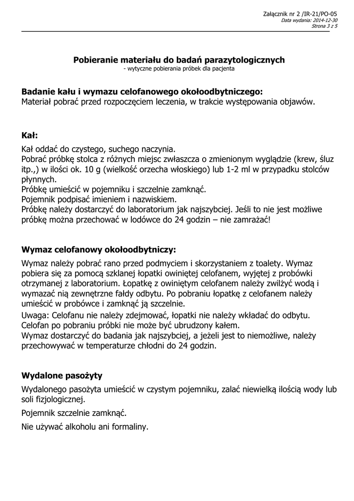 Załącznik nr 2 /IR-21/PO-05 Data wydania: 2014-12-30 Strona 3 z 5 Pobieranie materiału do badań parazytologicznych - wytyczne pobierania próbek dla pacjenta Badanie kału i wymazu celofanowego okołoodbytniczego: Materiał pobrać przed rozpoczęciem leczenia, w trakcie występowania objawów. Kał: Kał oddać do czystego, suchego naczynia. Pobrać próbkę stolca z różnych miejsc zwłaszcza o zmienionym wyglądzie (krew, śluz itp.,) w ilości ok. 10 g (wielkość orzecha włoskiego) lub 1-2 ml w przypadku stolców płynnych. Próbkę umieścić w pojemniku i szczelnie zamknąć. Pojemnik podpisać imieniem i nazwiskiem. Próbkę należy dostarczyć do laboratorium jak najszybciej. Jeśli to nie jest możliwe próbkę można przechować w lodówce do 24 godzin – nie zamrażać! Wymaz celofanowy okołoodbytniczy: Wymaz należy pobrać rano przed podmyciem i skorzystaniem z toalety. Wymaz pobiera się za pomocą szklanej łopatki owiniętej celofanem, wyjętej z probówki otrzymanej z laboratorium. Łopatkę z owiniętym celofanem należy zwilżyć wodą i wymazać nią zewnętrzne fałdy odbytu. Po pobraniu łopatkę z celofanem należy umieścić w probówce i zamknąć ją szczelnie. Uwaga: Celofanu nie należy zdejmować, łopatki nie należy wkładać do odbytu. Celofan po pobraniu próbki nie może być ubrudzony kałem. Wymaz dostarczyć do badania jak najszybciej, a jeżeli jest to niemożliwe, należy przechowywać w temperaturze chłodni do 24 godzin. Wydalone pasożyty Wydalonego pasożyta umieścić w czystym pojemniku, zalać niewielką ilością wody lub soli fizjologicznej. Pojemnik szczelnie zamknąć. Nie używać alkoholu ani formaliny.
