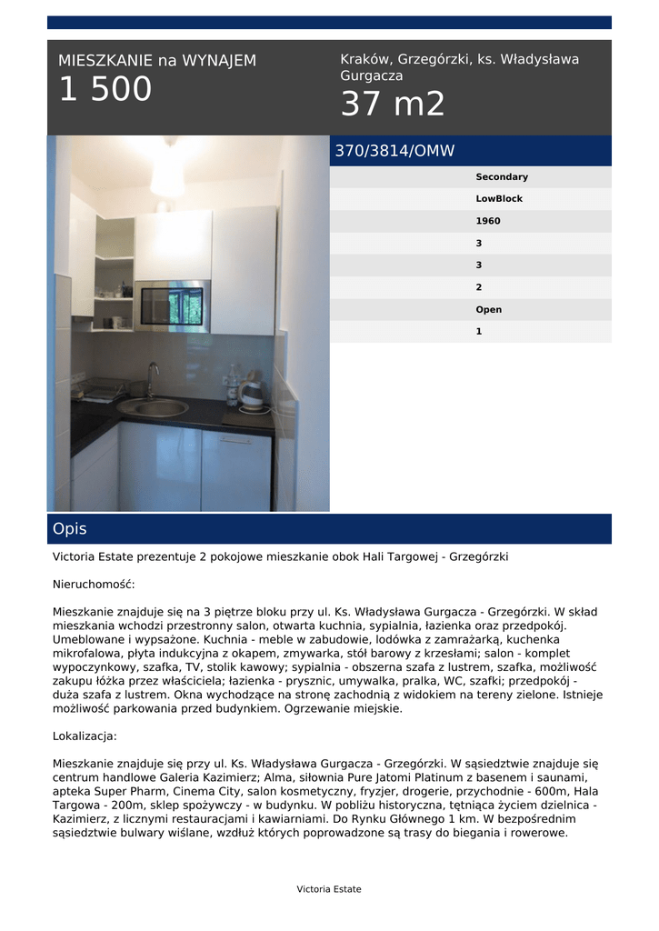 MIESZKANIE na WYNAJEM 1 500 Kraków, Grzegórzki, ks. Władysława Gurgacza 37 m2 370/3814/OMW Secondary LowBlock 1960 3 3 2 Open 1 Opis Victoria Estate prezentuje 2 pokojowe mieszkanie obok Hali Targowej - Grzegórzki Nieruchomość: Mieszkanie znajduje się na 3 piętrze bloku przy ul. Ks. Władysława Gurgacza - Grzegórzki. W skład mieszkania wchodzi przestronny salon, otwarta kuchnia, sypialnia, łazienka oraz przedpokój. Umeblowane i wypsażone. Kuchnia - meble w zabudowie, lodówka z zamrażarką, kuchenka mikrofalowa, płyta indukcyjna z okapem, zmywarka, stół barowy z krzesłami; salon - komplet wypoczynkowy, szafka, TV, stolik kawowy; sypialnia - obszerna szafa z lustrem, szafka, możliwość zakupu łóżka przez właściciela; łazienka - prysznic, umywalka, pralka, WC, szafki; przedpokój duża szafa z lustrem. Okna wychodzące na stronę zachodnią z widokiem na tereny zielone. Istnieje możliwość parkowania przed budynkiem. Ogrzewanie miejskie. Lokalizacja: Mieszkanie znajduje się przy ul. Ks. Władysława Gurgacza - Grzegórzki. W sąsiedztwie znajduje się centrum handlowe Galeria Kazimierz; Alma, siłownia Pure Jatomi Platinum z basenem i saunami, apteka Super Pharm, Cinema City, salon kosmetyczny, fryzjer, drogerie, przychodnie - 600m, Hala Targowa - 200m, sklep spożywczy - w budynku. W pobliżu historyczna, tętniąca życiem dzielnica Kazimierz, z licznymi restauracjami i kawiarniami. Do Rynku Głównego 1 km. W bezpośrednim sąsiedztwie bulwary wiślane, wzdłuż których poprowadzone są trasy do biegania i rowerowe. Victoria Estate Okolica bardzo dobrze skomunikowana z resztą miasta - linie tramwajowe i autobusowe, do najbliższego przystanku MPK " Rondo Grzegórzeckie" - 3 min. Komunikacja: Tramwaje: 0, 1, 14, 20, 22,50, 70, 72, 74 Autobusy: 125, 184, 605, 703 Opłaty: 1500 zł najem + 330 zł czynsz adm. (zawiera opłaty za media) + prąd Polecam i zapraszam ! Emilia Sumińska tel. +48 512 704 621 email: [email protected] Victoria Estate Powered by TCPDF (www.tcpdf.org)