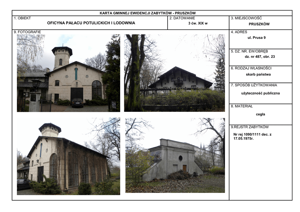 1. OBIEKT 9. FOTOGRAFIE KARTA GMINNEJ EWIDENCJI ZABYTKÓW - PRUSZKÓW 2. DATOWANIE OFICYNA PAŁACU POTULICKICH I LODOWNIA 3 ćw. XIX w 3. MIEJSCOWOŚĆ PRUSZKÓW 4. ADRES ul. Prusa 9 5. DZ. NR. EW/OBRĘB dz. nr 487, obr. 23 6. RODZAJ WŁASNOŚCI skarb państwa 7. SPOSÓB UśYTKOWANIA uŜyteczność publiczna 8. MATERIAŁ cegła 9.REJSTR ZABYTKÓW Nr rej 1090/1111 dec. z 17.05.1975r. 10. UWAGI INFORMACJE HISTORYCZNE Budynek oficyny wraz z wozownią stanowi część załoŜenia pałacowo-parkowego pałacyku Potulickich. Datowany na 3 ćw. XIX w. Po II wojnie światowej budynek adaptowany na cele muzeum, po roku 1976 nadbudowany w części środkowej, wymieniona została i ujednolicona stolarka okienna i drzwiowa (przywrócenie form w części z wieŜą). KRÓTKA CHARAKTERYSTYKA Budynek wolnostojący, usytuowany od strony wsch. pałacyku, o tynkowanych elewacjach, zaprojektowany w historyzujących, malowniczych formach. Jednokondygnacyjny, wzniesiony na rzucie zbliŜonym do litery T, składa się z podłuŜnego segmentu północnego oraz znacznie wyŜszej, poprzecznej partii wsch. Obie części powiązane czworoboczną wieŜyczką o ściętych naroŜnikach i namiotowym daszku. Poszczególne segmenty kryte dwuspadowym dachem o blaszanym poszyciu z silnie wysuniętymi okapami wspartymi na snycerskich wspornikach. Elewacja szczytowa od strony pn. uzyskała w partii szczytu niewielki, drewniany balkon. Segment pd. akcentowany w partii przyziemia boniowaniem pasowym posiada od strony elewacji szczytowych triadę osi z czego skrajna oś wypełnia arkadowo zamknięty otwór okienny, pozostałe osadzone w arkadowych płycinach lub w formie blendy posiadają bramę wjazdową na środkowej osi elewacji zachodniej i wejście z małym okienkiem na przeciwległych skrajnych osiach. Elewacja pd., przepruta wysokimi, odcinkowo zamkniętymi otworami okiennymi. Dawna Lodownia zlokalizowana od strony wsch. w stosunku do oficyny. Jest to niski parterowy budynek, o zwartej bryle na planie prostokąta, częściowo zagłębiony w ziemi. Elewacja od strony zach. zawiera wejście ujęte szerokimi lizenami i zwieńczona jest pełną attyką poprzedzoną uskokowym gzymsem. STAN ZACHOWANIA Dobry. BIBLIOGRAFIA Biała Karta Ewidencyjna, aut. J. Kalicki 1976 r., zbiory WUOZ Katalog Zabytków Sztuki w Polsce, t. X., woj. Warszawskie, pow. Pruszkowski B.Mielczarka, Szkice z dziejów Pruszkowa, Rocznik Pruszkowski 1978 M. Skwara, Historia Pruszkowa w zarysie, Pruszków 2005 AUTOR I DATA WYKONANIA KARTY EWIDENCYJNEJ: Jan Szuliński – Listopad 2009 Karta po wypełnieniu podlega ochronie na podstawie przepisów Prawa Autorskiego