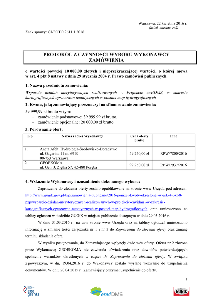 Warszawa, 22 kwietnia 2016 r. (dzień, miesiąc, rok) Znak sprawy: GI-FOTO.2611.1.2016 PROTOKÓŁ Z CZYNNOŚCI WYBORU WYKONAWCY ZAMÓWIENIA o wartości powyżej 10 000,00 złotych i nieprzekraczającej wartości, o której mowa w art. 4 pkt 8 ustawy z dnia 29 stycznia 2004 r. Prawo zamówień publicznych. 1. Nazwa przedmiotu zamówienia: Wsparcie działań merytorycznych realizowanych w Projekcie enviDMS, w zakresie kartograficznych opracowań tematycznych w postaci map hydrograficznych 2. Kwota, jaką zamawiający przeznaczył na sfinansowanie zamówienia: 59 999,99 zł brutto w tym: zamówienie podstawowe: 39 999,99 zł brutto, zamówienie opcjonalne: 20 000,00 zł brutto. 3. Porównanie ofert: L.p. 1. 2. Nazwa i adres Wykonawcy Aneta Afelt: Hydrologia-Środowisko-Doradztwo ul. Gagarina 11 m. 69 B 00-753 Warszawa GEOEKOMA ul. Gen. J. Ziętka 57, 42-480 Poręba Cena oferty brutto Inne 59 250,00 zł RPW/7800/2016 92 250,00 zł RPW/7937/2016 4. Wskazanie Wykonawcy i uzasadnienie dokonanego wyboru: Zaproszenie do złożenia oferty zostało opublikowane na stronie www Urzędu pod adresem: http://www.gugik.gov.pl/bip/zamowienia-publiczne/2016-ponizej-kwoty-okreslonej-w-art.-4-pkt-8pzp/wsparcie-dzialan-merytorycznych-realizowanych-w-projekcie-envidms,-w-zakresiekartograficznych-opracowan-tematycznych-w-postaci-map-hydrograficznych oraz umieszczono na tablicy ogłoszeń w siedzibie GUGiK w miejscu publicznie dostępnym w dniu 29.03.2016 r. W dniu 31.03.2016 r., na w/w stronie www Urzędu oraz na tablicy ogłoszeń umieszczono informację o zmianie treści załącznika nr 1 i nr 3 do Zaproszenia do złożenia oferty oraz zmianę terminu składania ofert. W wyniku postępowania, do Zamawiającego wpłynęły dwie w/w oferty. Oferta nr 2 złożona przez Wykonawcę GEOEKOMA nie zawierała oświadczenia oraz dowodów potwierdzających spełnienie warunków określonych w części IV Zaproszenia do złożenia oferty. W związku z powyższym, w dn. 19.04.2016 r. do Wykonawcy zostało wysłane wezwanie do uzupełnienia dokumentów. W dniu 20.04.2015 r. Zamawiający otrzymał uzupełnienie do oferty. 1 W wyniku oceny ofert Zamawiający stwierdził, iż złożone oferty spełniają wymagania określone przez Zamawiającego oraz zawierają oświadczenia potwierdzające spełnienie warunków udziału w postępowaniu określone w Rozdz. IV Zaproszenia do złożenia oferty. Zamawiający dokonał oceny w/w ofert na podstawie kryterium ceny – 100 %, w wyniku czego dokonano wyboru najkorzystniejszej oferty złożonej przez Wykonawcę: Aneta Afelt: Hydrologia-Środowisko-Doradztwo. ZATWIERDZAM WYBÓR WYKONAWCY ........................................................ Data, podpis i pieczęć dyrektora KO 2