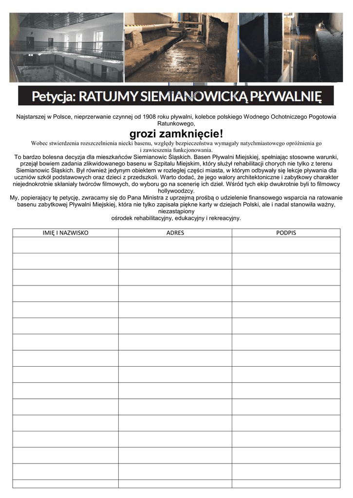 Najstarszej w Polsce, nieprzerwanie czynnej od 1908 roku pływalni, kolebce polskiego Wodnego Ochotniczego Pogotowia Ratunkowego, grozi zamknięcie! Wobec stwierdzenia rozszczelnienia niecki basenu, względy bezpieczeństwa wymagały natychmiastowego opróżnienia go i zawieszenia funkcjonowania. To bardzo bolesna decyzja dla mieszkańców Siemianowic Śląskich. Basen Pływalni Miejskiej, spełniając stosowne warunki, przejął bowiem zadania zlikwidowanego basenu w Szpitalu Miejskim, który służył rehabilitacji chorych nie tylko z terenu Siemianowic Śląskich. Był również jedynym obiektem w rozległej części miasta, w którym odbywały się lekcje pływania dla uczniów szkół podstawowych oraz dzieci z przedszkoli. Warto dodać, że jego walory architektoniczne i zabytkowy charakter niejednokrotnie skłaniały twórców filmowych, do wyboru go na scenerię ich dzieł. Wśród tych ekip dwukrotnie byli to filmowcy hollywoodzcy. My, popierający tę petycję, zwracamy się do Pana Ministra z uprzejmą prośbą o udzielenie finansowego wsparcia na ratowanie basenu zabytkowej Pływalni Miejskiej, która nie tylko zapisała piękne karty w dziejach Polski, ale i nadal stanowiła ważny, niezastąpiony ośrodek rehabilitacyjny, edukacyjny i rekreacyjny. IMIĘ I NAZWISKO ADRES PODPIS