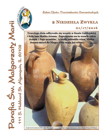 2 N IEDZIELA Z WYKŁA 01/17/2016 Trzeciego dnia odbywało się wesele w Kanie Galilejskiej i była tam Matka Jezusa. Zaproszono na to wesele także Jezusa i Jego uczniów. A kiedy zabrakło wina, Matka Jezusa mówi do Niego: «Nie mają już wina». Jn: 2:1-3 111 S. Hubbard St. Algonquin, lL 60102 Parafia Św. Małgorzaty Marii Zakon Ojców Franciszkanów Konwentualnych REFLEKSJA Puste stągwie, puste serca Bóg jest Bogiem wesela, a nie smutku, tyle że nasza tęsknota za radością od wczesnego dzieciństwa jest narażona na okaleczenie. Te okaleczenia sprawiają, że zamykamy się w sobie, odcinamy się od prawdziwych pragnień, zabraniamy sobie uczuć, przestajemy wierzyć w szczęście, podejrzewamy każdą radość o podstęp cierpienia. Słowa Ewangelii wg Wielu ludzi boi się w piątek przeżyć najskromniejsze rozweselenie, gdyż są przekonani, że niedziela będzie pełna łez. Coraz mniej ludzi wierzy w udane małżeństwa, coraz częściej słowo „rodzina” kojarzy się z torturami psychicznymi. Ludzie zamykają się na doznawanie radości, szukają rozweselenia w uzależnieniach chemicznych, w pracoholizmie, w zajęciach pochłaniających uwagę, w obsesyjnej aktywności nawet o pozorach charytatywnych. W masturbacji i obżarstwie, w seksie i Internecie, upijaniu się piwem i wirtualnych grach, w których mszczą się na wygenerowanych potworach. I wszystko dlatego, że stłumiona tęsknota za prawdziwym weselem została zablokowana. Im bardziej nie wierzą w radość życia, tym usilniej oddają się hedonistycznym imitacjom. Substytuty miłości, czułości, radości, sukcesu, przyjaźni są na wyciągnięcie drżącej ręki. Ale to wszystko tylko depresyjnie pogłębia smutek. Wiele matek daje swym dzieciom jedzenie zamiast czułości, wielu ojców daje dzieciom pieniądze zamiast rozmowy. Wielu ludzi młodych nie ma nic do zaofiarowania partnerom prócz seksu. Wielu ludzi woli oglądać godzinami ekranowe dramaty, niż zaryzykować uświadomienie sobie na minutę własnej tragedii. Odcinamy się od uczuć. Nie chcemy odczuwać głodu serca i zapychamy go czymkolwiek, co nas oszuka na chwilę, a nie zaspokoi na zawsze. św. Jana 2,1-12 W Kanie Galilejskiej odbywało się wesele i była tam Matka Jezusa. Zaproszono na to wesele także Jezusa i Jego uczniów. A kiedy zabrakło wina, Matka Jezusa mówi do Niego: „Nie mają już wina”. Jezus Jej odpowiedział: „Czyż to moja lub Twoja sprawa, Niewiasto? Czyż jeszcze nie nadeszła godzina moja?”. Wtedy Matka Jego powiedziała do sług: „Zróbcie wszystko, cokolwiek wam powie”. Stało zaś tam sześć stągwi kamiennych przeznaczonych do żydowskich oczyszczeń, z których każda mogła pomieścić dwie lub trzy miary. Rzekł do nich Jezus: „Napełnijcie stągwie wodą”. I napełnili je aż po brzegi. Potem do nich powiedział: „Zaczerpnijcie teraz i zanieście staroście weselnemu”. Oni zaś zanieśli. A gdy starosta weselny skosztował wody, która stała się winem - nie wiedział bowiem, skąd ono pochodzi, ale słudzy, którzy czerpali wodę, wiedzieli - przywołał pana młodego i powiedział do niego: „Każdy człowiek stawia najpierw dobre wino, a gdy się napiją, wówczas gorsze. Ty zachowałeś dobre wino aż do tej pory”. Czego naprawdę pragniesz? Szczęścia, czułości, miłości, rozmowy, rozweselenia, które nie jest pustym śmiechem. Kto Taki to początek znaków uczynił Jezus w Kanie ci może to dać? Tylko Jezus zaradził pustce kamiennych Galilejskiej. Objawił swoją chwałę i uwierzyli stągwi. Było ich sześć. To szóstego dnia stworzono człowieka. w Niego Jego uczniowie. Żeby poczuć smak prawdziwego szczęścia, trzeba uczynić to, Następnie On, Jego Matka, bracia i uczniowie Jego co mówi Jezus – zgodnie z zachętą Maryi: „Zróbcie wszystko, udali się do Kafarnaum, gdzie pozostali kilka dni. cokolwiek wam powie”. Wesele w Kanie jest nie tylko wydarzeniem rozpoczynającym szereg cudów Jezusa, ale też symbolem powołania człowieka do przeżywania nieskończonego i niewyczerpalnego wesela. Był trzeci dzień i zabrakło wina, za godzinę lub dwie wesele mogło się skończyć niemiłym zgrzytem. Starosta weselny udawał, że wszystko jest w porządku. Zachowywał pozory panowania nad sytuacją. Jest mnóstwo ludzi, którzy już w połowie życia skazani są na sztuczny uśmiech, skrywający bankructwo uczuć i ducha. Ich radość z życia albo powiedzmy inaczej: ich wesele, stało się kurtyną zasłaniającą rozpacz i beznadzieję, deficyt i rozczarowanie. Im więcej imprez, tym większy lęk przed samotnością, im więcej zmysłowego zaspokojenia i upojenia, tym bardziej okradziony duch. Szczęście nie leży poza nami, lecz jest w naszym wnętrzu – w odkryciu w samotności pełni obecności Ducha Świętego. Któż jednak w to uwierzy? Kto jest owym wiecznym weselem i niegasnącym rozradowaniem dla człowieka? „Jezus rozradował się w Duchu Świętym…” (Łk 10,21) Augustyn Pelanowski OSPPE CZYTANIE Z KSIĘGI PROROKA IZAJASZA IZ 62,1-5 OGŁOSZENIA W poniedziałek 18-go stycznia zapraszamy na Mszę św. o 7 wieczorem i nabożeństwo eucharystyczne. Przez wzgląd na Syjon nie umilknę, przez wzgląd na Jerozolimę nie spocznę, dopóki jej sprawiedliwość nie błyśnie jak zorza i zbawienie jej nie zapłonie jak pochodnia. W sobotę 23-go stycznia od 3 do 6 wieczorem w budynku starej szkoły, organizujemy bal karnawałowy dla dzieci . Bilety do na bycia po Mszy św. w cenie $5 od dziecka. Wówczas narody ujrzą twą sprawiedliwość i chwałę twoją wszyscy królowie. I nazwą cię nowym imieniem, które usta Pana oznaczą. Doroczny Dinner Dance połączony z akcją na rzecz parafii odbędzie się w sobotę 30-go stycznia. Bilety do nabycia po Mszy św. Będziesz prześliczną koroną w rękach Pana, W przyszłą niedzielę 24-go stycznia spotkanie ministrantów po Mszy św. o godzinie 1 PM. królewskim diademem w dłoni twego Boga. Nie będą w