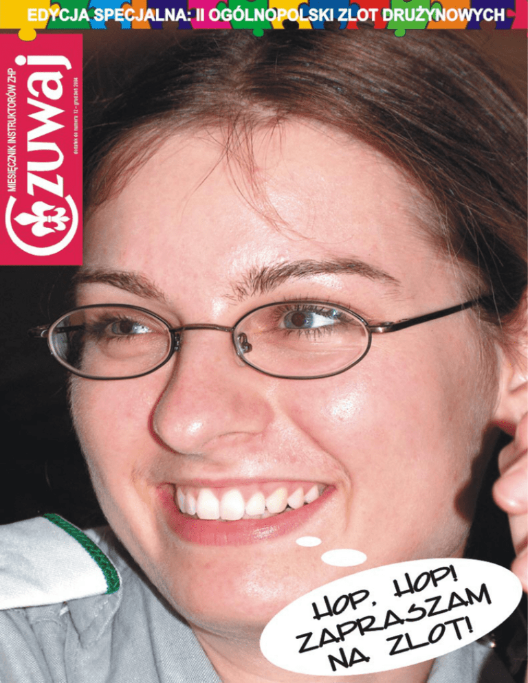 II OGÓLNOPOLSKI ZLOT DRU¯YNOWYCH KRAKÓW 2005 Jest sroga zima, a o lecie ju¿ myœlê nieœmia³o... œpiewamy w grudniowe dni przy kominku. A ja w te grudniowe dni chcê was bardzo œmia³o zaprosiæ do udzia³u w letniej przygodzie, jak¹ na pewno bêdzie II Ogólnopolski Zlot Dru¿ynowych! W sierpniu przysz³ego roku w Krakowie spotkaj¹ siê dru¿ynowi z ca³ej Polski, aby – tak jak w 2003 r. w „Perkozie” – wspólnie siê uczyæ, bawiæ, wymieniaæ doœwiadczeniami i „nakrêcaæ” do dalszej instruktorskiej pracy, a tak¿e rozpocz¹æ ogólnozwi¹zkowe obchody stulecia skautingu. Podczas zlotu odbêd¹ siê prezentacje skautowe, czêœæ zajêæ bêdzie prowadziæ kadra instruktorska ró¿nych organizacji skautowych, odbêdzie siê promocja nowej propozycji programowej ZHP „Jeden œwiat, jedno Przyrzeczenie” i warsztaty przygotowuj¹ce dru¿ynowych do pracy z t¹ propozycj¹ programow¹. Nie wyobra¿am sobie, aby zabrak³o na tym zlocie ciebie, druhno dru¿ynowa i ciebie druhu dru¿ynowy, twojego namiestnictwa, twoich przyjació³ z granatowymi sznurami. To w³aœnie z tej broszurki dowiesz siê, jakie warunki trzeba spe³niæ, aby siê dostaæ na zlot, jakie atrakcje programowe na zlocie ci gwarantujemy, kogo na nim spotkasz, kto bêdzie z nami œpiewa³. A jeœli tu czegoœ nie znajdziesz, zajrzyj na stronê www.zlotdruzynowych.zhp.org.pl. To w³aœnie tam bêdzie siê mo¿na zapisaæ na konkretne zajêcia, powspominaæ poprzedni zlot nuc¹c o burzy, która na nas wali, i podyskutowaæ o kszta³cie tego, który przed nami... hm. Anna Poraj komendantka II Ogólnopolskiego Zlotu Dru¿ynowych 2 INFORMACJE PODSTAWOWE Co? II Ogólnopolski Zlot Dru¿ynowych Gdzie? „Pasternik” (Kraków) Kiedy? 18–21 sierpnia 2005 r. (mo¿liwoœæ uczestnictwa w „Programie krakowskim” w dniach 15–18 sierpnia 2005 r.) Wpisowe: 30 z³ Patrole: minimum 6-osobowe (w tym pe³noletni opiekun) Zg³oszenia: do 31 grudnia 2004 r. Wp³ata: do 15 marca 2005 r. KOMENDA ZLOTU komendantka zlotu hm. Anna Poraj zastêpczyni ds. programowych phm. El¿bieta Czapara zastêpca ds. organizacyjnych hm. Pawe³ Mi³obêdzki zastêpca ds. logistycznych hm. Kazimierz Górka cz³onek komendy ds. pozyskiwania œrodków hm. Piotr Kowalski cz³onek komendy odpowiedzialny za promocjê zlotu phm. Iwona Jakimowicz cz³onek komendy odpowiedzialny za „Program krakowski” phm. Maria Leñczuk KONTAKT Na stronie www.zlotdruzynowych.zhp.org.pl mo¿na zadawaæ pytania, na które staramy siê regularnie odpowiadaæ. Pytania dotycz¹ce programu oraz kadry programowej mo¿na kierowaæ na adres [email protected]. Sprawy organizacyjne: [email protected] · w tym samym czasie i miejscu spotkasz 1000 innych dru¿ynowych · bêdziesz mia³ okazjê do wymiany doœwiadczeñ, podzielenia siê swoimi osi¹gniêciami, porozmawiania o problemach · odwiedzisz Kraków i poznasz jego okolice (m.in. podczas realizacji „Programu krakowskiego”) II OGÓLNOPOLSKI ZLOT DRU¯YNOWYCH KRAKÓW 2005 DLACZEGO WARTO POJECHAÆ NA ZLOT DRU¯YNOWYCH? MIASTECZKO ZLOTOWE Miejsce zlotu – „Pasternik” to dawny poligon wojskowy, le¿¹cy w zachodniej czêœci Krakowa, obok drogi dojazdowej do autostrady A-4 w kierunku Katowic. Mo¿na tam dojechaæ kilkoma liniami mikrobusów kursuj¹cych z Dworca G³ównego w Krakowie do Krzeszowic przez Zabierzów oraz autobusami linii 238 i 248 z Bronowic Nowych w kierunku Zabierkowa. · wzbogacisz swój warsztat pracy o nowe pomys³y · poznasz now¹ propozycjê programow¹ ZHP „Jeden œwiat – jedno Przyrzeczenie” · weŸmiesz udzia³ w ciekawych zajêciach przygotowanych specjalnie dla ciebie · poznasz ciekawych ludzi z krêgu kultury, sportu, telewizji, teatru, polityki · bêdziesz dobrze siê bawiæ podczas koncertów i seansów kina letniego · ciekawie i aktywnie spêdzisz czas Teren zlotu jest bardzo urozmaicony. Porastaj¹ go lasy iglaste (sosny, modrzewie), mieszane i liœciaste (buki, olchy, klony, brzozy), miejscami wystêpuje niskie poszycie i krzewy, tereny podmok³e i jeziorko, czêœæ zachodnia to ³¹ki i teren podobny do stepu, poroœniêty bujn¹ traw¹. Miasteczko zlotowe zostanie podzielone na biwaki. Nad ka¿dym biwakiem bêdzie czuwa³ komendant wraz z zastêpem wartowniczym. Wszystkie patrole uczestnicz¹ce w „Programie krakowskim” – propozycji Chor¹gwi Krakowskiej, rozpoczynaj¹cej siê 3 dni przed zlotem – bêd¹ stanowiæ jeden biwak. Uczestnicy przywo¿¹ ze sob¹ w³asny sprzêt biwakowy. Wy¿ywienie organizowaæ mog¹ w ró¿ny sposób: – we w³asnym zakresie (organizatorzy zapewniaj¹ wtedy darmowy wrz¹tek), – kupuj¹c posi³ki w kantynie zlotowej, – rezerwuj¹c pe³ne wy¿ywienie w bufecie oœrodka. 7 warunków, które nale¿y spe³niæ, aby przyjechaæ na zlot 1. Trzeba byæ dru¿ynowym. 2. Trzeba chcieæ. 3. Trzeba stworzyæ patrol (minimum 6-osobowy). 4. Trzeba zg³osiæ siê do koñca 2004 r. 5. Trzeba zap³aciæ wpisowe 30 z³ do 15 marca 2005 r. 6. Trzeba wykonaæ zadania przedzlotowe. Zajêcia zlotowe odbywaæ siê bêd¹ w kilku miejscach programowych, zapewniaj¹cych uczestnikom dobre warunki do pracy. Na terenie zlotu zorganizowane zostanie Centrum Kultury, ze scen¹, na której wieczorami dziaæ siê bêd¹ ciekawe rzeczy, i telebimem. Bêdzie te¿ kilka kawiarenek tematycznych, ka¿da z nich to inny klimat i temat przewodni. Nie zabraknie te¿ miejsca sprzeda¿y, gdzie bêdzie mo¿na kupiæ podstawowe produkty ¿ywnoœciowe, artyku³y drogeryjne, jak równie¿ ciep³e posi³ki oraz wydawnictwa i artyku³y typowo harcerskie. 7. Trzeba przyjechaæ z du¿ym zapasem energii! Wszelkie bie¿¹ce informacje zlotowe znajdziesz zawsze na stronie internetowej www.zlotdruzynowych.zhp.org.pl. 3 PRZEDZLOTOWE Z A D A N I A II OGÓLNOPOLSKI ZLOT DRU¯YNOWYCH KRAKÓW 2005 1) Ka¿dy patrol ma przygotowaæ stoisko na „Jarmark skautowy”, który odbêdzie siê 19 sierpnia (pi¹tek) w godz. 15.00–17.00. – skautowe obozy – skautowe tradycje – mapa o