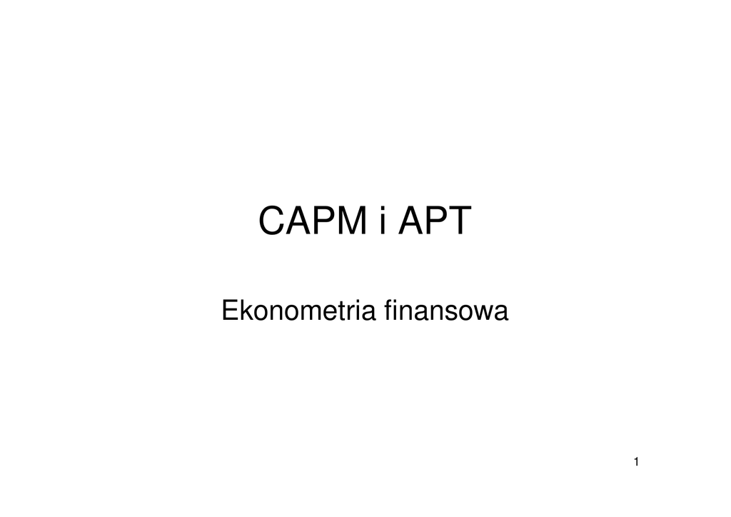 CAPM i APT Ekonometria finansowa 1 Literatura • Elton, Gruber, Brown, Goetzmann (2007) Modern portfolio theory and investment analysis, John Wiley and Sons. (rozdz. 13-16 [, 5, 7]) • Campbell, Lo, MacKinlay (1997) The econometrics of financial markets, Princeton University Press. (rozdz. 5, 6) • Cuthbertson, Nitzsche (2010) Quantitative financial economics…, John Wiley and Sons (rozdz. 5 i 8) 2 Capital Asset Pricing Model • Autorzy (niezależnie) – Sharpe (1964) – Lintner (1965) – Mossin (1966) • APT – Ross (1976, 1977) 3 Zastosowania CAPM • Odpowiednia miara ryzyka dla każdego instrumentu, relacja między stopą zwrotu i ryzykiem dla każdego instrumentu • Pozwala wyliczyć oczekiwaną stopę zwrotu (szacowanie kosztu kapitału, ocena portfela inwestycyjnego, analizy zdarzeń) 4 Założenia CAPM • • • • Brak kosztów transakcyjnych Aktywa finansowe nieskończenie podzielne Brak podatku dochodowego Pojedynczy inwestor nie jest w stanie zmienić ceny instrumentu finansowego (konkurencja doskonała) • Inwestorzy podejmują decyzje wyłącznie na podstawie wartości oczekiwanych zwrotów i odchyleń standardowych swoich portfeli 5 Założenia CAPM (c.d.) • Krótka sprzedaż nieograniczona • Nieograniczona możliwość pożyczania po stopie procentowej bez ryzyka • Inwestorzy są homogeniczni w swoich oczekiwaniach dotyczących: – stóp zwrotu, odchyleń standardowych, korelacji między instrumentami w danym okresie – okresu oceny inwestycji (horyzont inwestycyjny) • Wszystkie aktywa są na sprzedaż 6 CAPM – krótkie wprowadzenie Źródło: http://kupakcje.pl/?p=147 7 CAPM – krótkie wprowadzenie • Granica portfeli efektywnych (efficient frontier) • Prosta CML (capital market line) wyznacza model CAPM: RM − RF σe Re = RF + σM σe = RF + ( RM − RF ) σM • Portfel efektywny leży na prostej CML 8 Interpreptacja RM − RF σe Re = RF + σM (Oczekiwany zwrot)=(cena czasu)+(cena ryzyka)x(wielkość ryzyka) • Wszyscy inwestorzy utrzymują identyczny portfel ryzykownych aktywów – portfel rynkowy (market portfolio) 9 CAPM – krótkie wprowadzenie • Dla pojedynczego instrumentu lub portfela i (efektywnego lub nieefektywnego): Ri = RF + β i ( RM − RF ) 10 Wyprowadzenie (szybkie) • Prawdziwy jest model jednoczynnikowy Ri = α + β i RM • Stopa zwrotu z portfela i jest liniową funkcją β i Ri = a + bβ i • Dla inwestycji bez ryzyka: β i = 0 RF = a + b(0) 11 Wyprowadzenie (szybkie) c.d. • Dla inwestycji w portfel rynkowy: β i = 1 RM = a + b(1) b = ( RM − a ) = ( RM − RF ) • Czyli prawdziwy jest model: βi = σ iM 2 σM Ri = RF + β i ( RM − RF ) RM − RF σ iM Ri = RF + σM σM 12 Interpretacja „bety” • Miara zależności zwrotu z portfela od zwrotu z portfela rynkowego • Indeks ryzyka systematycznego/ niedywersyfikowalnego (systematic risk) • Inwestor oczekuje dodatkowego zwrotu za ryzyko niedywersyfikowalne a nie za to, które da się usunąć poprzez dywersyfikację portfela 13 Rozszerzenia CAPM • • Krótka sprzedaż niedozwolona – brak wpływu Niemożliwe pożyczanie po stopie wolnej od ryzyka: Ri = RZ + β i ( RM − RZ ) „zero-beta CAPM” / „two-factor model” • • • • Opodatkowanie zysków Heterogeniczne oczekiwania Wielookresowy CAPM, Multi-beta CAPM, „Consumption-oriented CAPM”, itp. 14 Wyniki empiryczne • Założenie: model rynkowy prawdziwy Rit = α i + β i RMt + eit • Wartość oczekiwana z modelu: Ri = α i + β i RM • po odjęciu równań powyżej: Rit = Ri + β i ( RMt − RM ) + eit ale Ri = RF + β i ( RM − RF ) • Końcowy model: Rit = RF + βi ( RMt − RF ) + eit Rit − RF = β i ( RMt − RF ) + eit 15 Sposoby szacowania parametrów modelu CAPM • standardowy CAPM – Kowariancja Ri i Rm oraz wariancja Rm z próby – KMNK – model regresji + GARCH • warunkowy CAPM – EWMA – MGARCH (np. GARCH-BEKK), GARCH-M – UMM – modele przestrzeni stanów 16 Sposoby szacowania CAPM (1) Model CAPM: E ( Rit ) − RF = β i ( E ( RMt ) − RF ) można zapisać wykorzystując własności statystyczne portfeli jako: cov(Rit , RMt ) E ( Rit ) − RF = ( E ( RMt ) − RF ) var(RMt ) lub: Rit − RF = β i ( RMt − RF ) + eit 17 Sposoby szacowania CAPM (2) • Kowariancja Ri i Rm oraz wariancja Rm z próby • KMNK 18 Sposoby szacowania CAPM (3) • Expotential Weighted Moving Average – λ zwykle ustalane na poziomie 0,94 lub podobnym – wartości startowe: kowariancja i wariancja z całej próby 19 Przykład: symulacja warunkowego modelu CAPM 1,4 cov(Ri,Rm) 1,2 var(Rm) beta 1 0,8 0,6 0,4 100 97 94 91 88 85 82 79 76 73 70 67 64 61 58 55 52 49 46 43 40 37 34 31 28 25 22 19 16 13 10 7 4 0 1 0,2 20 Hipotezy do testowania • Im wyższe ryzyko (beta) tym wyższe stopy zwrotu • Stopy zwrotu liniowo związane z „betą” • Brak dodatkowego zwrotu za ryzyko nierynkowe (niesystematyczne) • Odchylenia od równowagi losowe, nie pozwalają uzyskać nadzwyczajnych zysków 21 Założenia do testowania • Model rynkowy prawdziwy w każdym okresie • Model CAPM prawdziwy w każdym okresie • Parametr β stabilny w czasie 22 Testy empiryczne CAPM • Sharpe, Cooper (1972) – oszacowali „bety” dla wielu akcji (60 miesięcy danych), model rynkowy – w każdym roku (1931-67) dzielili akcje na 10 grup o podobnych „betach” • Wynik: – utrzymywanie portfeli z większymi „betami” daje w długim okresie wyższe stopy zwrotu – liniowa zależność między „betą” i zwrotami Ri = 5,54 + 12,75β i 23 Testy empiryczne CAPM • Lintner / powtórzone przez Douglasa (1968) – Model rynkowy, roczne szeregi czasowe (19541963), „beta” dla 301 spółek – Drugie równanie: 2 Ri = a1 + a2bi + a3 S ei + ηi Oczekiwane wartości: a3 = 0, a1 = RF (lub RZ ), a2 = RM − RF (lub RM − RZ ) • Wyniki: a1 za duże, a2 za małe, a3 za duże, CAPM nie działa 24 Testy empiryczne CAPM • Miller, Scholes (1972) – Model do testowania CAPM przy pomocy szere