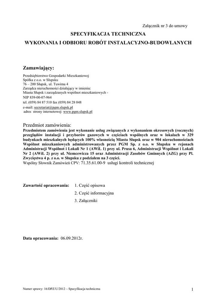 Załącznik nr 3 do umowy SPECYFIKACJA TECHNICZNA WYKONANIA I ODBIORU ROBÓT INSTALACYJNO-BUDOWLANYCH Zamawiający: Przedsiębiorstwo Gospodarki Mieszkaniowej Spółka z o.o. w Słupsku 76 – 200 Słupsk, ul. Tuwima 4 Zarządca nieruchomości działający w imieniu: Miasta Słupsk i zarządzanych wspólnot mieszkaniowych NIP 839-00-07-964 tel. (059) 84 87 510 fax (059) 84 28 048 e-mail: [email protected] adres strony internetowej: www.pgm.slupsk.pl Przedmiot zamówienia: Przedmiotem zamówienia jest wykonanie usług związanych z wykonaniem okresowych (rocznych) przeglądów instalacji i przyborów gazowych w częściach wspólnych oraz w lokalach w 329 budynkach mieszkalnych będących 100% własnością Miasta Słupsk oraz w 904 nieruchomościach Wspólnot mieszkaniowych administrowanych przez PGM Sp. z o.o. w Słupsku w rejonach Administracji Wspólnot i Lokali Nr 1 (AWiL 1) przy ul. Prusa 6, Administracji Wspólnot i Lokali Nr 2 (AWiL 2) przy ul. Niemcewicza 15 oraz Administracji Zasobów Gminnych (AZG) przy Pl. Zwycięstwa 4 p. z o.o. w Słupsku z podziałem na 3 części. Wspólny Słownik Zamówień CPV: 71.35.61.00-9 usługi kontroli technicznej Zawartość opracowania: 1. Część opisowa 2. Część informacyjna 3. Załączniki Data opracowania: 06.09.2012r. Numer sprawy: 16/DPZ/U/2012 – Specyfikacja techniczna 1 1. Część opisowa. 1.1. Przedmiot i zakres przedmiotu zamówienia. Przedmiotem zamówienia jest wykonanie usług związanych z wykonaniem okresowych (rocznych) przeglądów instalacji i przyborów gazowych w częściach wspólnych oraz w lokalach w 329 budynkach mieszkalnych będących 100% własnością Miasta Słupsk oraz w 904 nieruchomościach Wspólnot mieszkaniowych administrowanych przez PGM Sp. z o.o. w Słupsku w rejonach Administracji Wspólnot i Lokali Nr 1 (AWiL 1) przy ul. Prusa 6, Administracji Wspólnot i Lokali Nr 2 (AWiL 2) przy ul. Niemcewicza 15 oraz Administracji Zasobów Gminnych (AZG) przy Pl. Zwycięstwa 4 p. z o.o. w Słupsku z podziałem na 3 części. 1.2. Definicje - instalacja gazowa - układ przewodów gazowych w budynku, wraz z armaturą, wyposażeniem i urządzeniami gazowymi, rozpoczynający się na kurku głównym i zakończonych urządzeniami gazowymi (brzmienie definicji z normy PN-M-34507; definicja instalacji gazowej podana w rozporządzeniu w sprawie warunków technicznych dla budynków nieco się różni - na przykład do instalacji gazowej wlicza się dodatkowo przewody odprowadzające spaliny z urządzeń gazowych; proszę się z tym zapoznać), - urządzenie gazowe - urządzenie spalające paliwo gazowe, - armatura odcinająca - urządzenie, które jest przeznaczone do zamykania przepływu paliwa gazowego w przewodzie gazowym, - kurek główny - armatura odcinająca przeznaczona do odcinania dopływu paliwa gazowego do instalacji gazowej(dodam od siebie, że ważne jest też to, że kurek główny stanowi granicę własności pomiędzy dostawcą gazu i odbiorcą; dodam również, że w zależności od ciśnienia gazu i tzw. mocy umownej, ten kurek główny może być usytuowany w różnych miejscach - czasem przed, a czasem za reduktorem) - gazomierz - przyrząd służący do pomiaru objętości paliwa gazowego albo ilości zawartej w nim energii, - złącze izolujące - element przeznaczony do eklektycznego izolowania połączonych ze sobą odcinków przewodów gazowych, - osoba kompetentna - osoba, która została przeszkolona, mająca doświadczenie i odpowiednie uprawnienia do przeprowadzania czynności związanych z przewodami gazowymi, urządzeniami gazowymi i złączem izolującym, - dolna granica wybuchowości (DGW) - najniższe stężenie paliwa gazowego w powietrzu, powyżej którego mieszanka palna pod wpływem czynnika inicjującego zapłon ulega spalaniu wybuchowemu (nadmienię, że dla gazu ziemnego DGW wynosi około 5 %), - górna granica wybuchowości (GGW) - najwyższe stężenie paliwa gazowego w powietrzu, poniżej którego mieszanka palna pod wpływem czynnika inicjującego zapłon ulega spaleniu wybuchowemu (tej definicji nie znajdziecie we wspomnianej wcześniej normie, więc dorzucam ją od siebie w promocji, oczywiście gratis; wspomnę, że dla gazu ziemnego GGW wynosi około 15 %) Numer sprawy: 16/DPZ/U/2012 – Specyfikacja techniczna 2 1.3. Wytyczne dotyczące wykonania i organizacji robót: 1) Przegląd oraz kontrolę szczelności instalacji i urządzeń gazowych należy prowadzić zgodnie z obowiązującymi przepisami, normami, warunkami technicznymi pod stałym nadzorem technicznym z zachowaniem obowiązujących przepisów BHP i ppoż. 2) O kontroli i jej terminie należy powiadomić mieszkańców kontrolowanych budynków z odpowiednim wyprzedzeniem 3) Przed przystąpieniem do kontroli należy zapoznać się z dokumentami i zaleceniami sporządzonymi w wyniku poprzedniej kontroli oraz informacjami zawartymi w dokumentacji techniczno-eksploatacyjnej instalacji gazowej jeśli tak jest w posiadaniu Zamawiającego, 4) W przypadku przebiegu instalacji gazowej w bruzdach ściennych zakrytych tynkiem należy zażądać od właściciela lub zarządcy budynku schematu rozmieszczenia przewodów gazowych, w celu dokładnego zlokalizowania instalacji gazowej. 5) Prace należy wykonywać zgonie z aktualnymi aktami prawnymi a w szczególności: Ustawą Prawo Budowlane (z dnia 07 lipca 1994r.) i odpowiednimi rozporządzeniami do Ustawy. Rozporządzeniem Ministra Infrastruktury (z dnia 12 kwietnia 2002r.) w sprawie warunków technicznych, jakim powinny odpowiadać budynki i ich usytuowanie. Rozporządzeniem Ministra Spraw Wewnętrznych i Administracji ( z dnia 16 sierpnia 1999r.) w sprawie warunków technicznych użytkowania budynków mieszkalnych. Rozporządzeniem Ministra Spraw Wewnętrznych (z dnia 21 kwietnia 2006r.) w sprawie ochrony przeciwpożarowej budynków, innych obiektów budowlanych i terenów. Rozporządzeniem Ministra Budownictwa w sprawie bezpieczeństwa i higieny pracy przy wykonywaniu robó